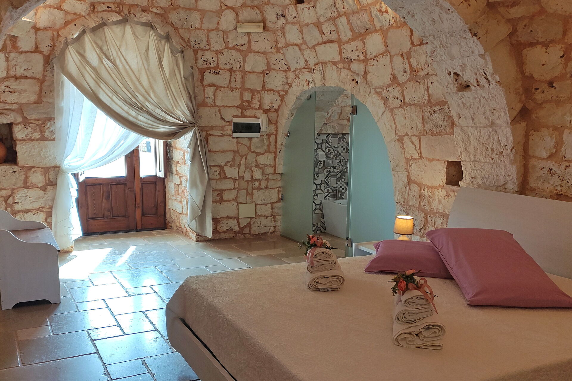 Den Gästen dieses einzigartigen Trullo steht zur Verfügung: 3 Schlafzimmer und 2 Bäder für 6/7 Personen. Ausgestatteter und eingezäunter Garten. Klimaanlage in jedem Schlafzimmer und in den Wohnzimmern. Privates Schwimmbad zum exklusiven Gebrauch der Gäste. Aussendusche neben dem Schwimmbad, Überdachte und ausgestattete Terrasse mit Tisch, Stühlen, TV, Barbecue und Holzofen. Internetzugang (W-LAN) gratis. Parkplatz