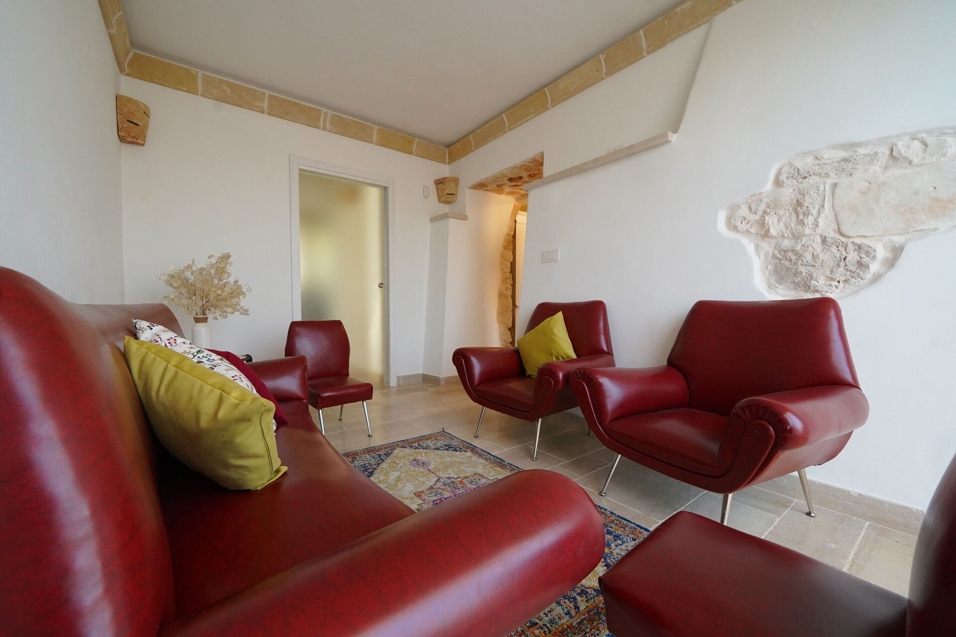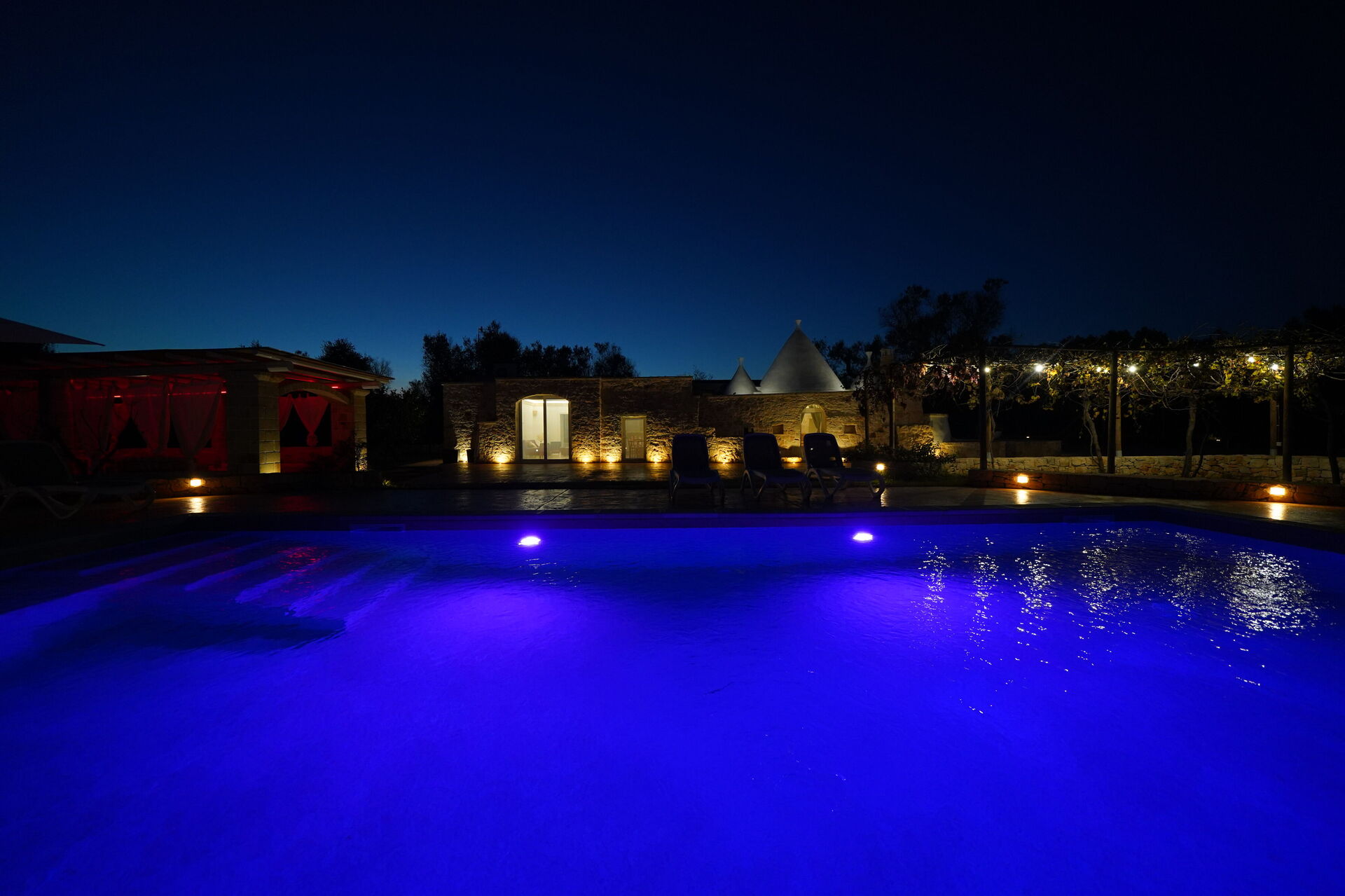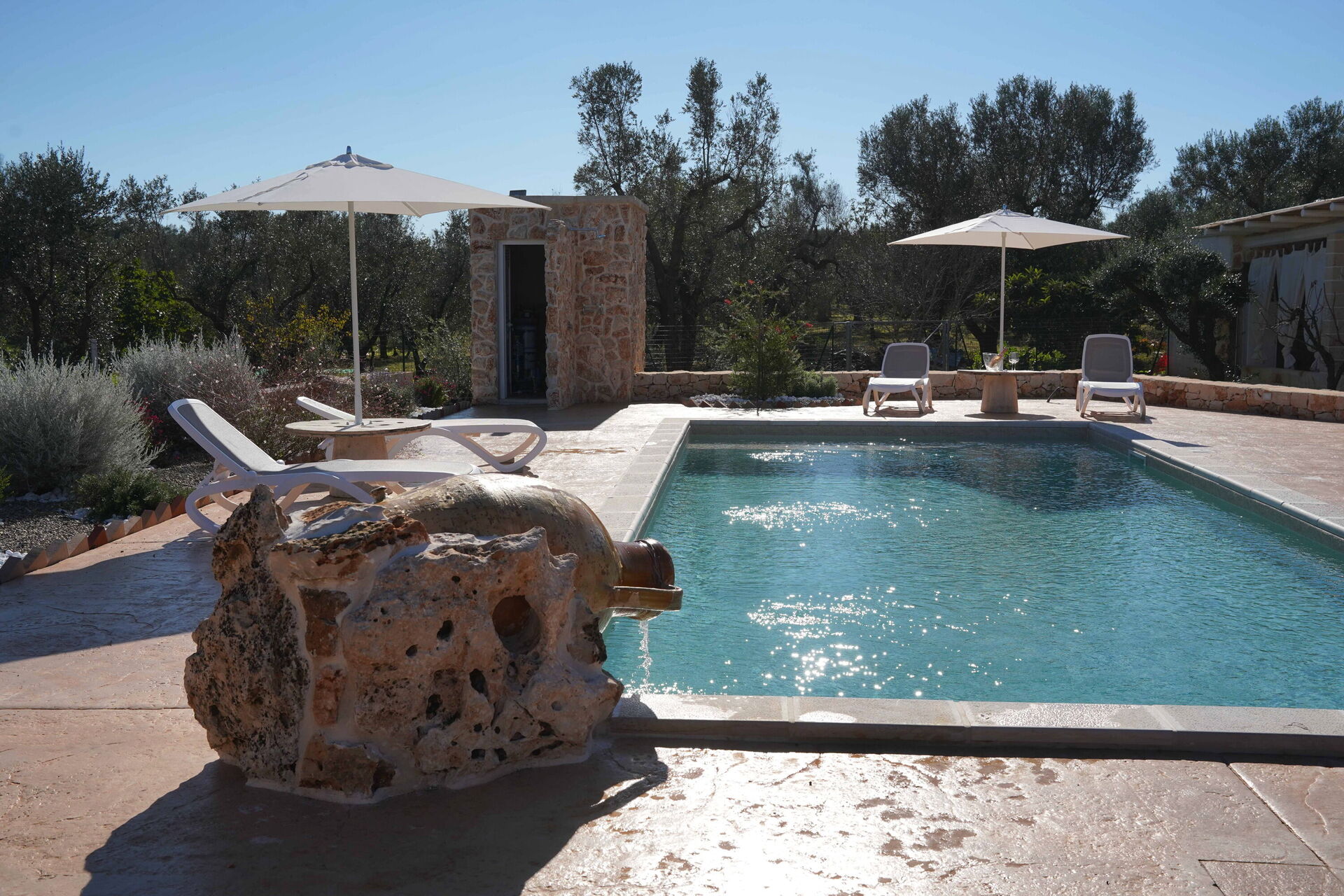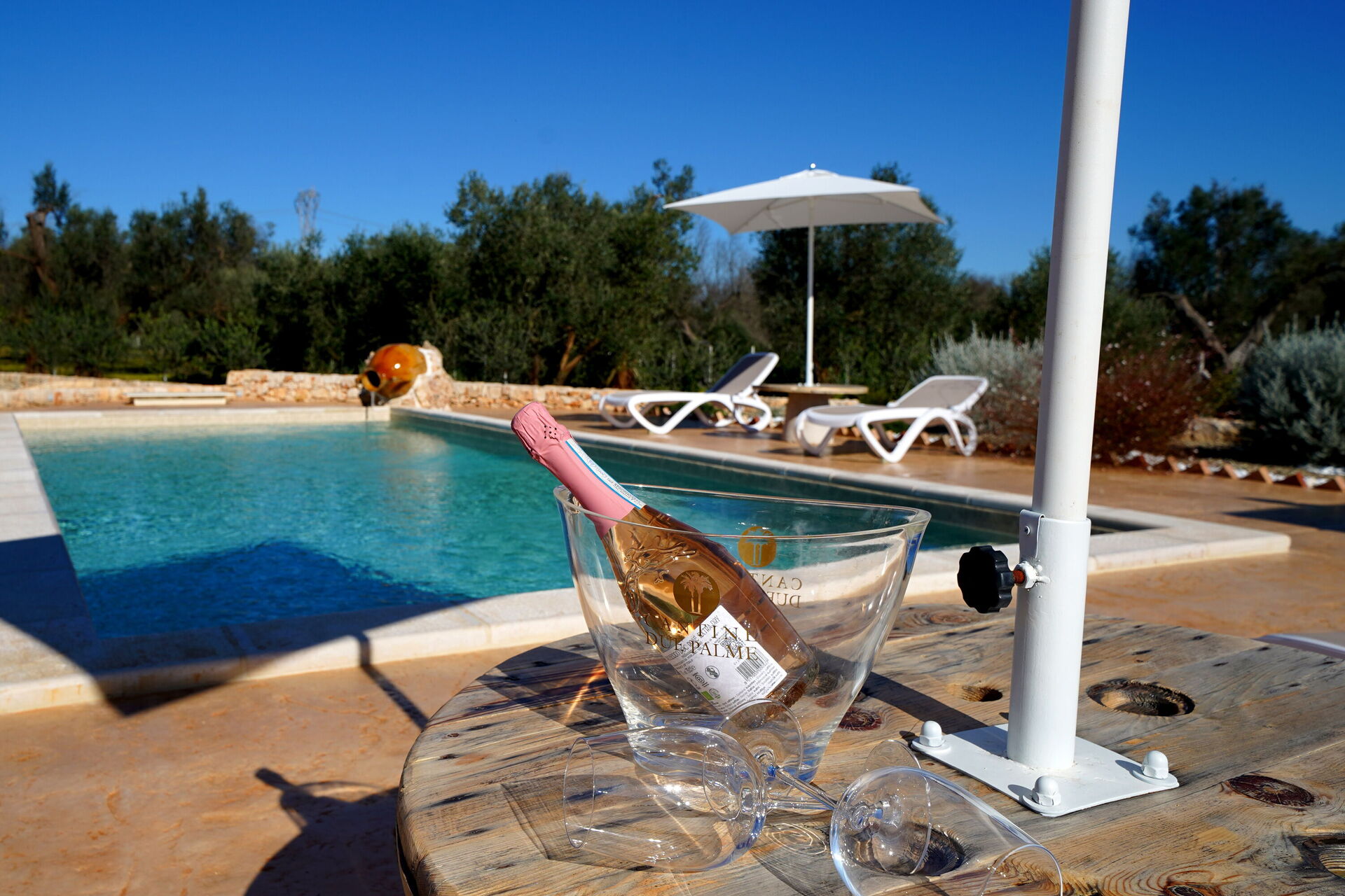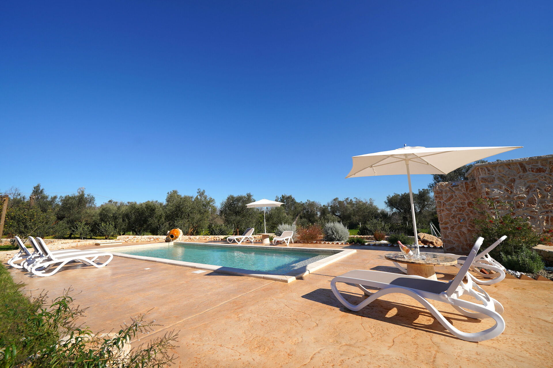 La grande piscine privée est entourée d’un solarium équipé de chaises longues: c’est l’endroit idéal pour passer de longues journées d’été sous le soleil du Salento, en se relaxant et en se rafraîchissant en compagnie d’amis et de la famille.