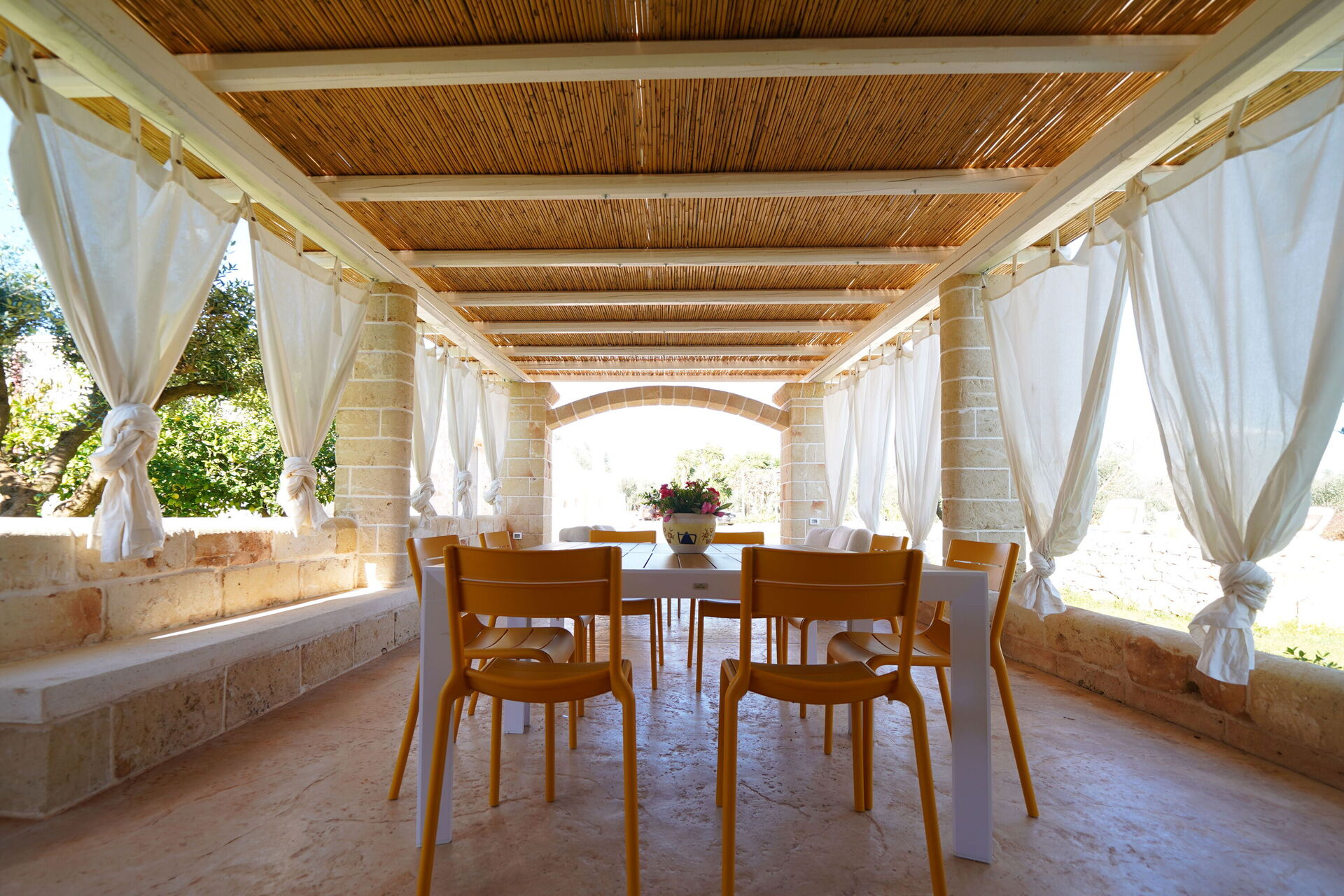 Une belle véranda équipée avec table, chaises et barbecue est à la disposition des hôtes: vous pourrez y organiser des grillades, manger en plein air, admirer le splendide paysage rural qui entoure la propriété et profiter de la vue panoramique sur la campagne des Pouilles.