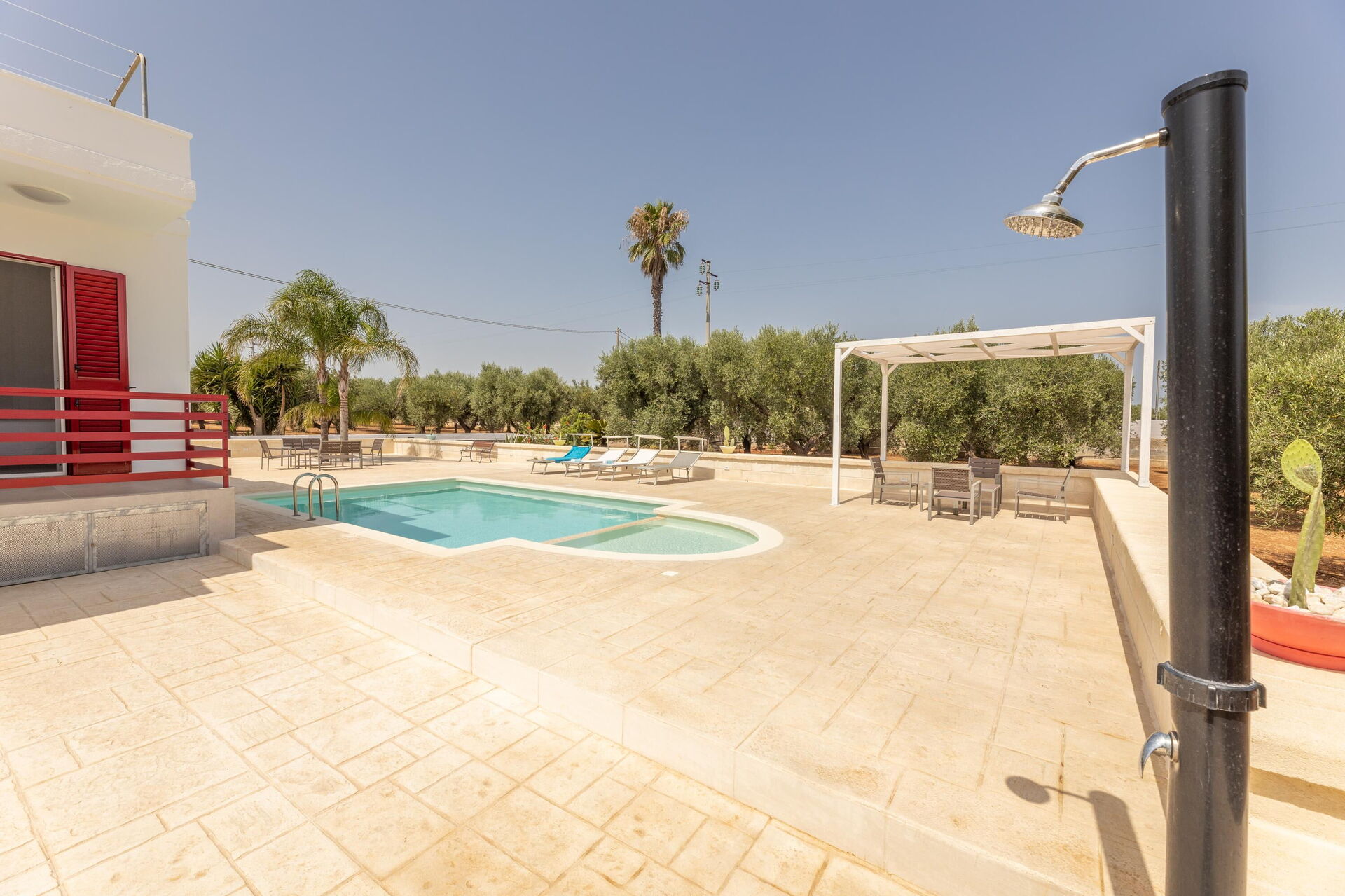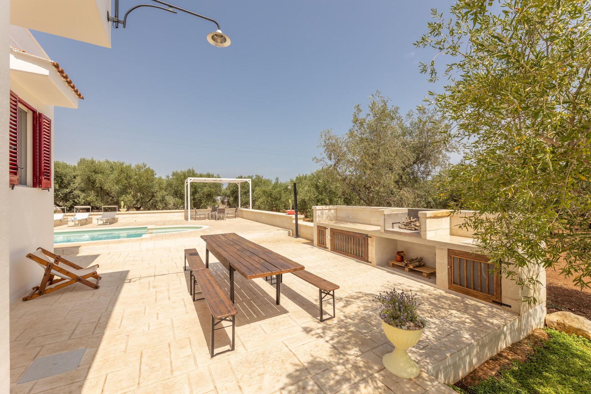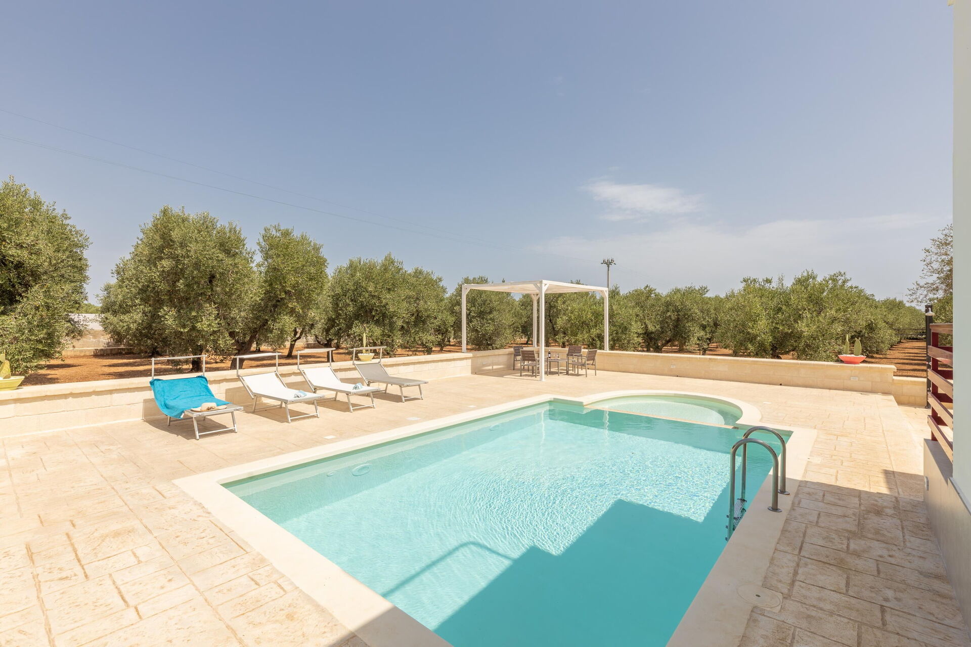 Les espaces extérieurs panoramiques offrent de nombreuses zones équipées permettant aux hôtes de profiter d'un séjour agréable en famille ou entre amis: il sera possible de profiter de repas en plein air tout en admirant une vue fantastique sur les oliviers ou de se détendre au bord de la piscine ou dans l’espace solarium. Un jardin avec des oliviers centenaires et des plantes méditerranéennes typiques est également à votre disposition.