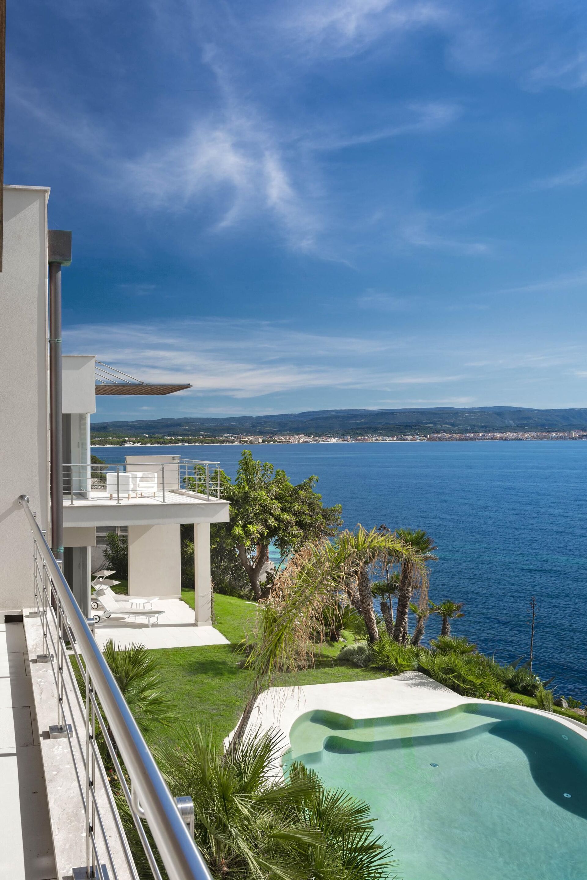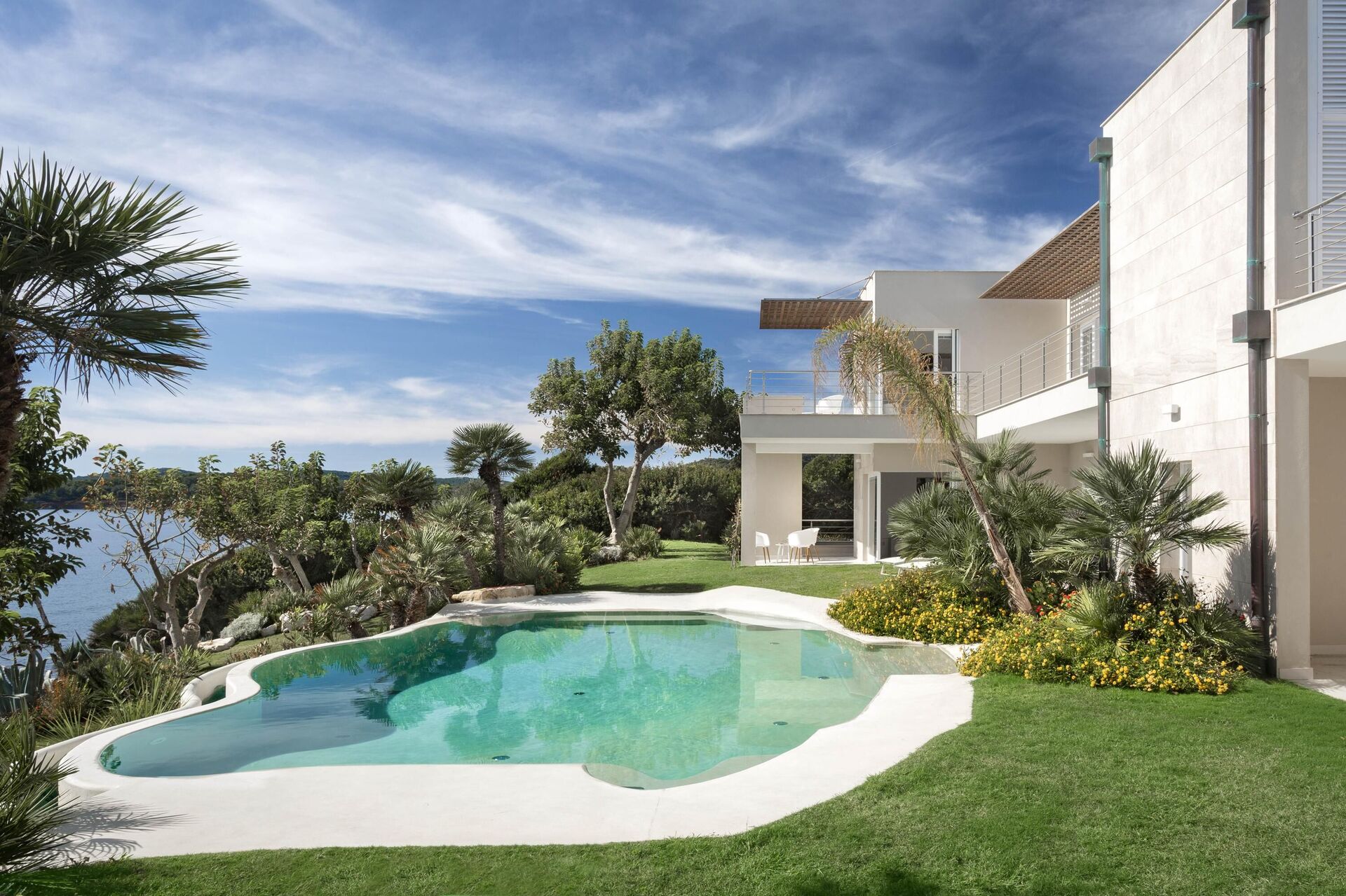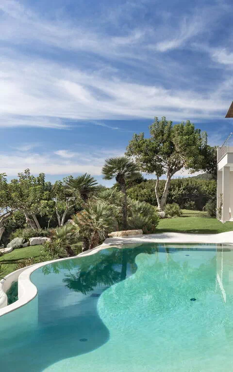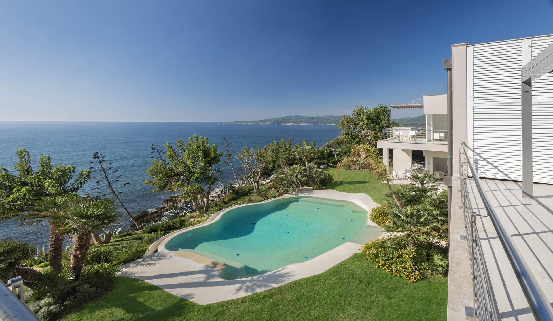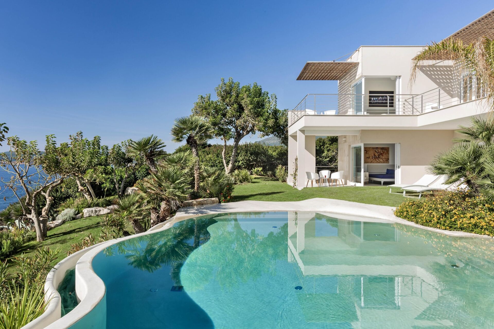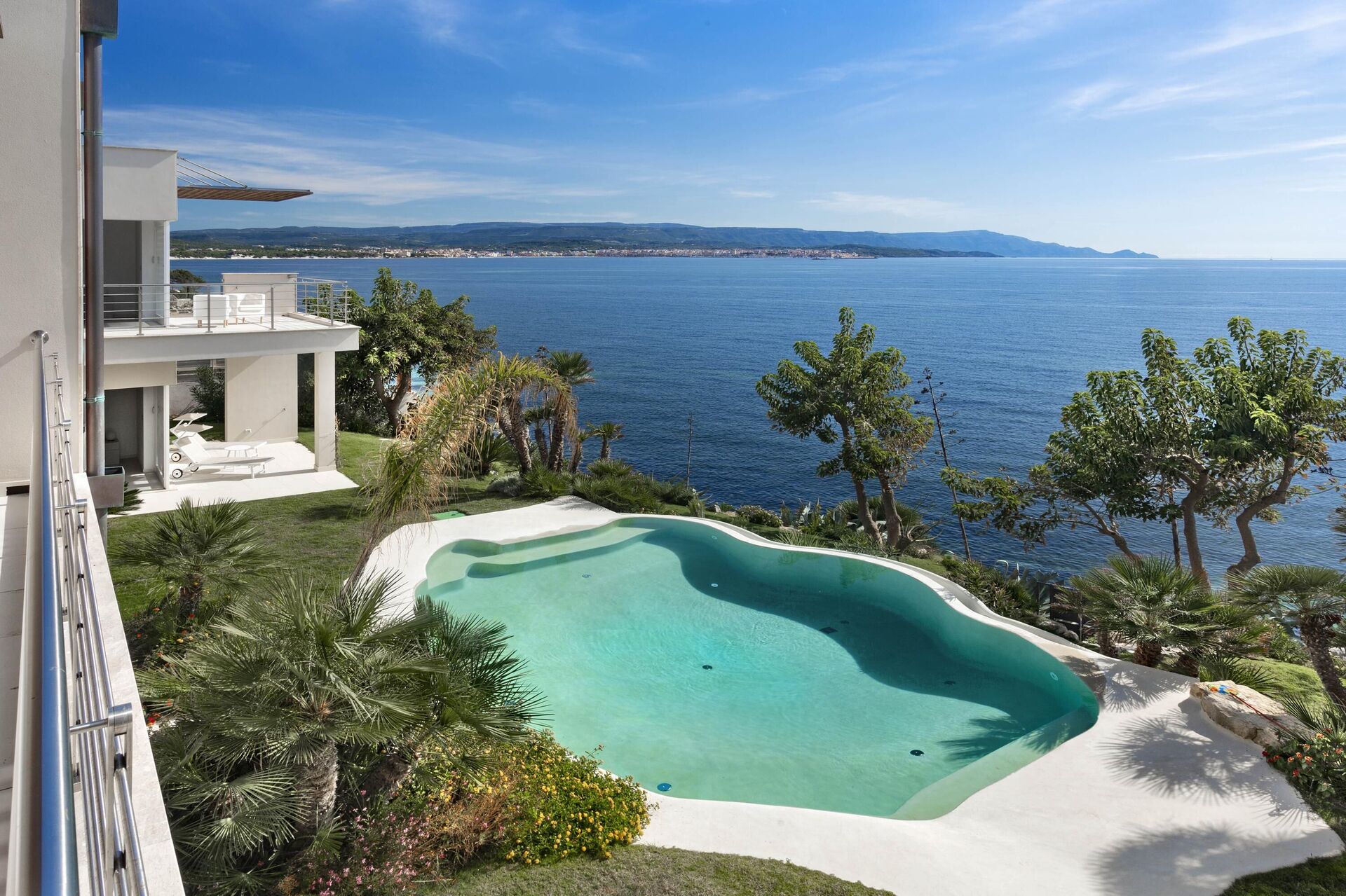 La splendide villa à louer dispose de 8 chambres, pouvant ainsi accueillir jusqu’à 16 personnes, et est répartie sur deux étages. Les intérieurs sont modernes et équipés de tous conforts. Une élégante terrasse longe tout un côté du premier étage, elle dispose également d’une grande pergola avec un espace pour les repas en extérieur. Dans le grand jardin qui entoure toute la propriété, il y a une piscine privée à usage exclusif des hôtes, celle-ci surplombant la mer, vous offrant ainsi la possibilité d’admirer des couchers de soleil fantastiques. Divers espaces de détente sont situés autour de la piscine et de la structure.