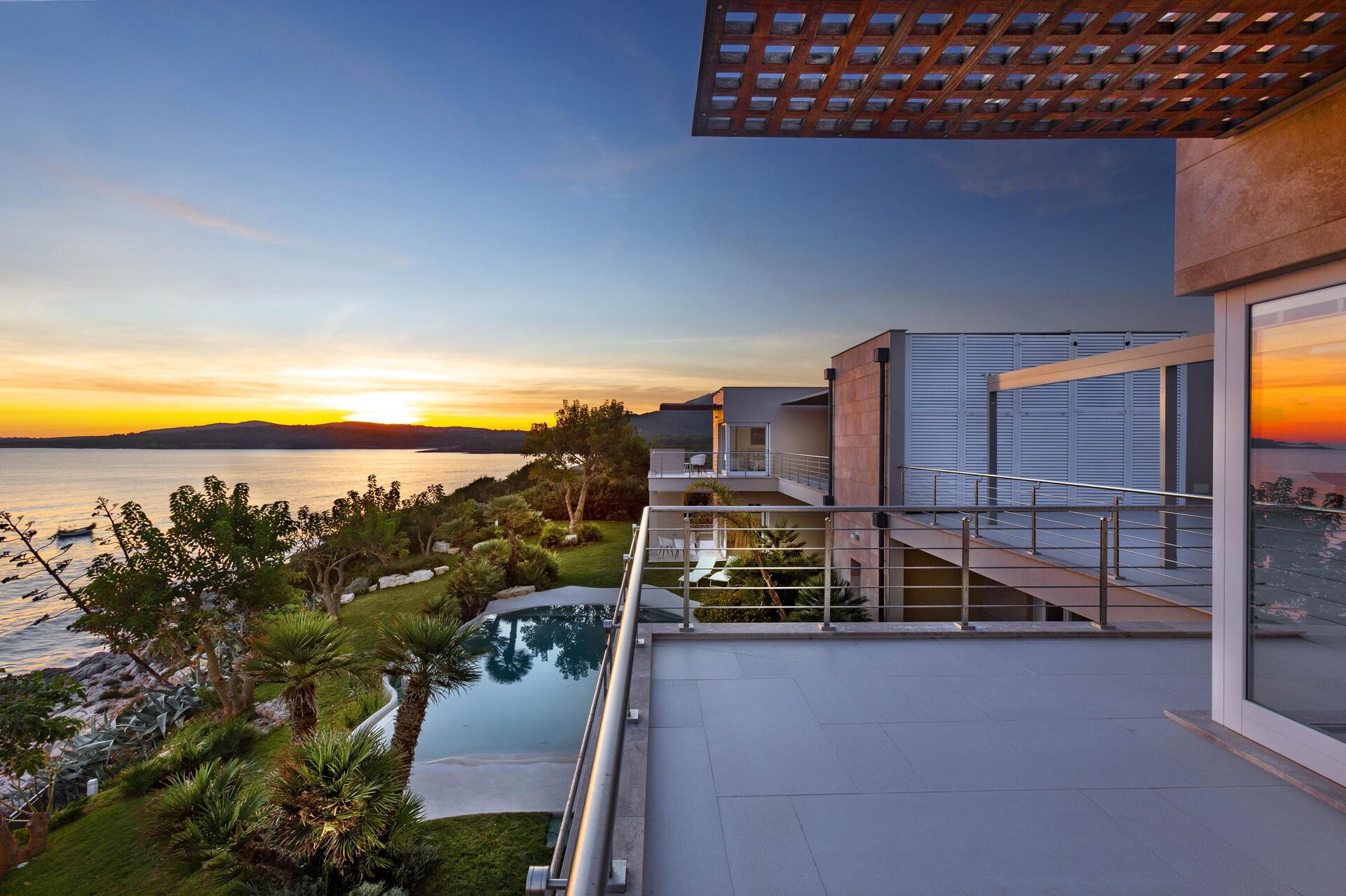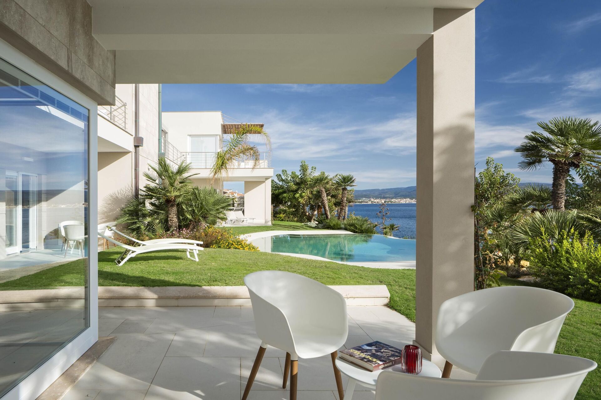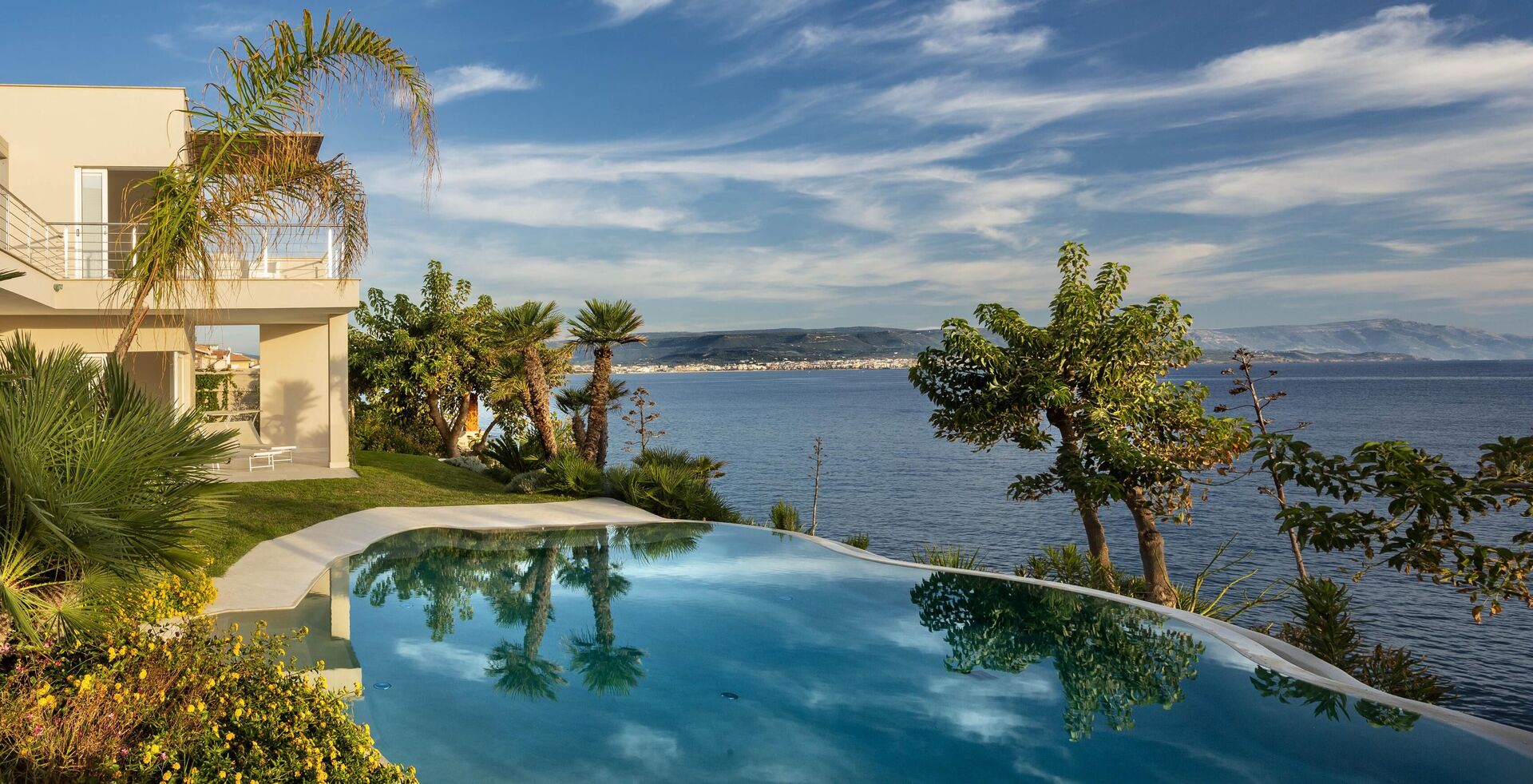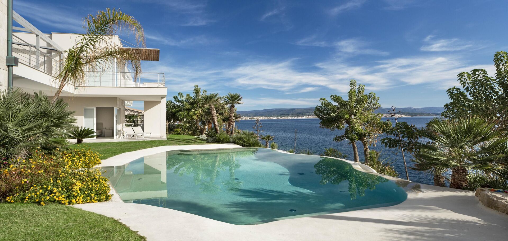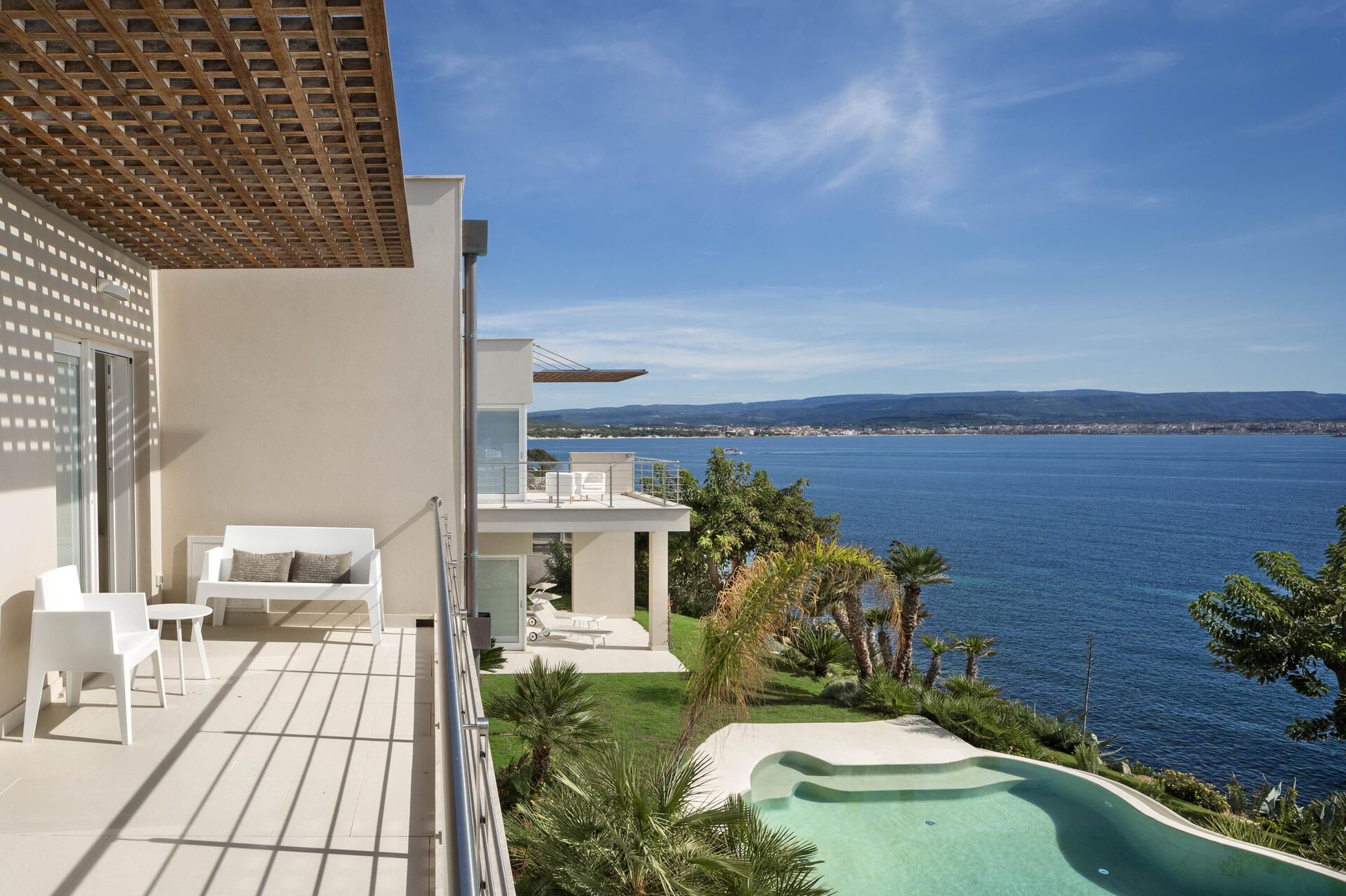 La splendide villa à louer dispose de 8 chambres, pouvant ainsi accueillir jusqu’à 16 personnes, et est répartie sur deux étages. Les intérieurs sont modernes et équipés de tous conforts. Une élégante terrasse longe tout un côté du premier étage, elle dispose également d’une grande pergola avec un espace pour les repas en extérieur. Dans le grand jardin qui entoure toute la propriété, il y a une piscine privée à usage exclusif des hôtes, celle-ci surplombant la mer, vous offrant ainsi la possibilité d’admirer des couchers de soleil fantastiques. Divers espaces de détente sont situés autour de la piscine et de la structure.