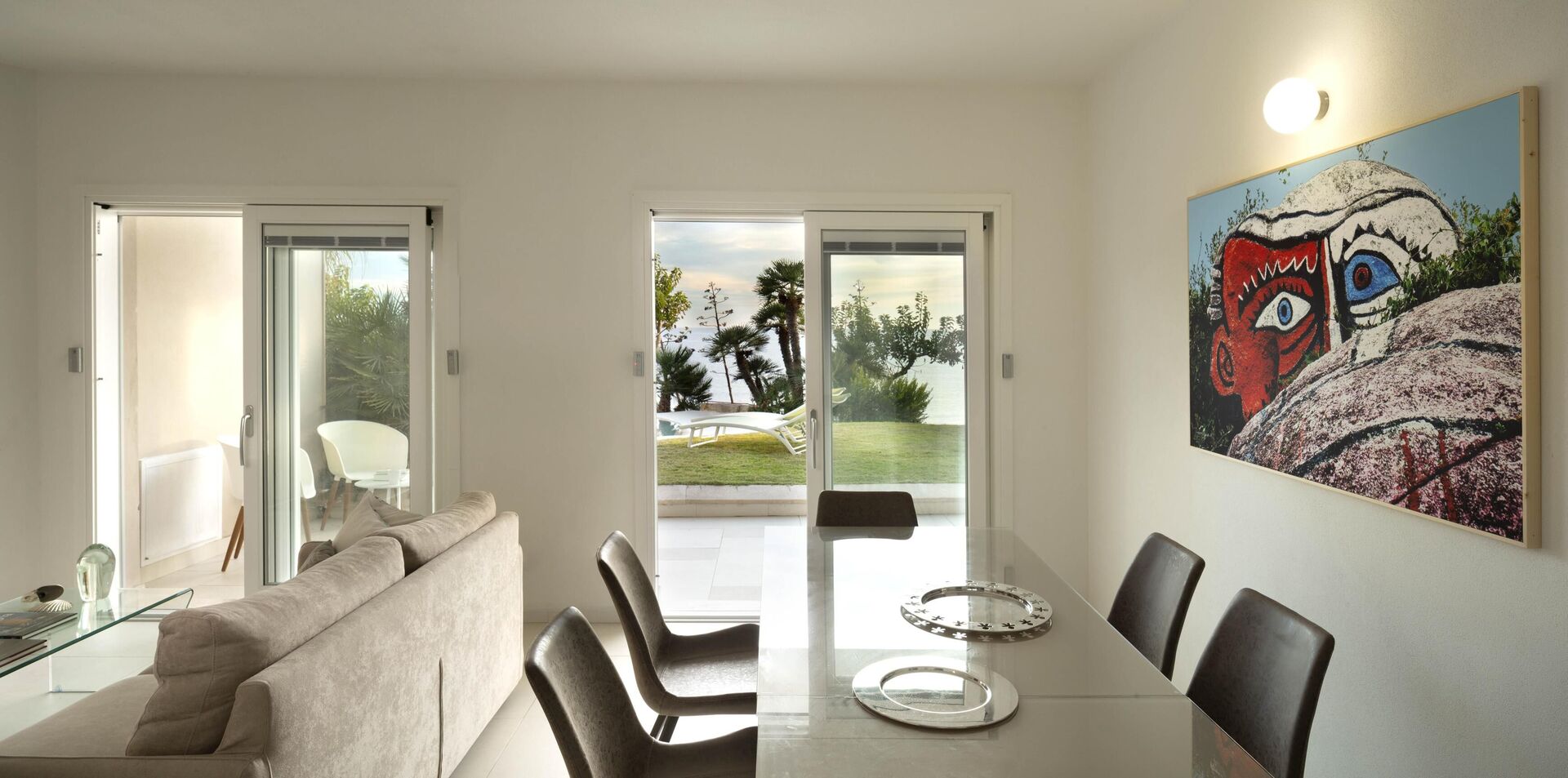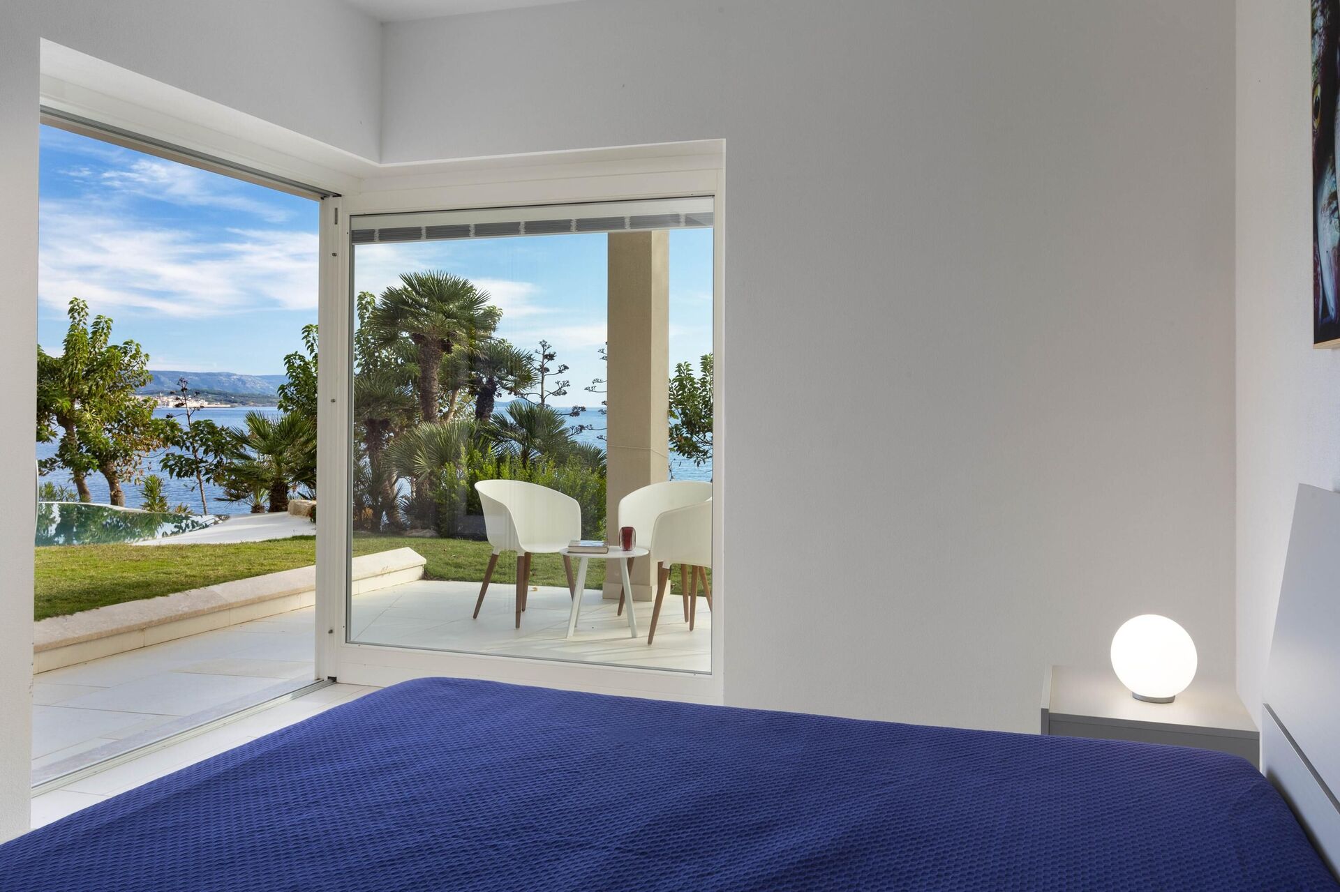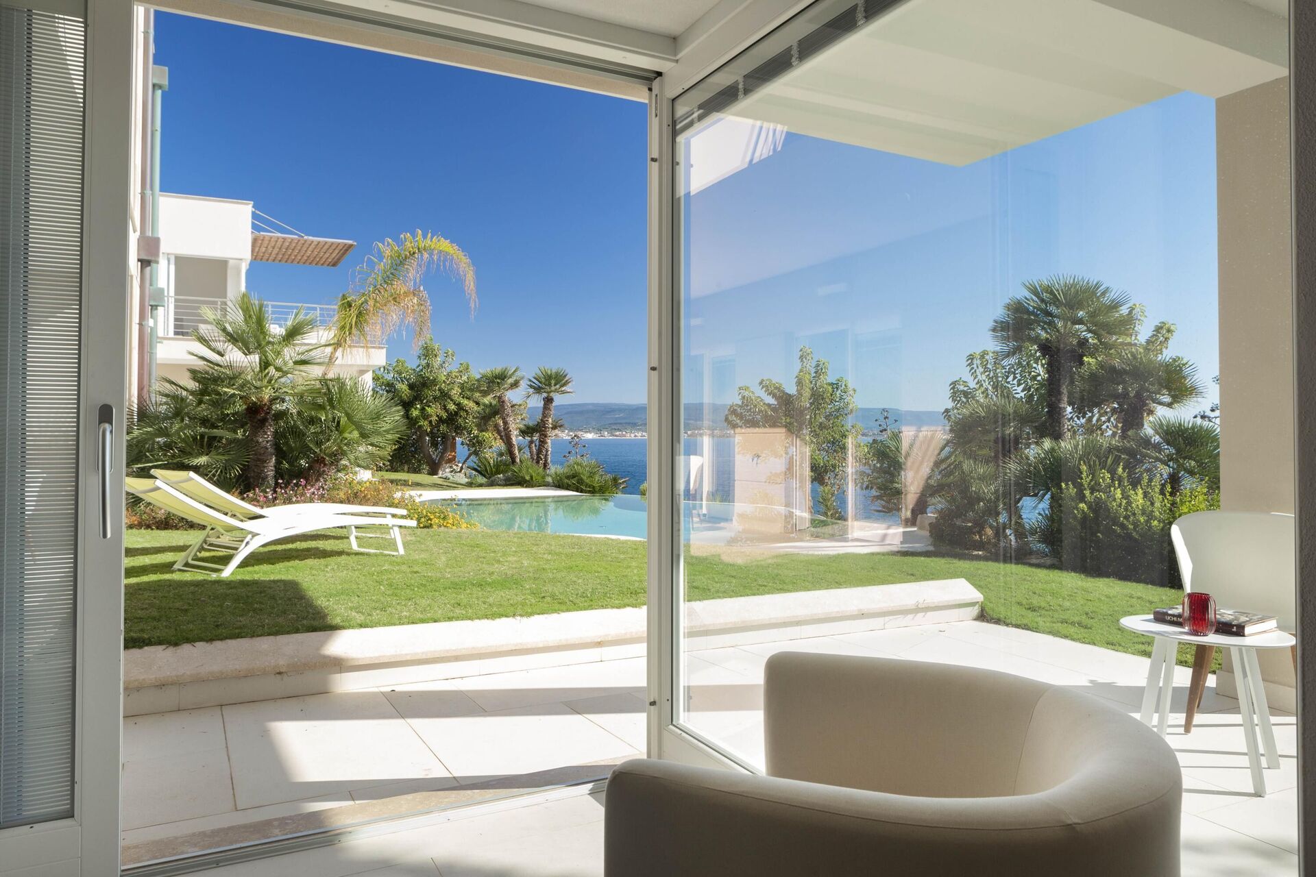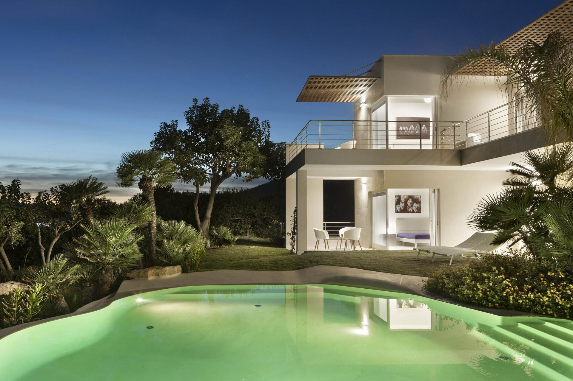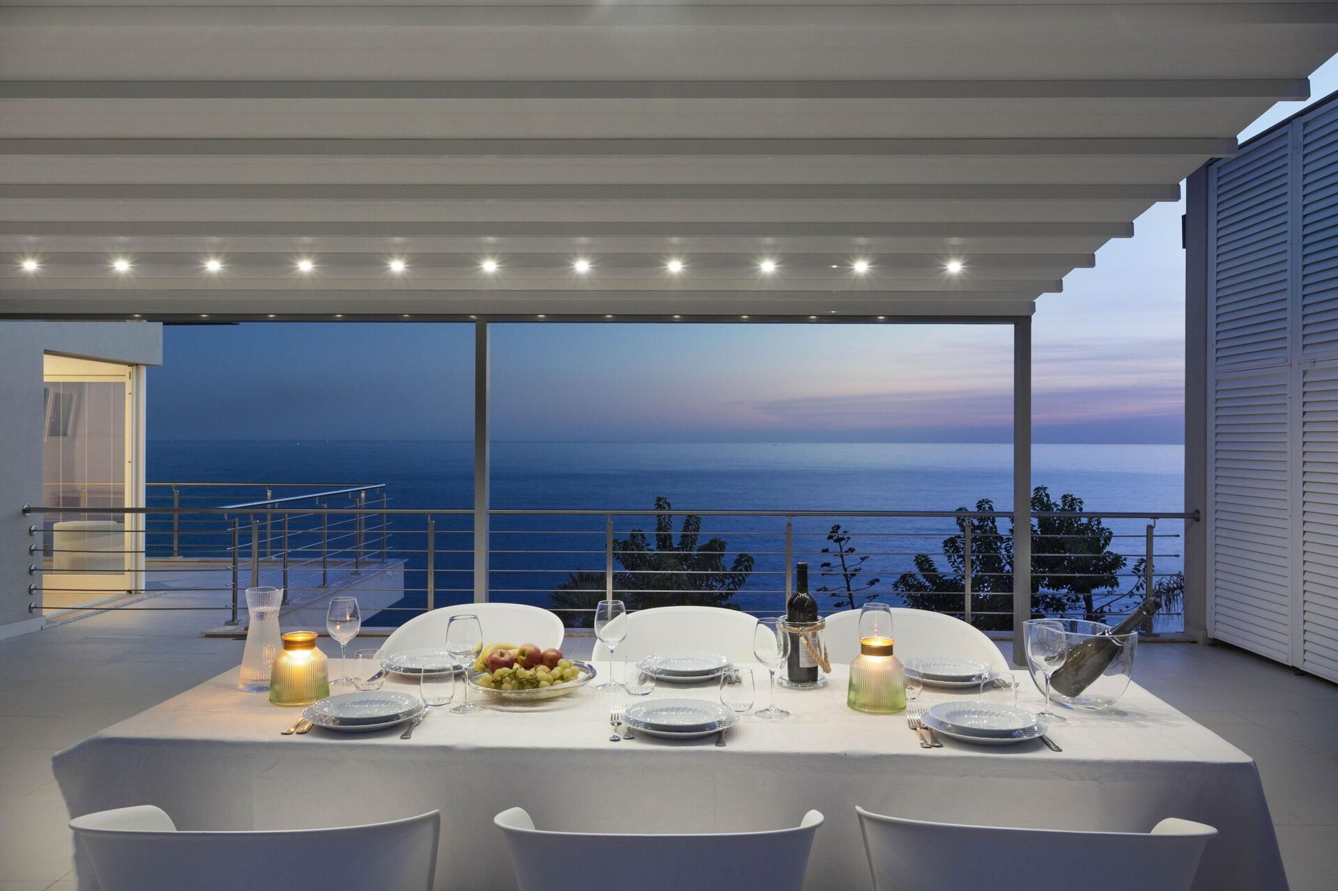 La splendide villa à louer dispose de 8 chambres, pouvant ainsi accueillir jusqu’à 16 personnes, et est répartie sur deux étages. Les intérieurs sont modernes et équipés de tous conforts. Une élégante terrasse longe tout un côté du premier étage, elle dispose également d’une grande pergola avec un espace pour les repas en extérieur. Dans le grand jardin qui entoure toute la propriété, il y a une piscine privée à usage exclusif des hôtes, celle-ci surplombant la mer, vous offrant ainsi la possibilité d’admirer des couchers de soleil fantastiques. Divers espaces de détente sont situés autour de la piscine et de la structure.