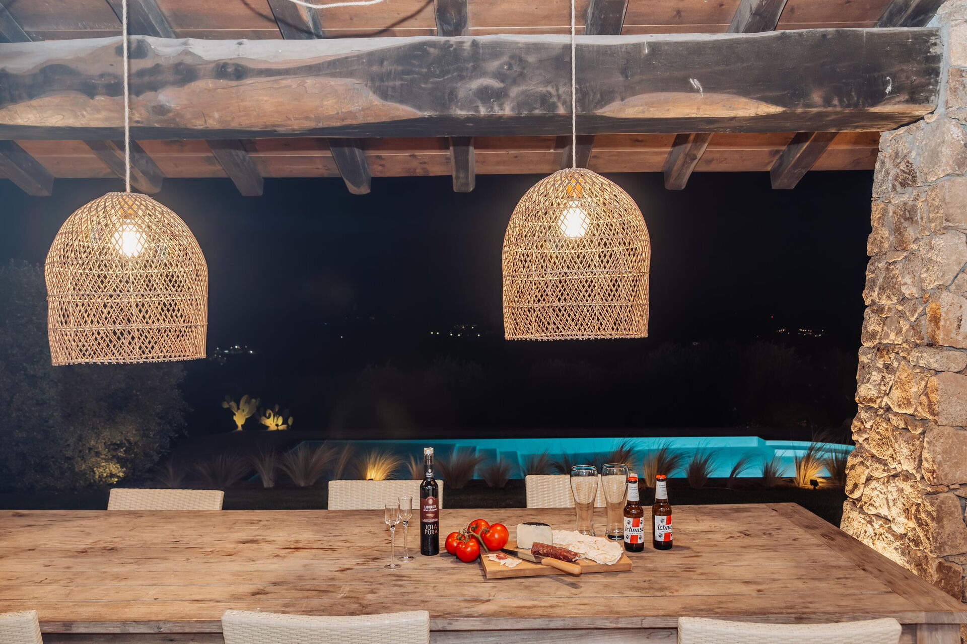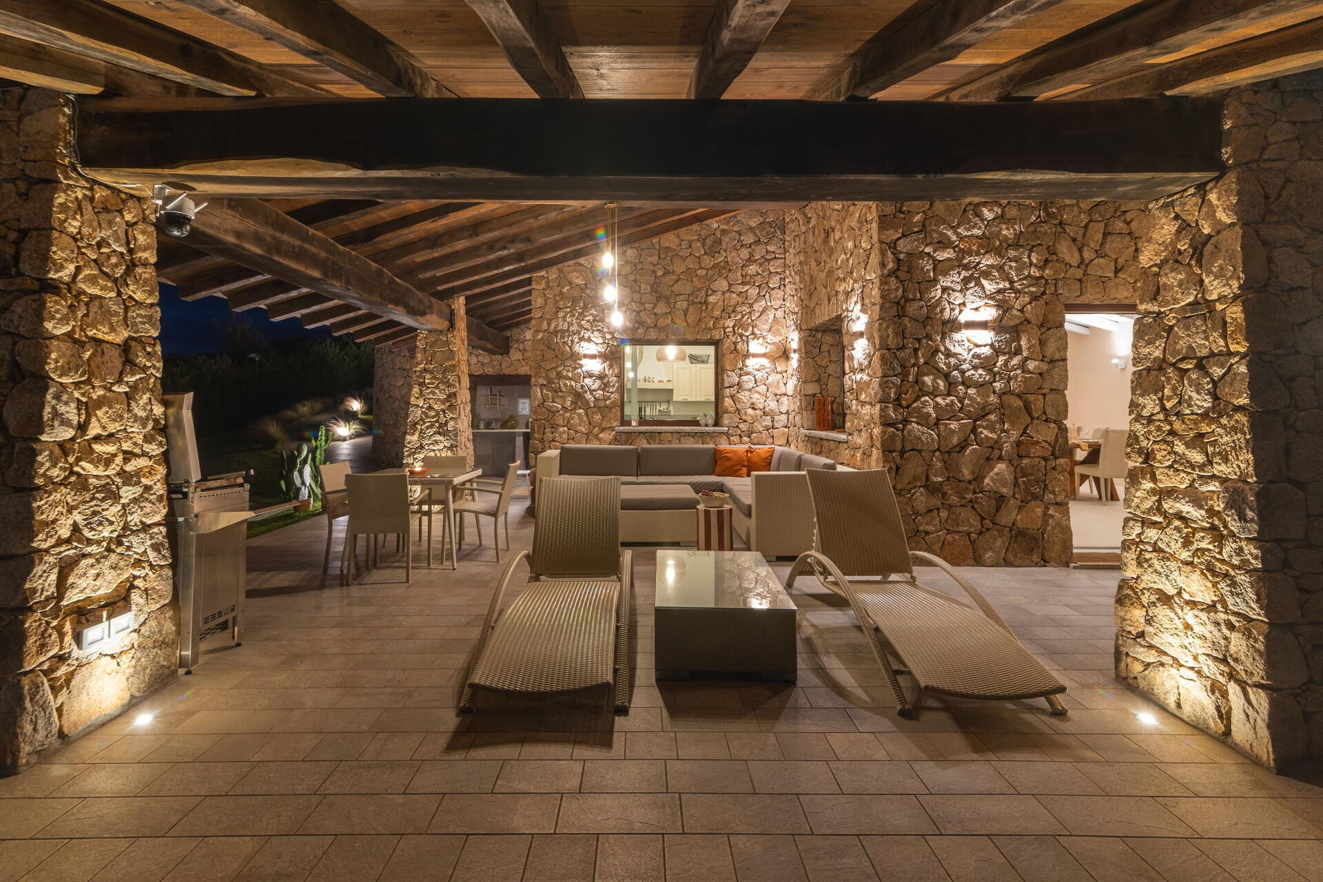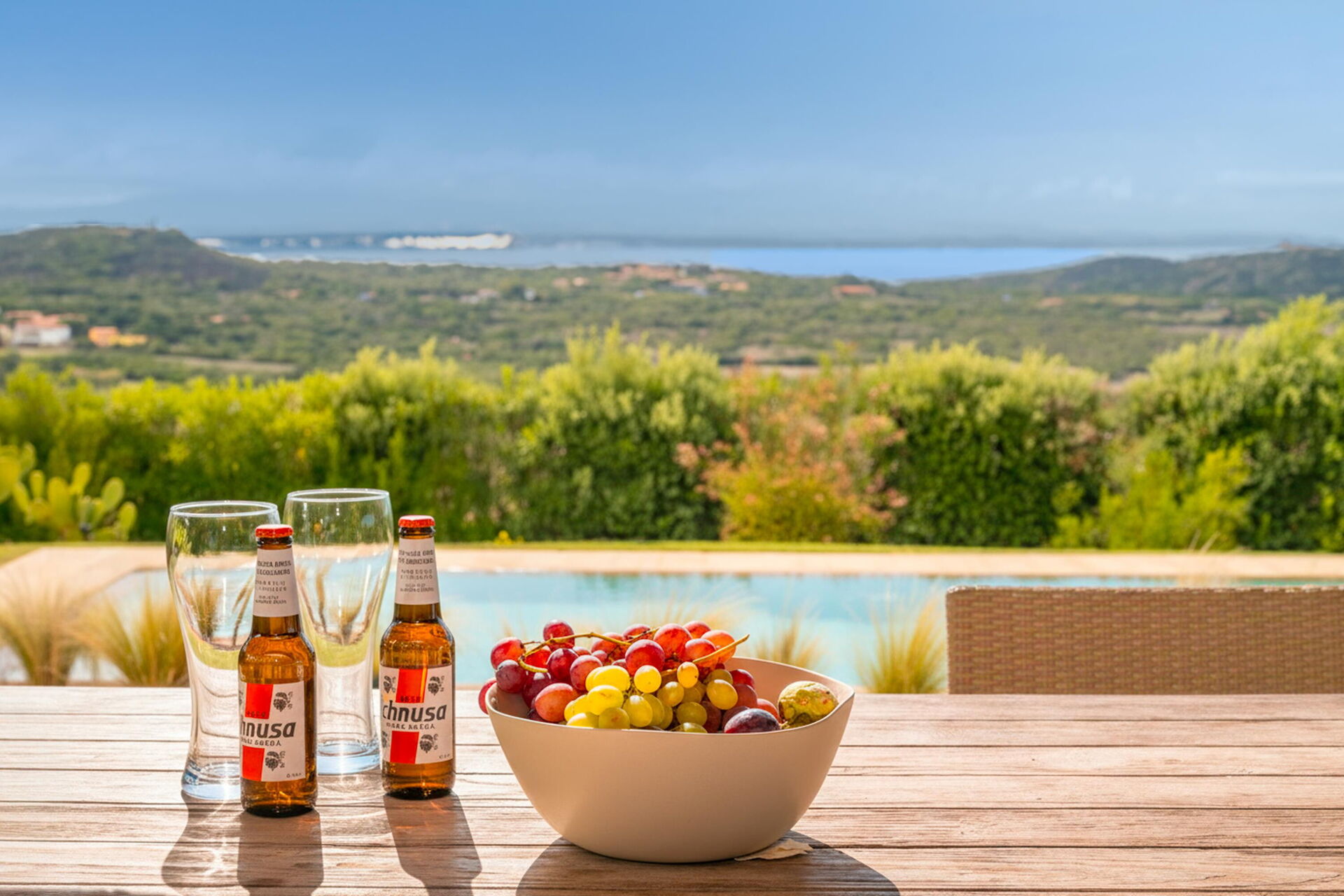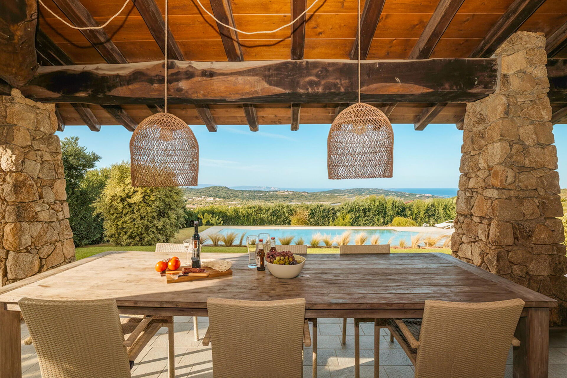 Les espaces extérieurs panoramiques offrent de nombreuses zones permettant aux hôtes de passer un agréable séjour en famille ou entre amis en se détendant dans la véranda aménagée pour manger en plein air ou dans la grande zone piscine avec vue sur la mer, idéale pour vivre des moments inoubliables sous le soleil de la Sardaigne.