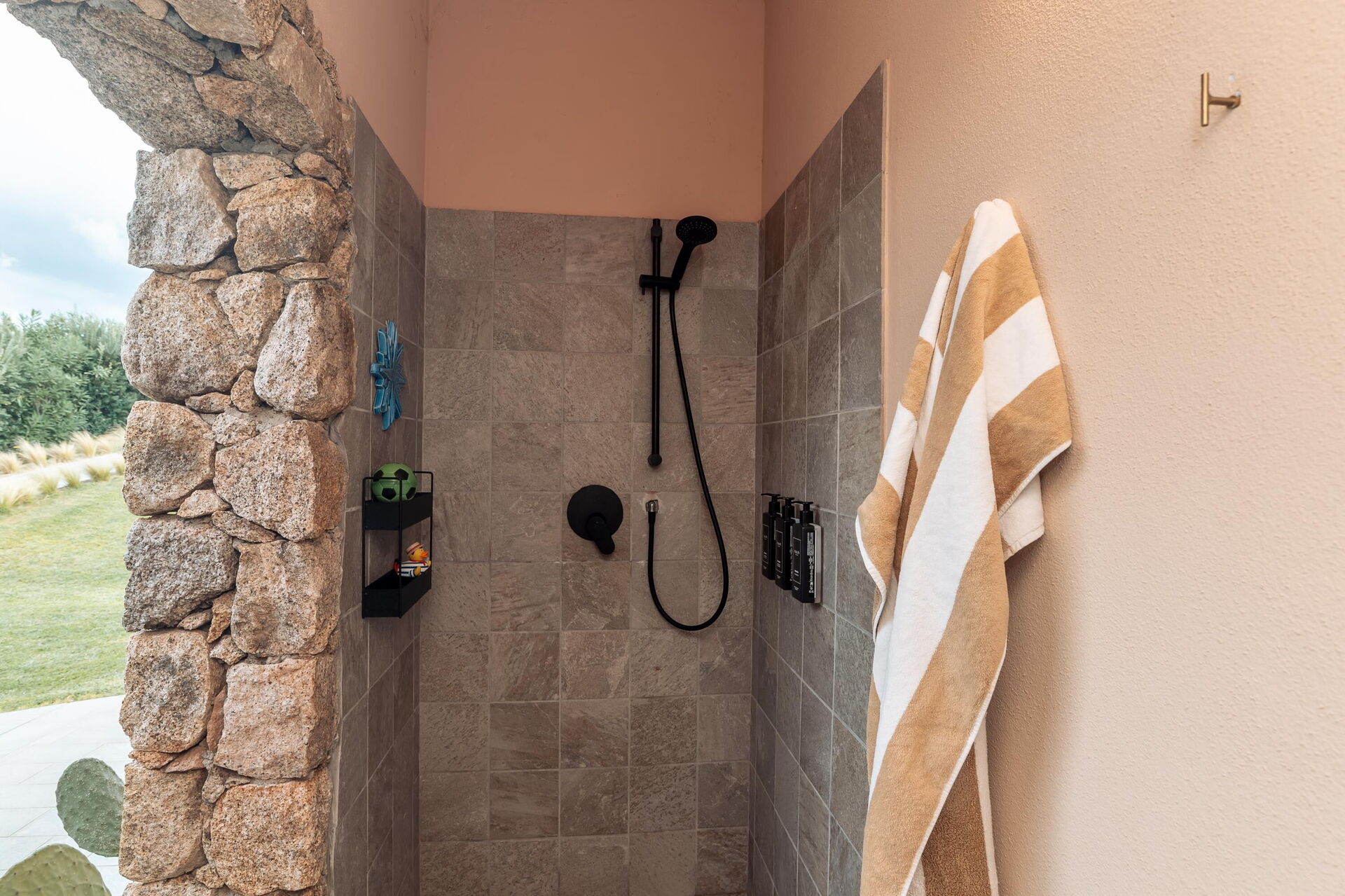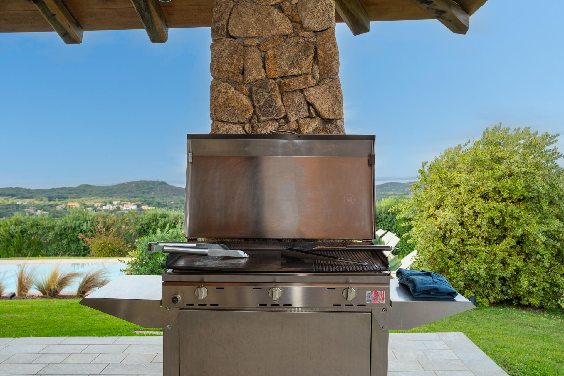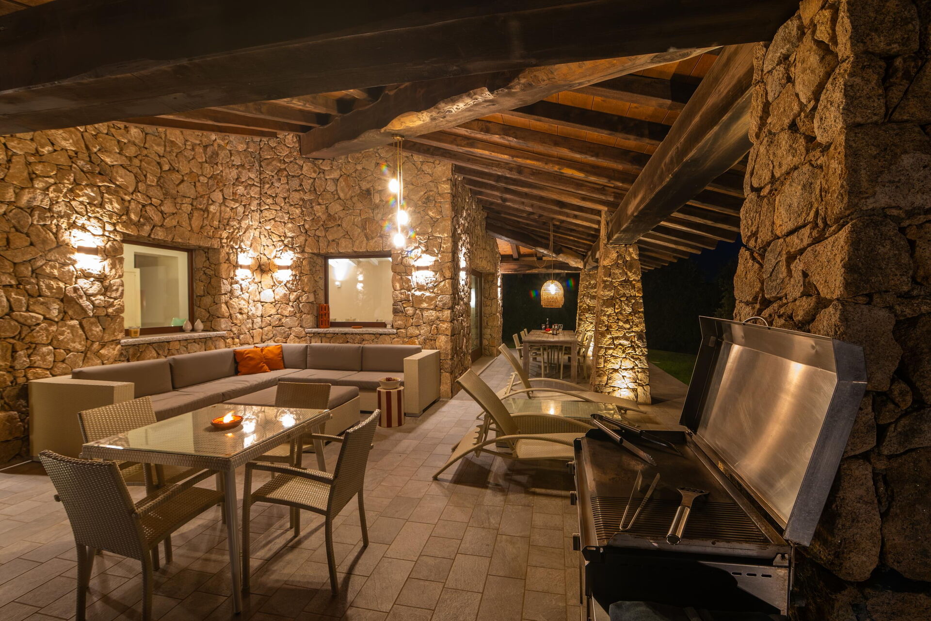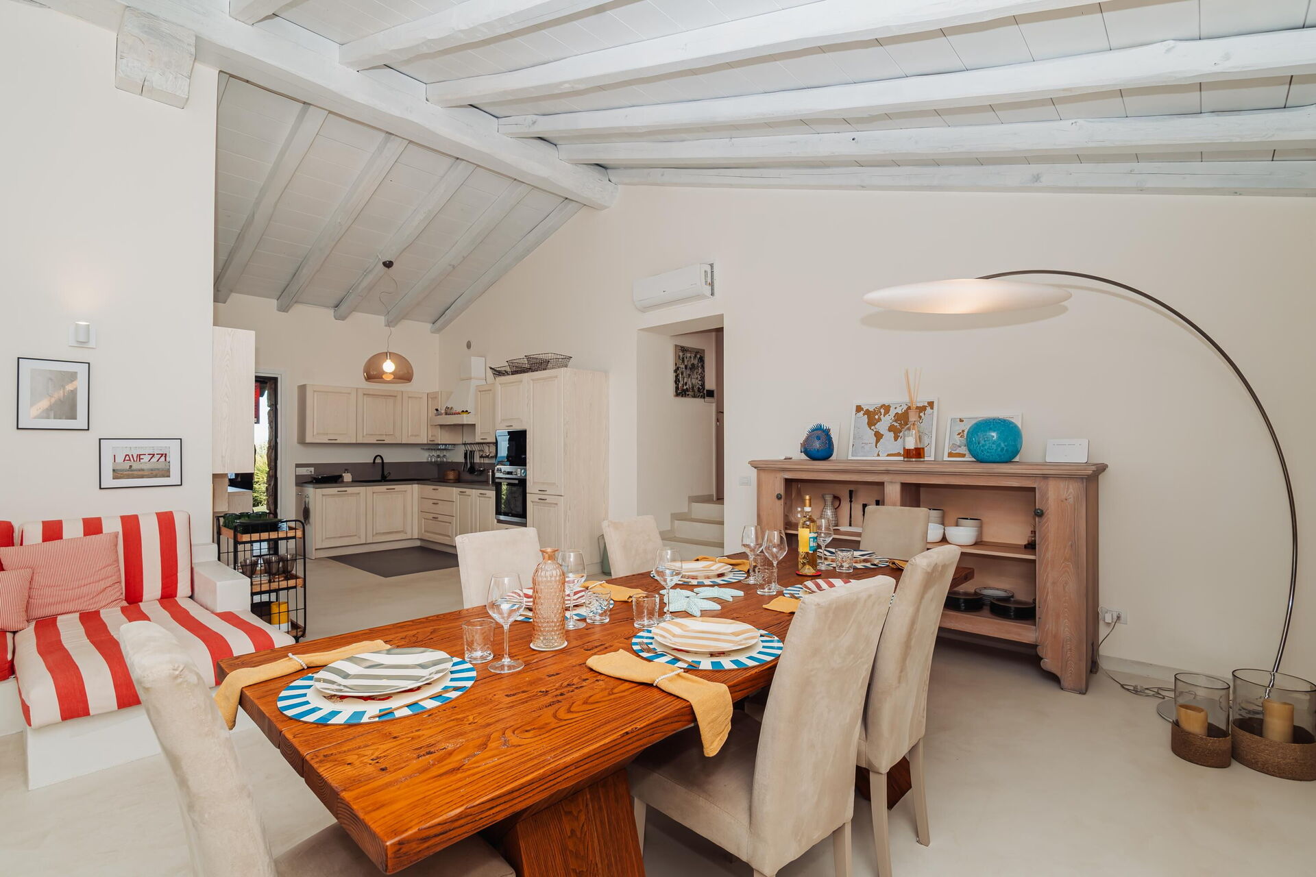Les espaces extérieurs panoramiques offrent de nombreuses zones permettant aux hôtes de passer un agréable séjour en famille ou entre amis en se détendant dans la véranda aménagée pour manger en plein air ou dans la grande zone piscine avec vue sur la mer, idéale pour vivre des moments inoubliables sous le soleil de la Sardaigne.