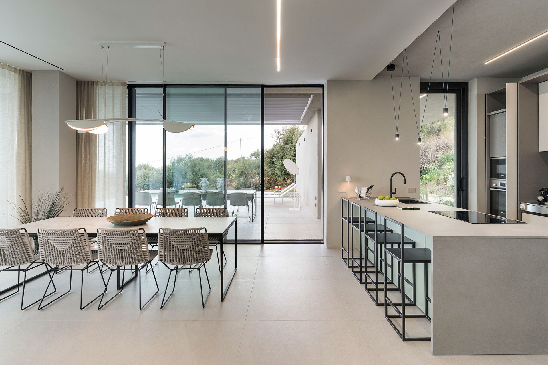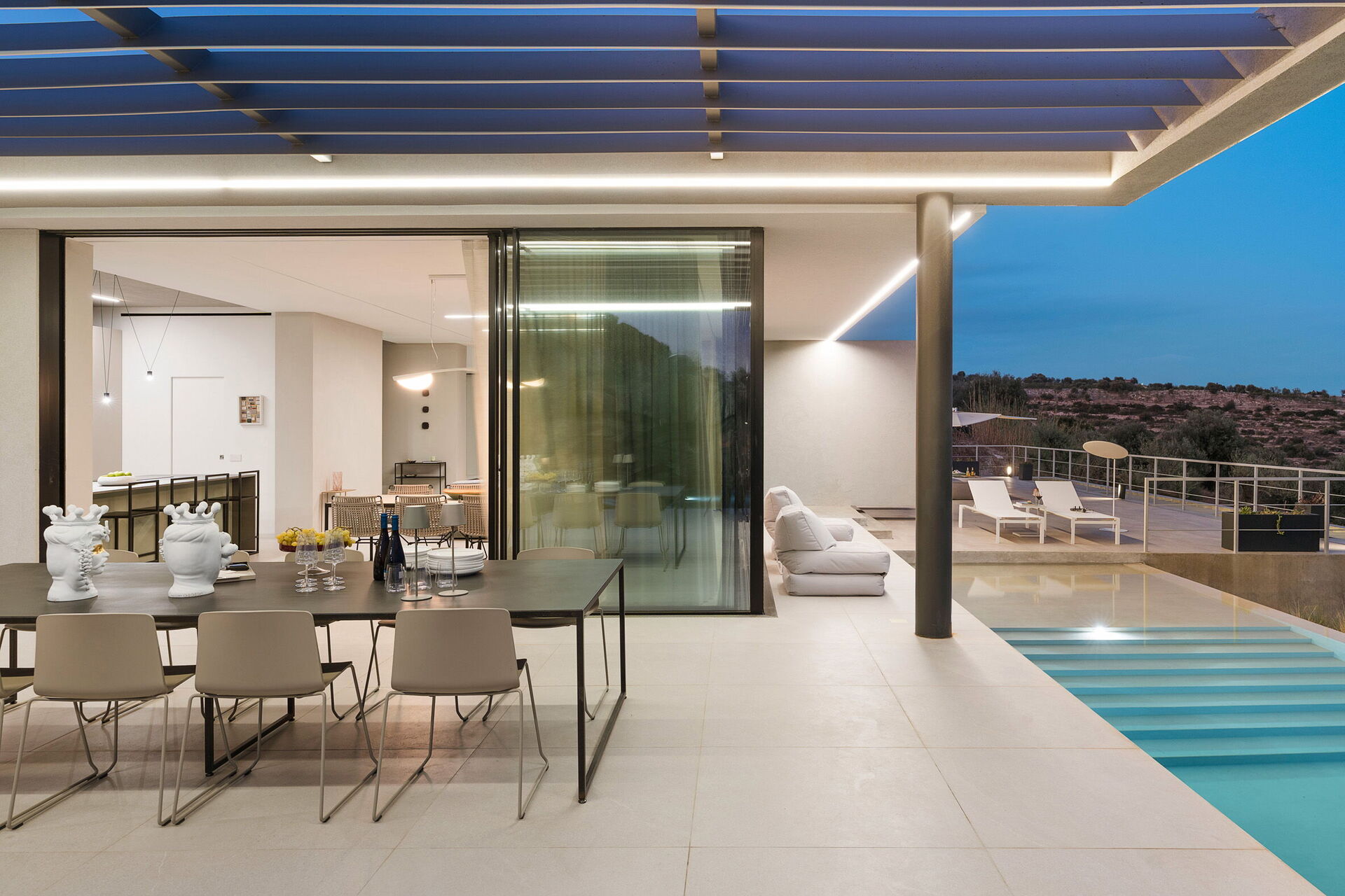 À l’extérieur se trouve une grande piscine accompagnée d’un solarium avec transats et petites tables: c’est l’endroit idéal pour profiter du soleil sicilien, se détendre, se rafraîchir et admirer la belle vue sur la mer et la campagne environnante avec ses proches ou ses amis.
