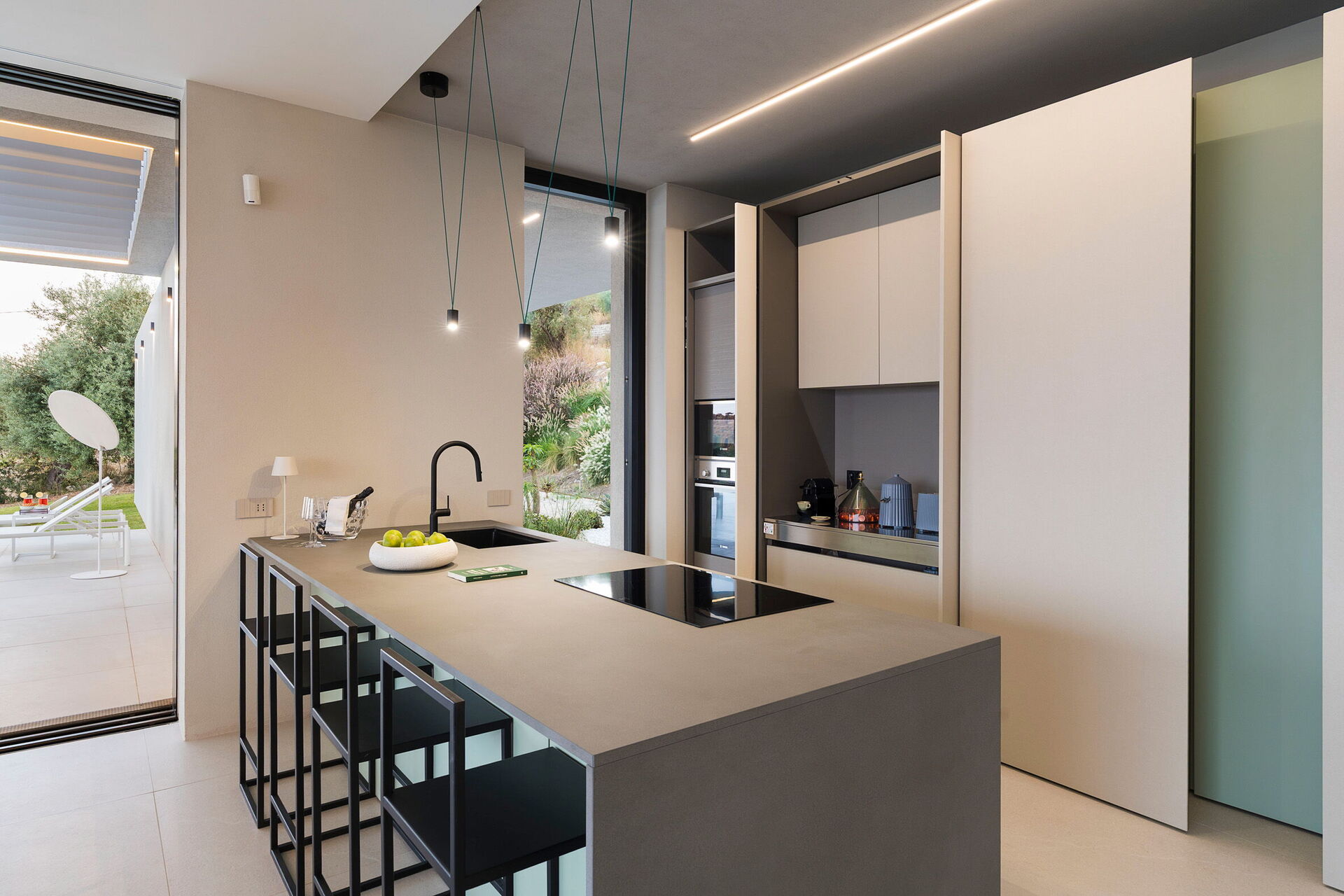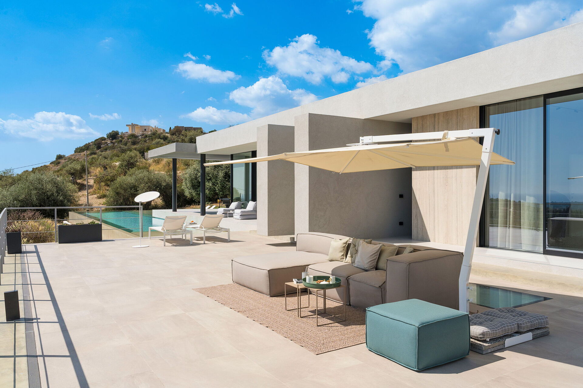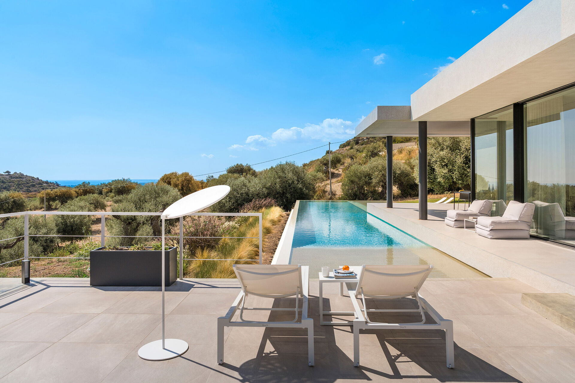Moderne et luxueuse, cette villa exclusive bénéficie d’une position panoramique spectaculaire avec une vue à couper le souffle sur la mer, que l’on peut admirer aussi bien depuis la piscine que des grandes terrasses et du jardin.
