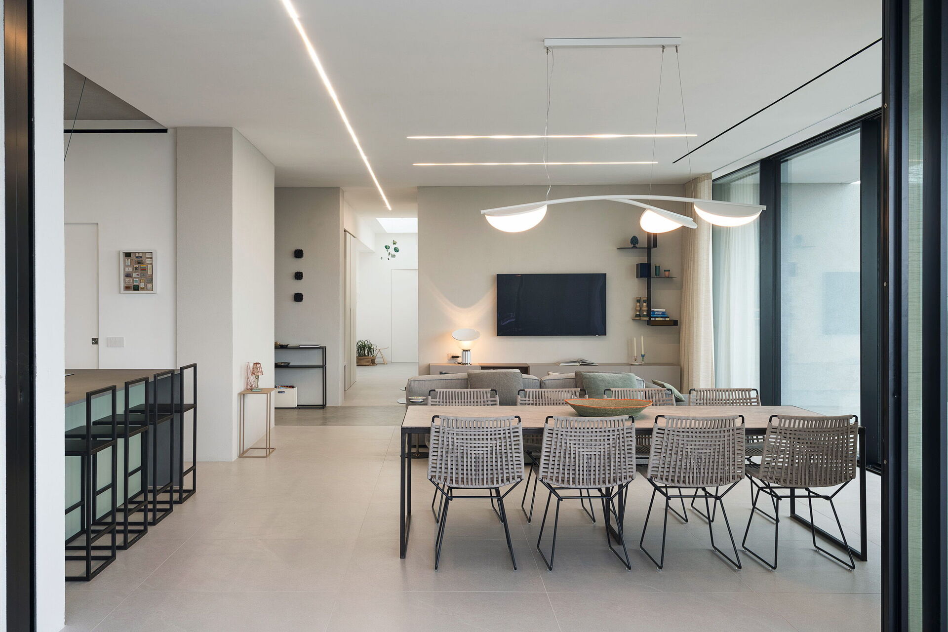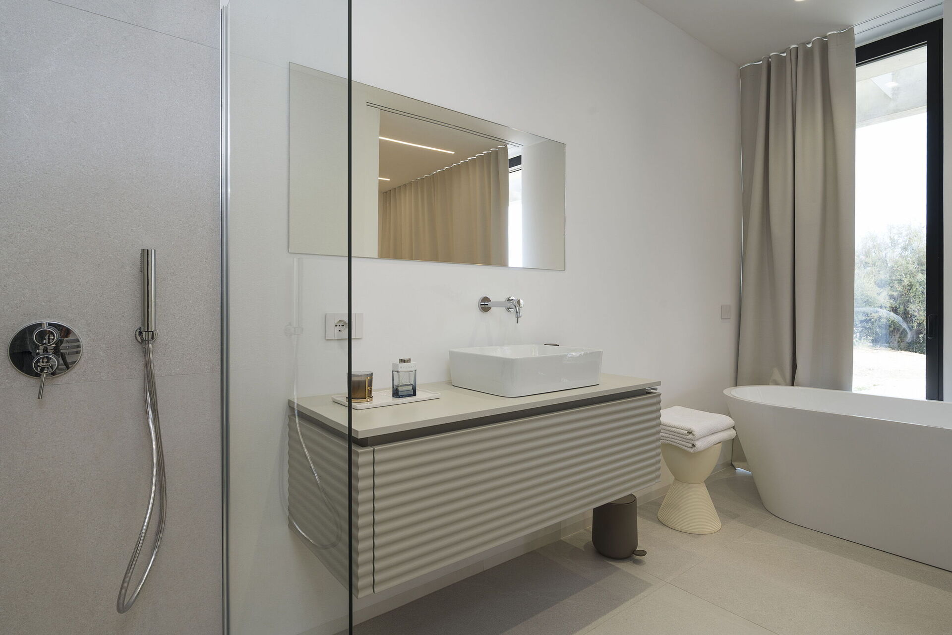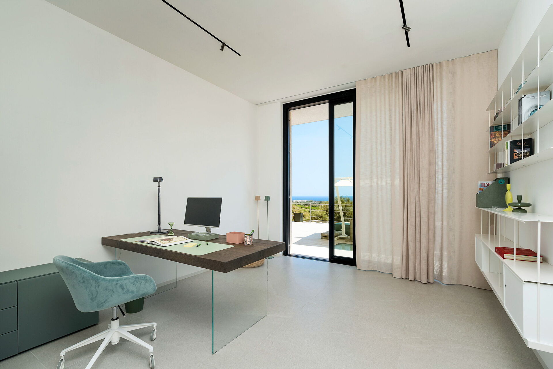 Rez-de-chaussée: entrée, vaste et lumineuse zone de vie avec grandes baies vitrées composée d’un salon (TV) avec coin repas et accès vers l’extérieur, cuisine (plaque de cuisson, four, réfrigérateur, congélateur, lave-vaisselle, micro-ondes, grille-pain, machine à café expresso), WC, bureau avec accès vers l’extérieur, chambre double (dimensions du lit: 180 x 200 cm) avec salle de bain privée avec douche.