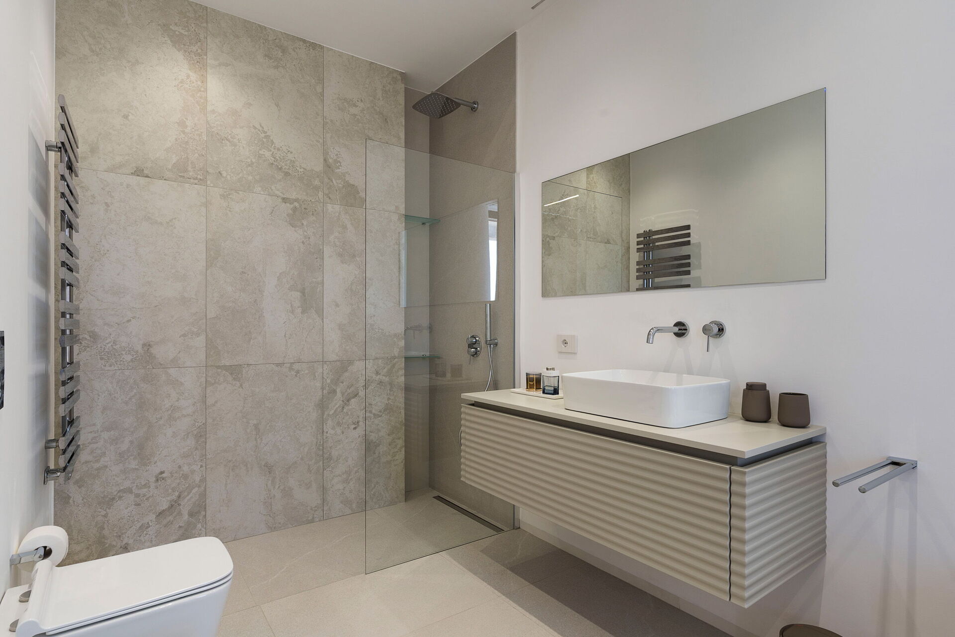 Niveau inférieur: 2 chambres doubles (dimensions des lits: 180 x 200 cm) chacune avec dressing et salle de bain privée avec baignoire et douche; 1 chambre avec 2 lits simples (dimensions des lits: 120 x 200 cm) avec dressing et salle de bain privée avec douche.