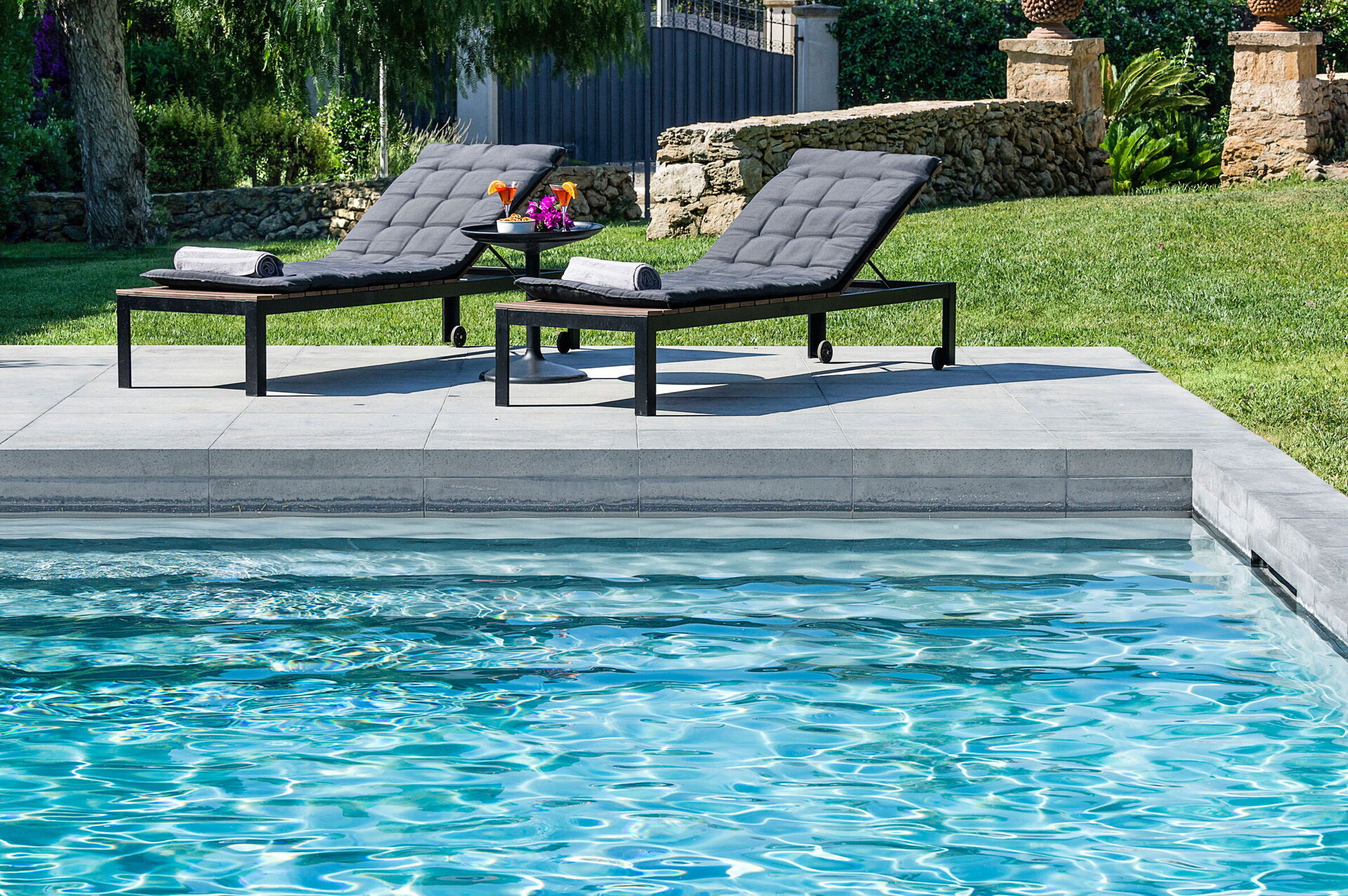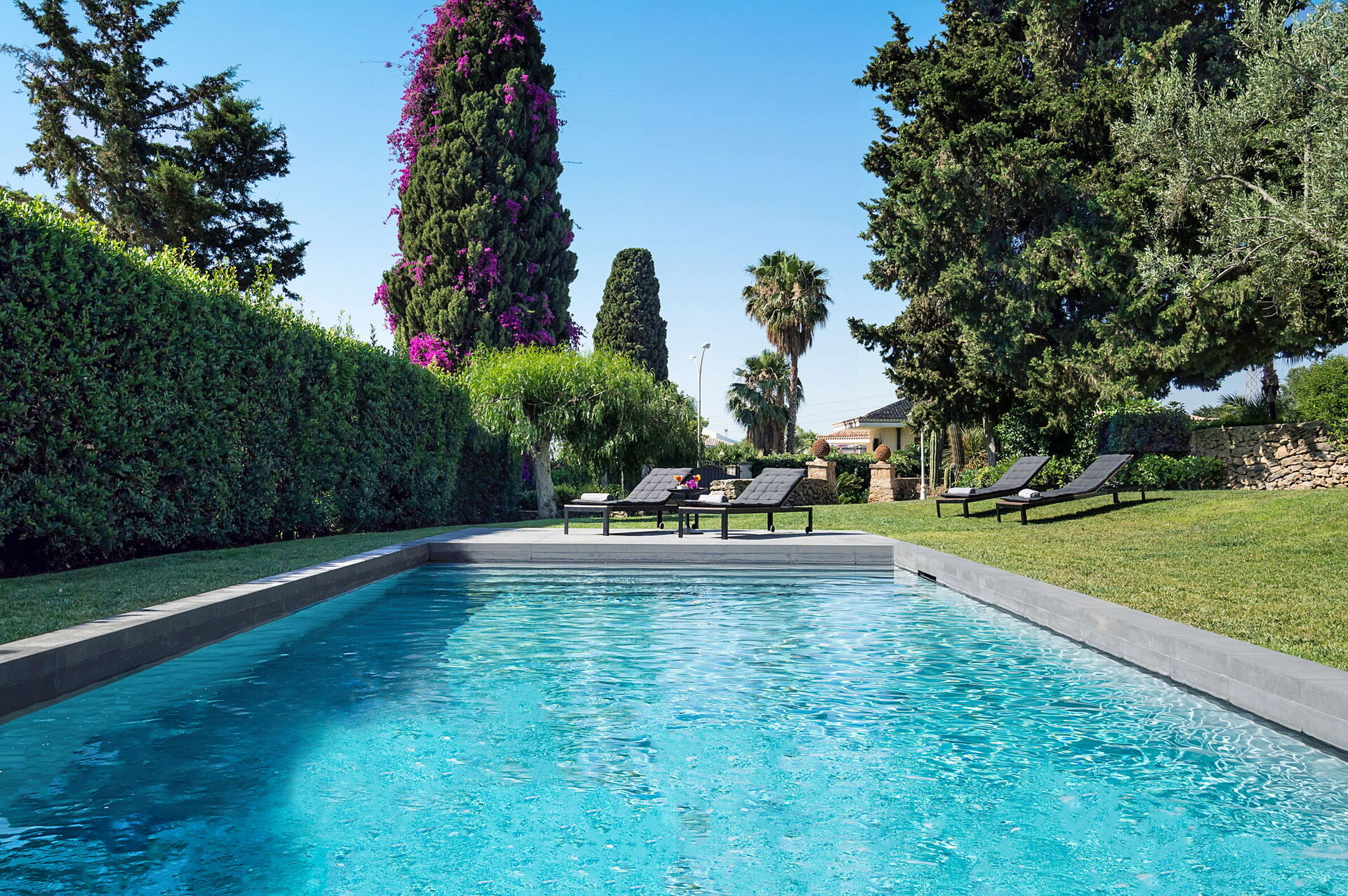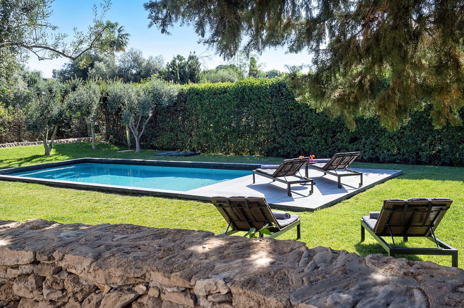 - piscine privée avec système de purification au sel; 10,50 x 4,50 mètres; profondeur minimum: 1,10 mètre; profondeur maximum: 1,60 mètre; chauffée jusqu’à environ 26°C