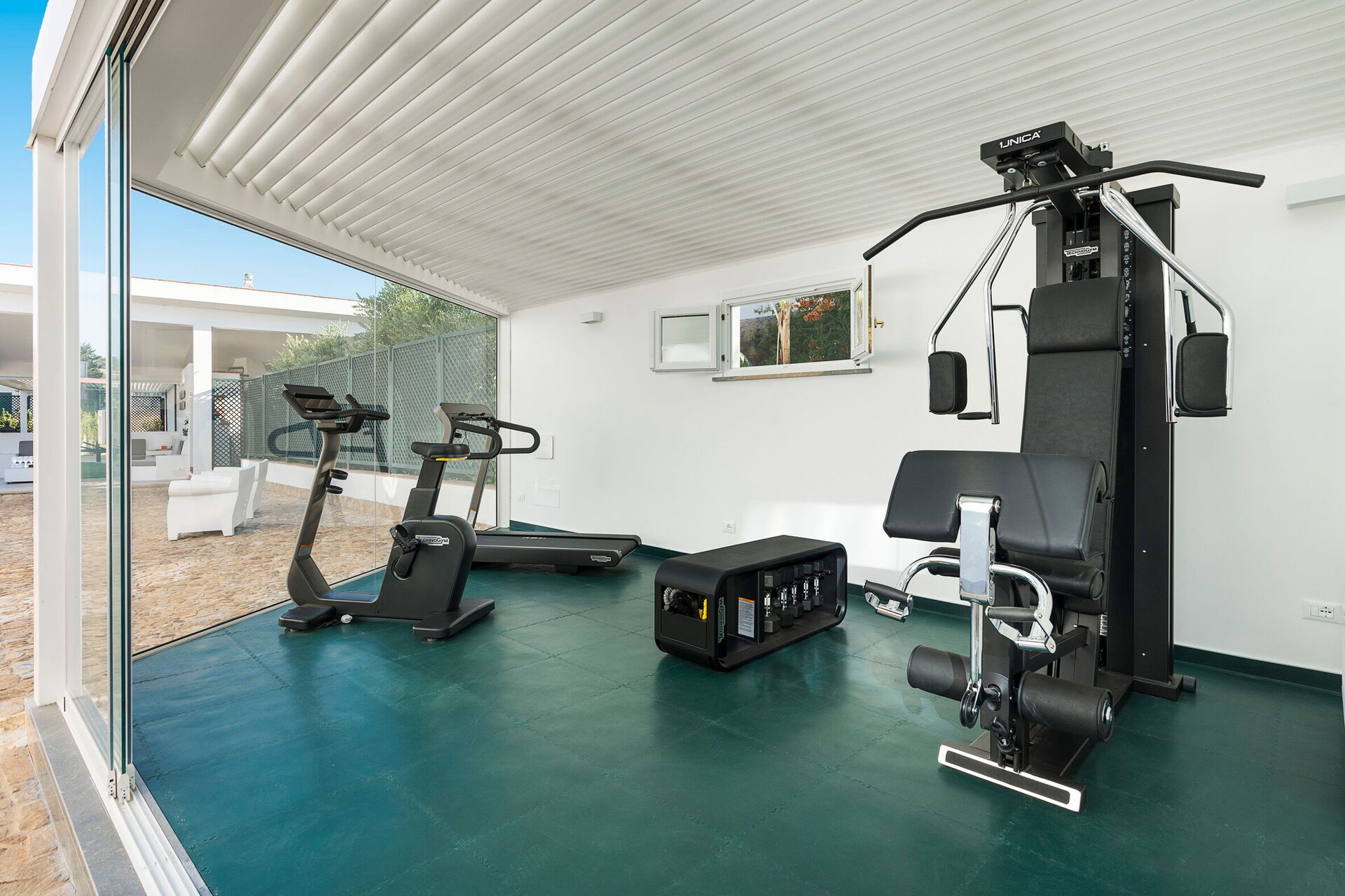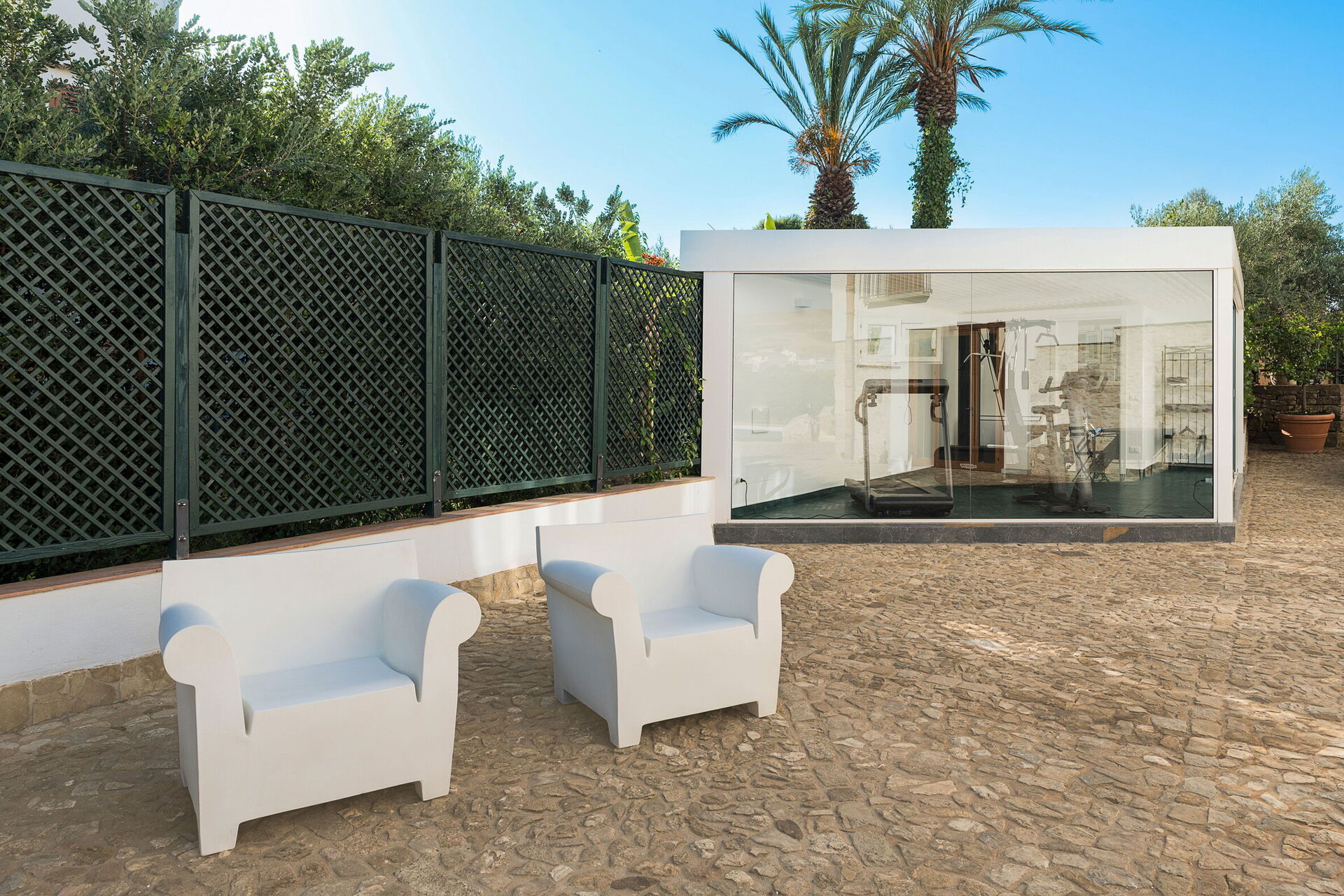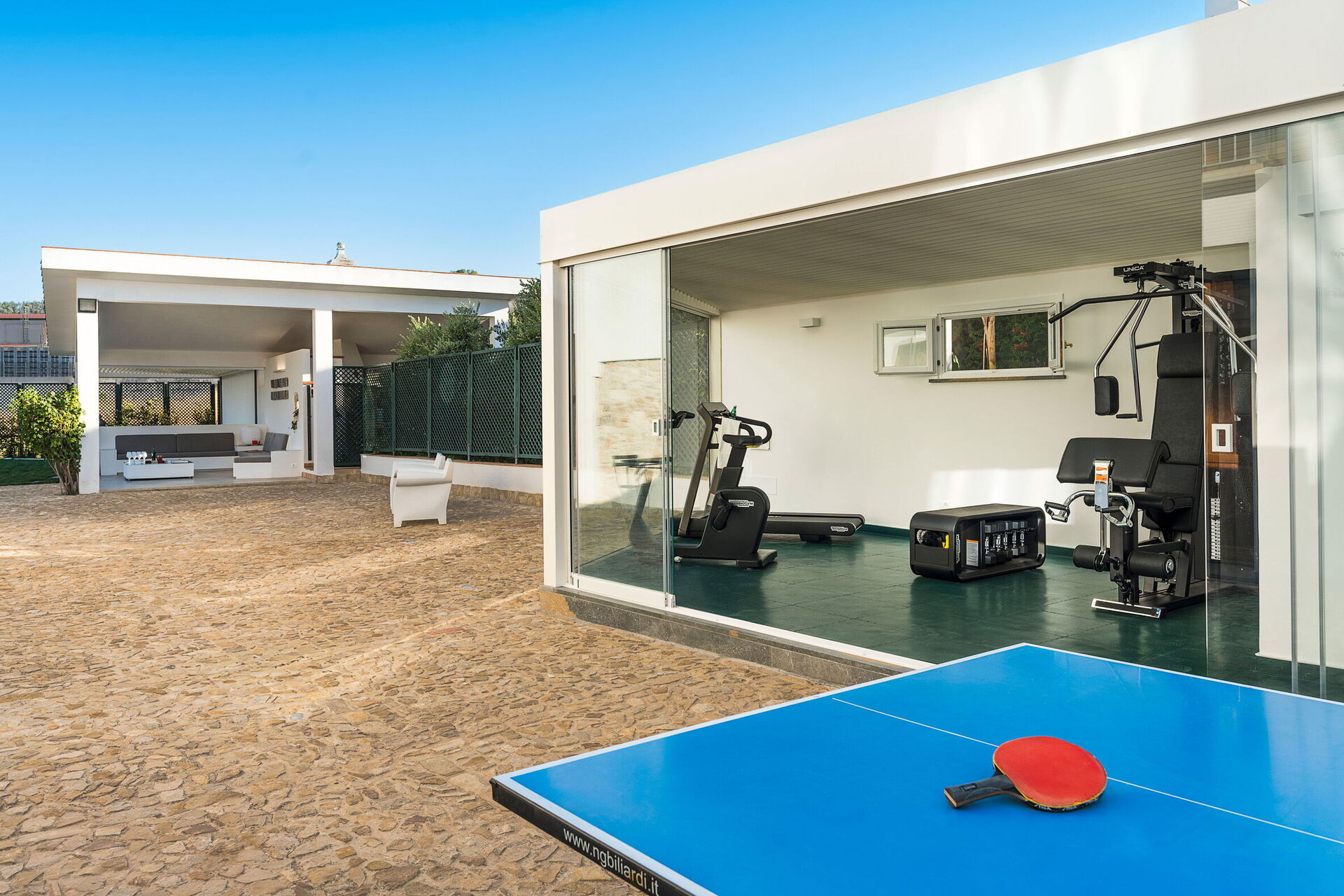 Extérieurs : loggia, aire repas, terrasses, jardin, piscine, solarium, espace fitness avec salle de bain-douche.