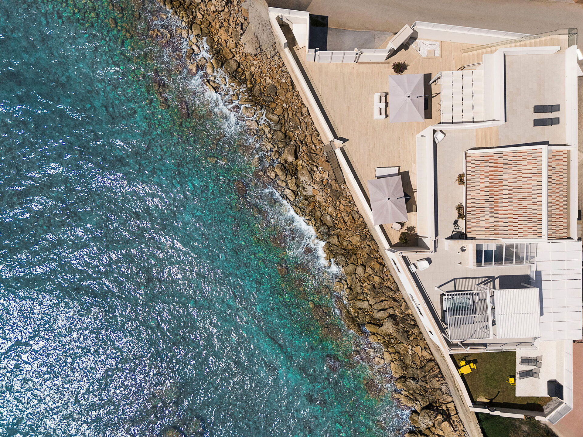 Depuis la terrasse de la propriété, on accède directement à la falaise et à la mer par un escalier en acier.