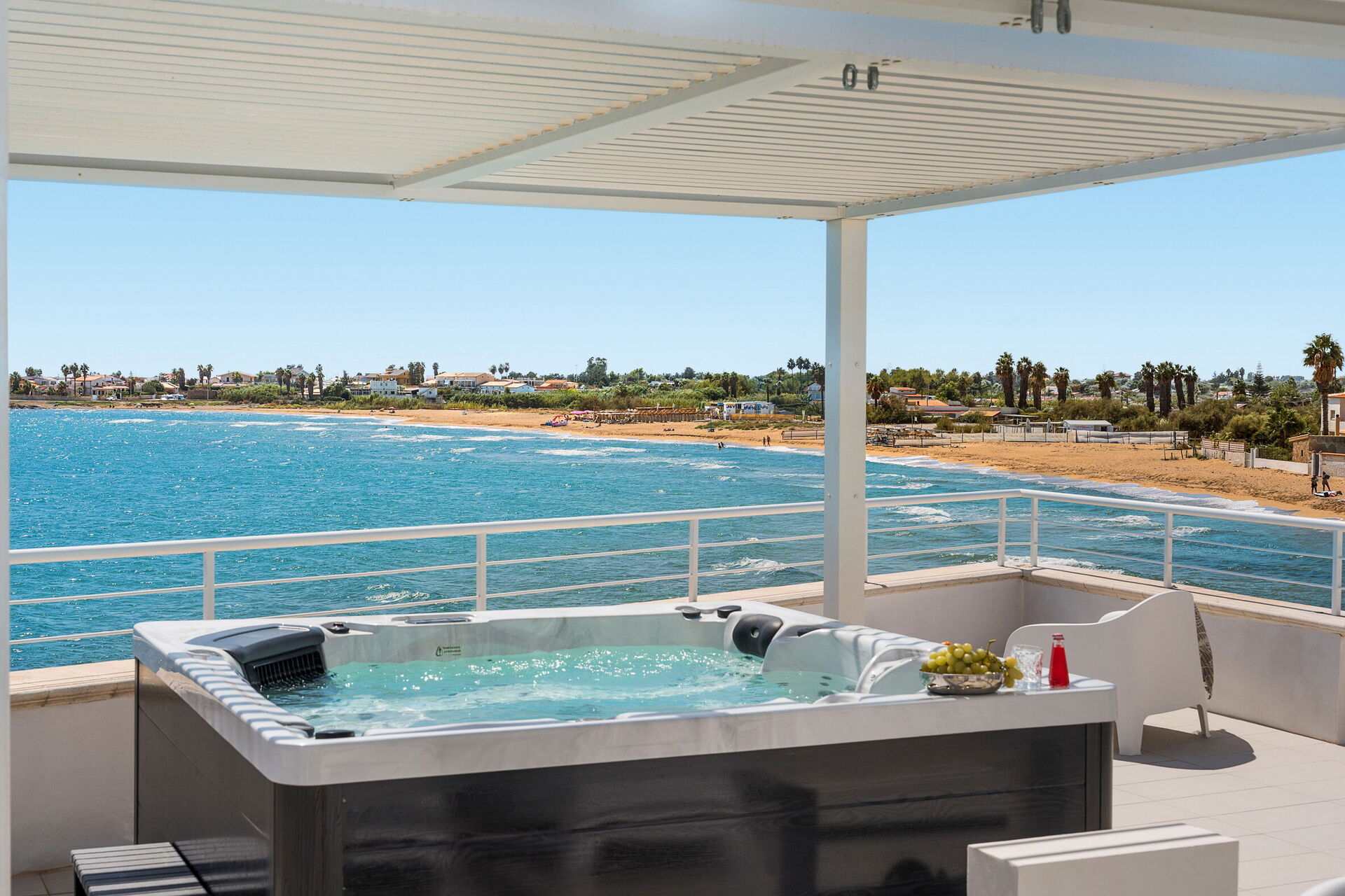 La belle terrasse représente le point fort de la propriété: équipée de meubles de jardin, de transats et de parasols, elle offre une vue magnifique sur la mer et le littoral d'Avola.
