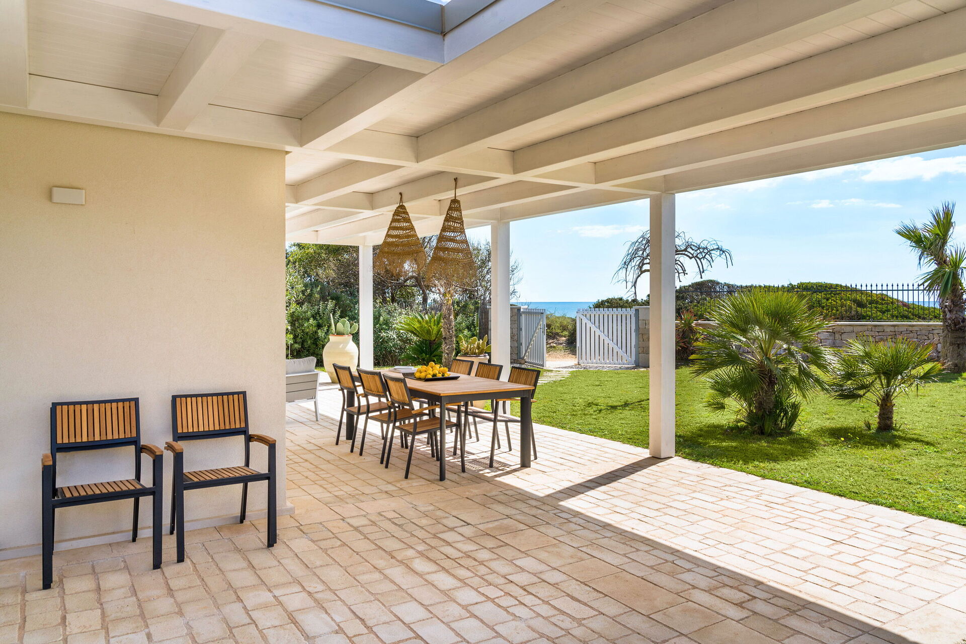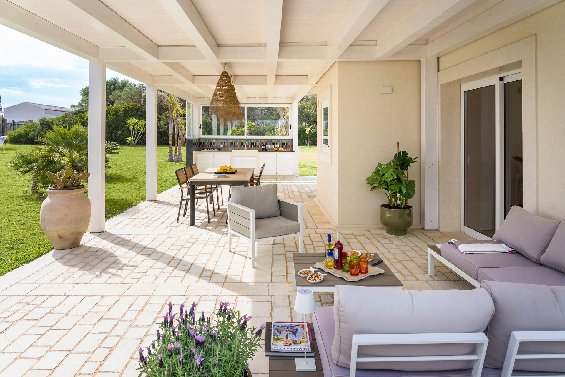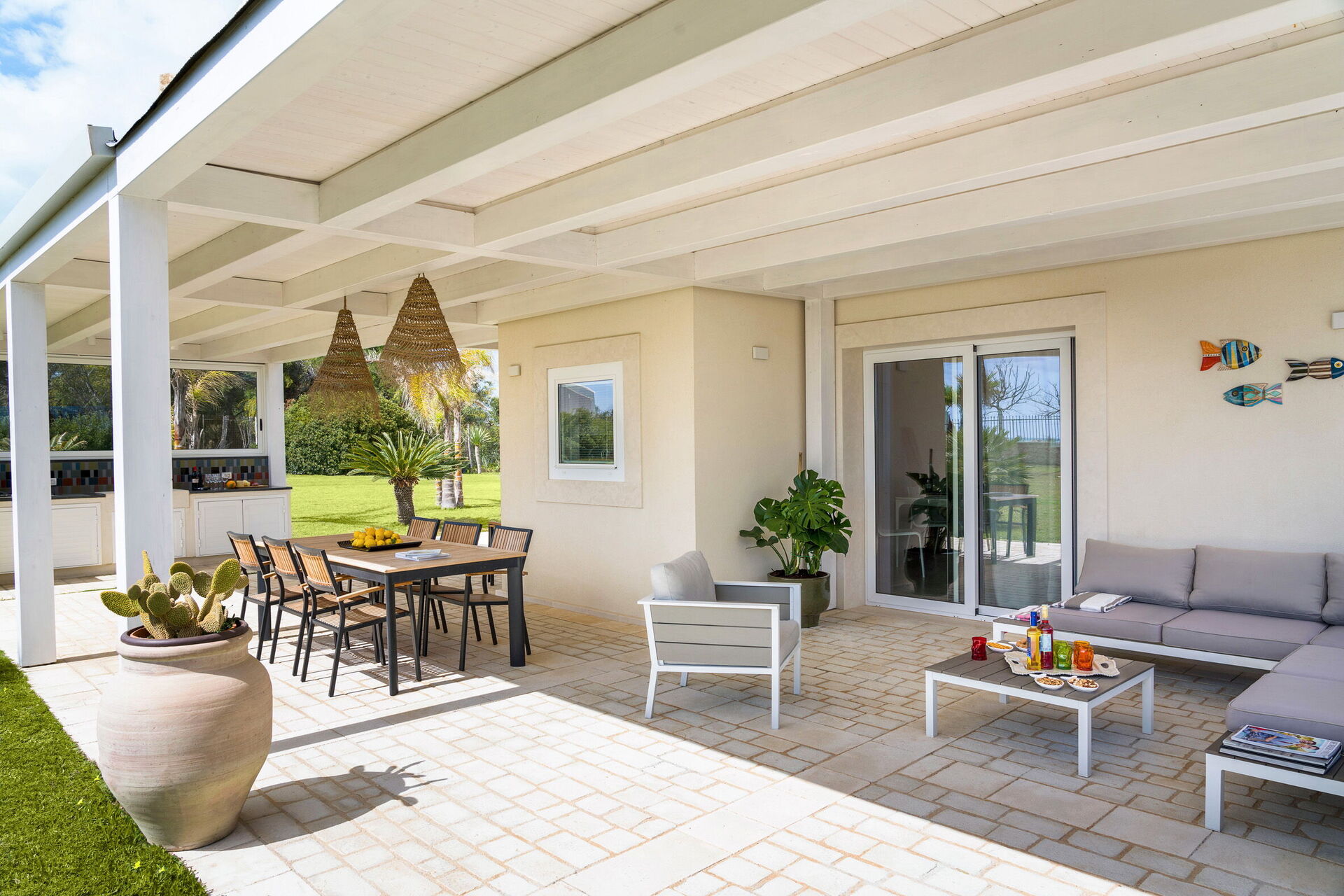 Les espaces extérieurs panoramiques offrent beaucoup de place aux hôtes pour profiter d'un séjour agréable en famille ou entre amis, en se relaxant dans la véranda équipée pour les repas en plein air ou dans le grand espace piscine avec solarium, idéal pour passer d'agréables moments sous le soleil sicilien.