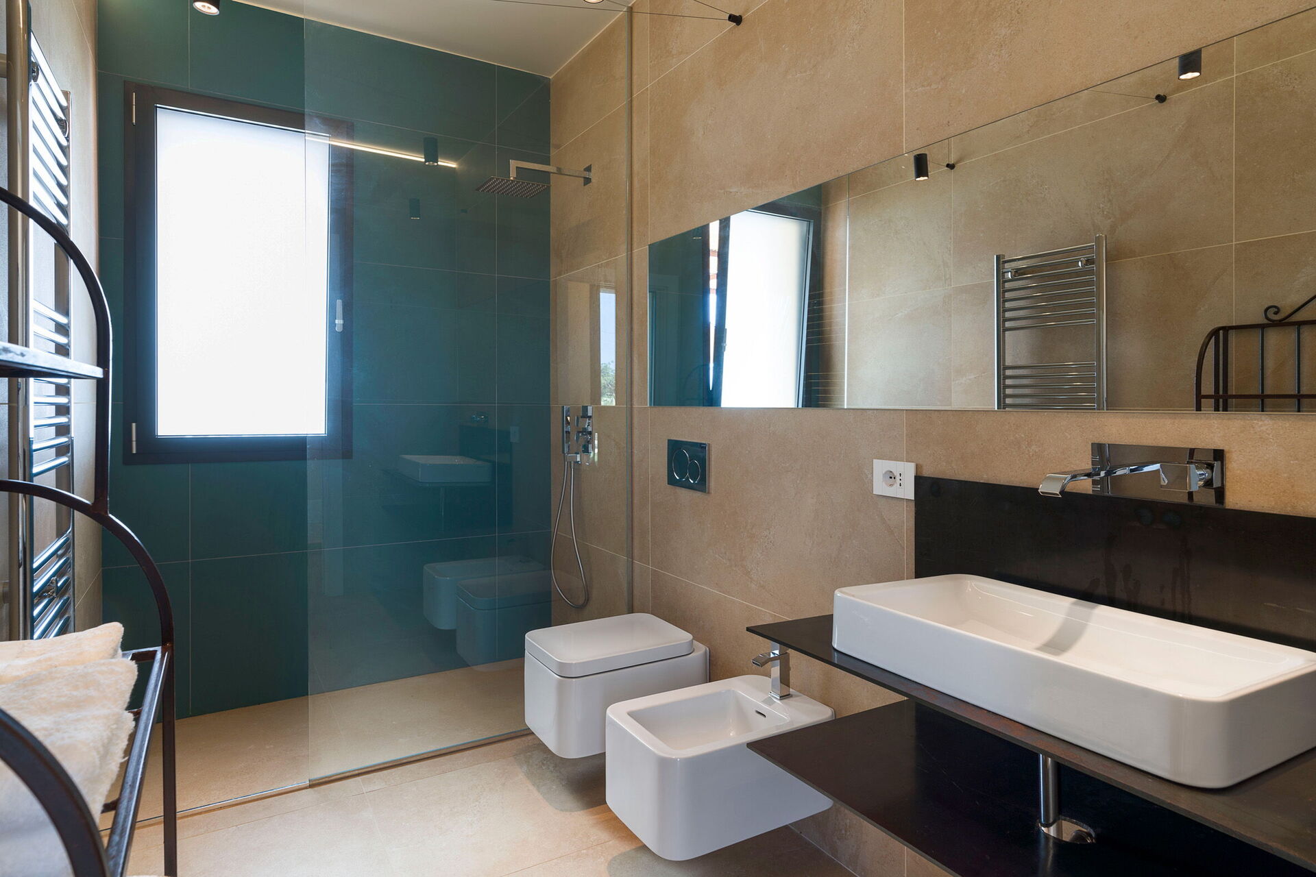 Rez-de-chaussée: salon panoramique (TV) avec salle à manger, cuisine (plaque de cuisson, four, congélateur, réfrigérateur, lave-vaisselle, cafetière, grille-pain), chambre avec 2 lits simples (air conditionné), salle de bain avec douche, 2 chambres doubles (air conditionné) chacune avec salle de bain privée avec douche.
