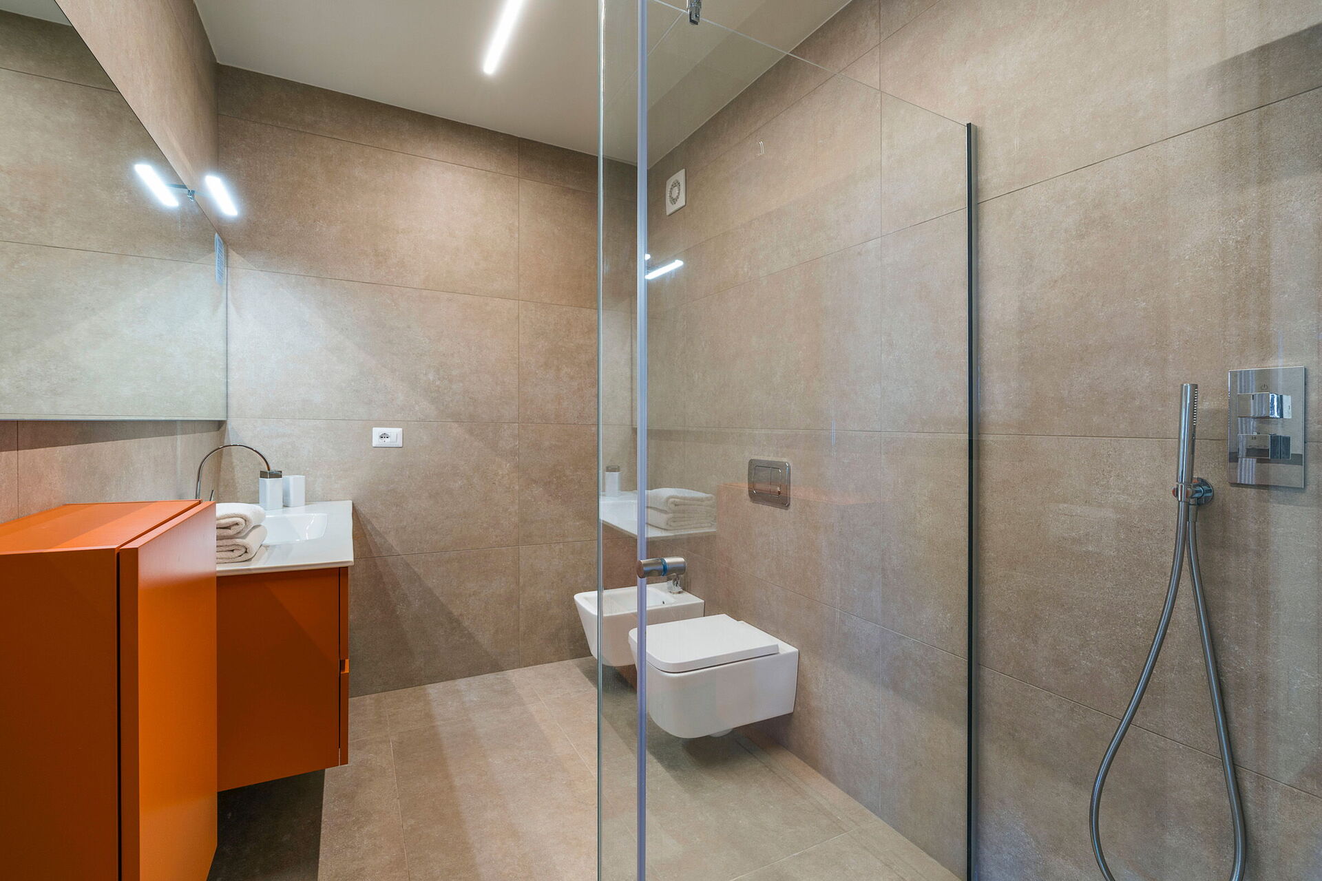 Rez-de-chaussée: salon panoramique (TV) avec salle à manger, cuisine (plaque de cuisson, four, congélateur, réfrigérateur, lave-vaisselle, cafetière, grille-pain), chambre avec 2 lits simples (air conditionné), salle de bain avec douche, 2 chambres doubles (air conditionné) chacune avec salle de bain privée avec douche.