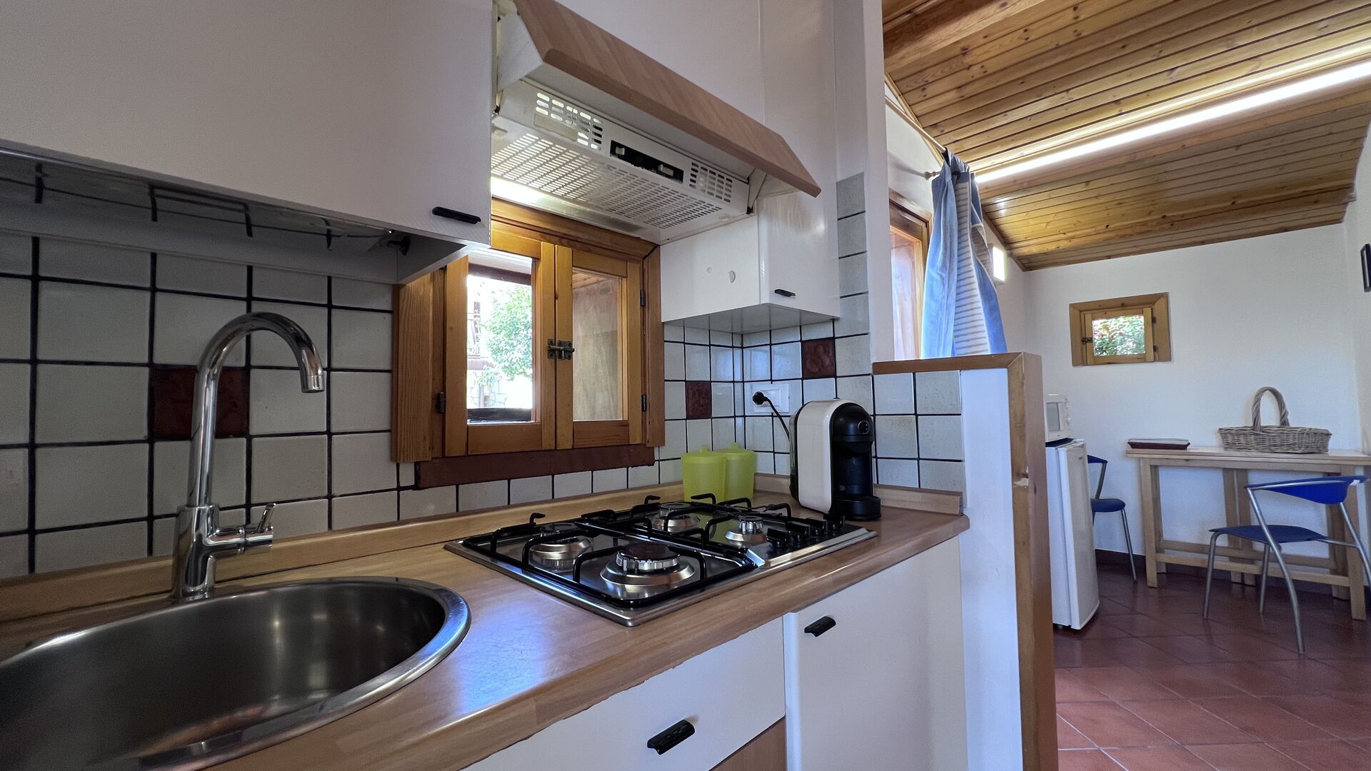 Rez-de-chaussée (studio): séjour avec canapé-lit double et coin-cuisson (frigo), salle de bains avec douche.