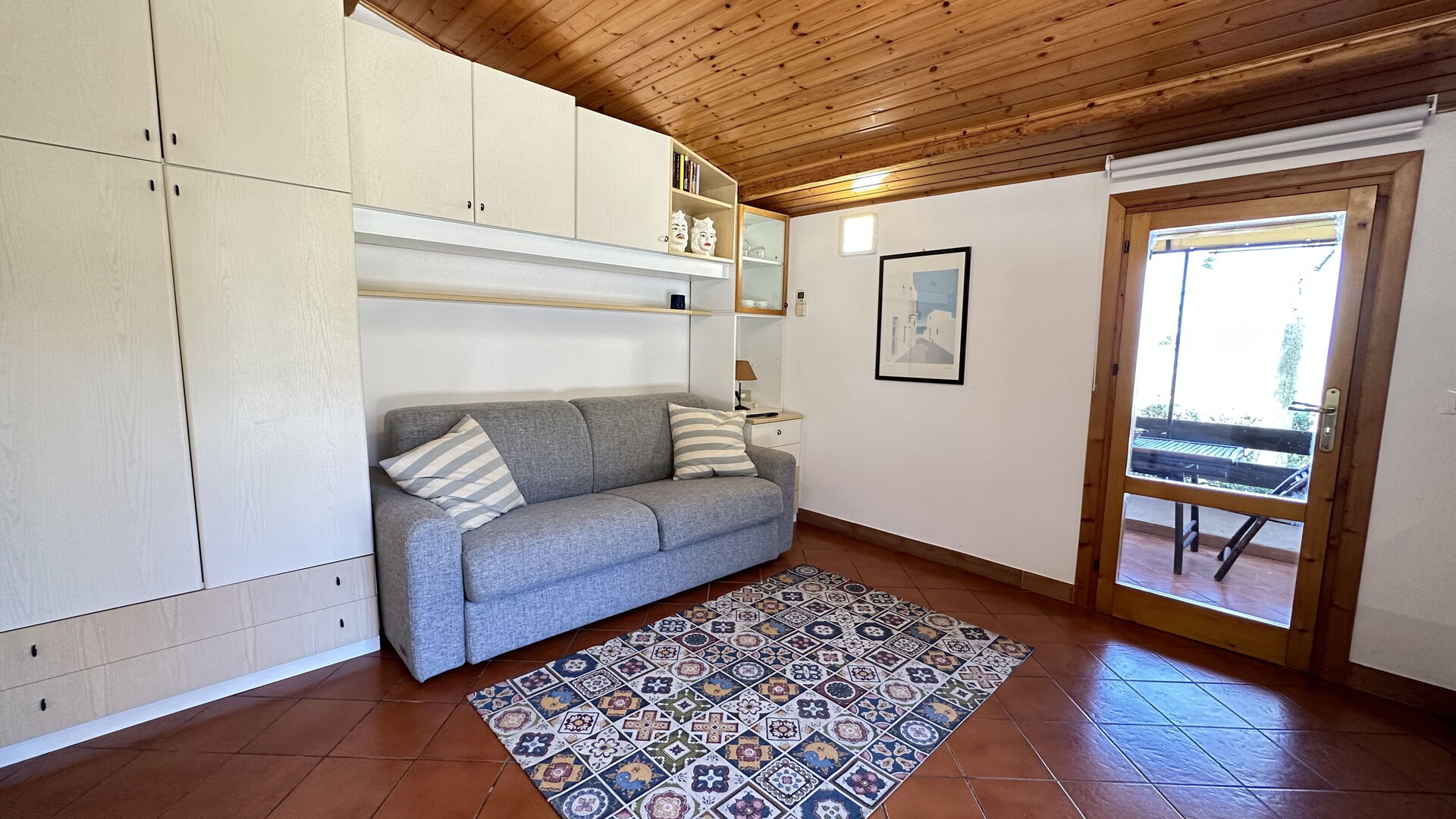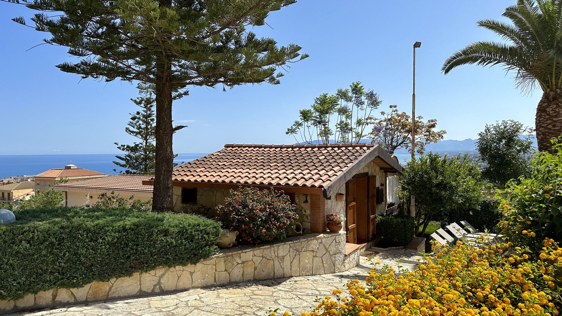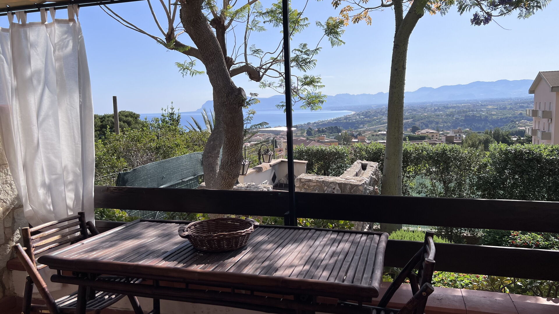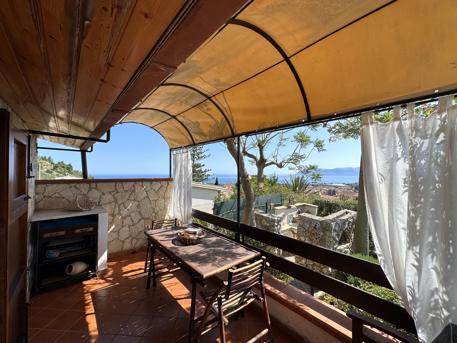 Petite terrasse ombragée avec vue panoramique sur la mer.