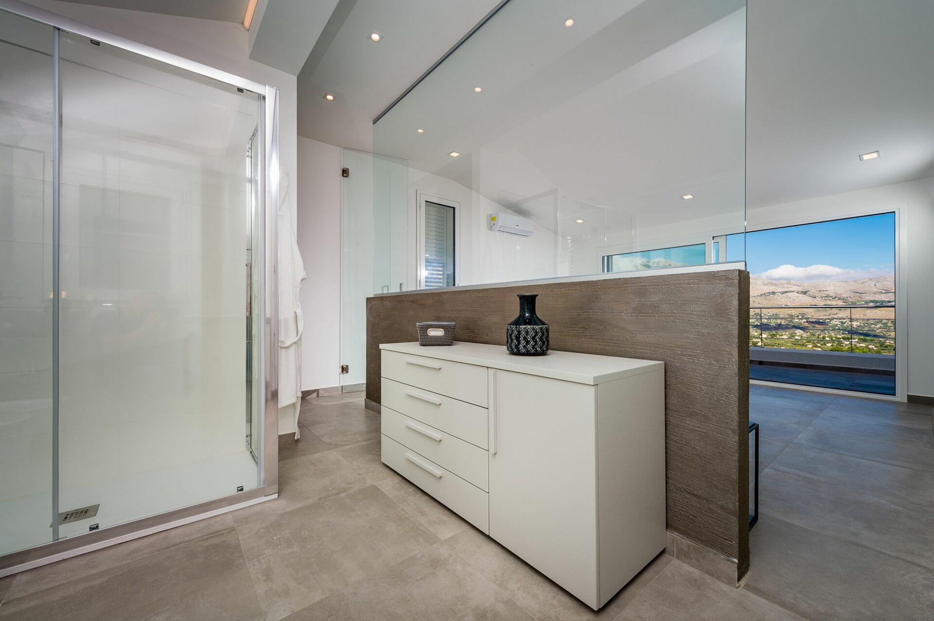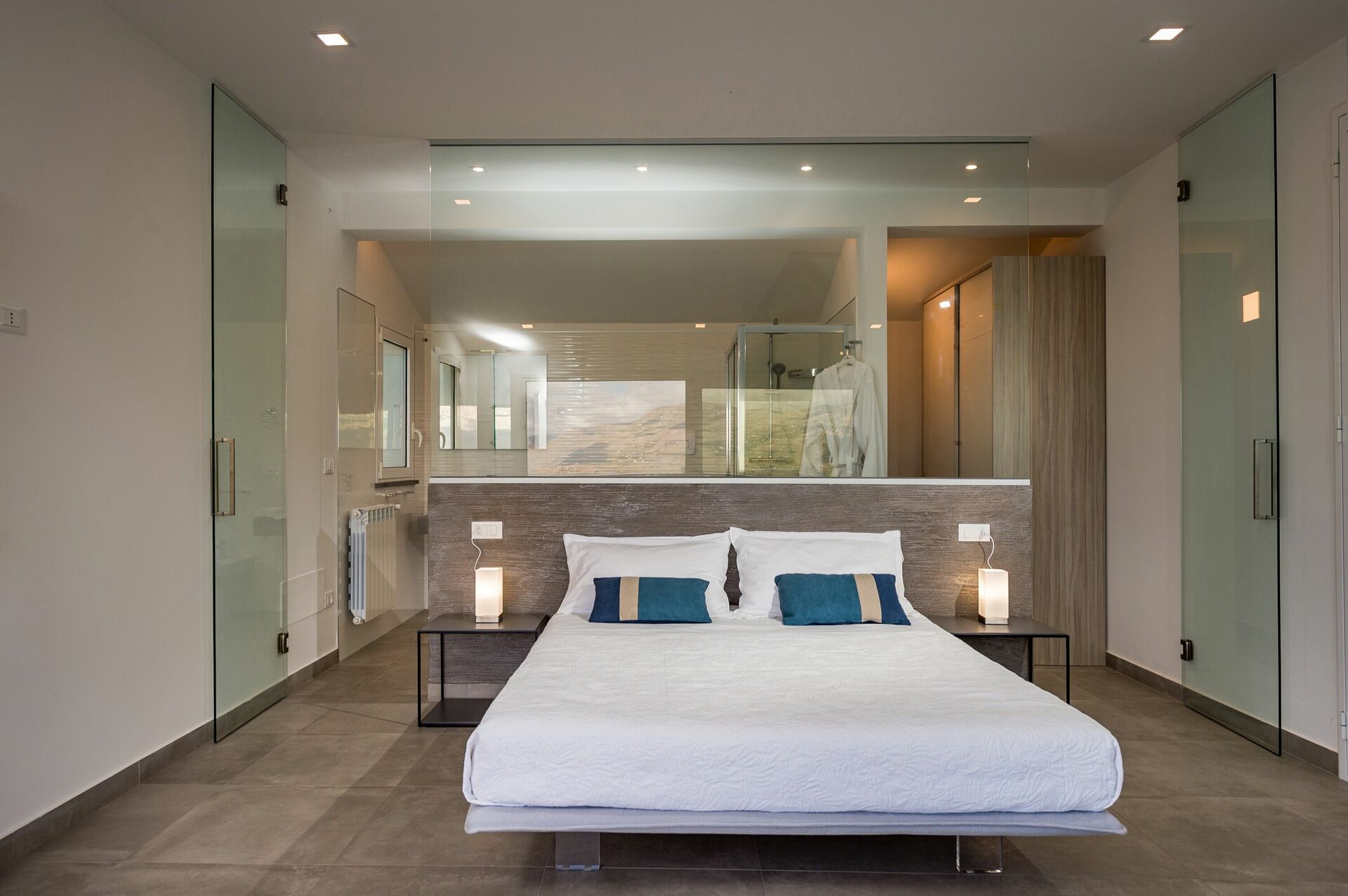 La villa est meublée dans un style moderne, sur deux niveaux et les grandes fenêtres donnent le sentiment d'être à l'extérieur même lorsque vous êtes confortablement assis dans le salon. Aux quatre coins de la villa, la vue est projetée à l'extérieur à la recherche des couleurs de ce fantastique paysage sicilien surplombant l'océan.