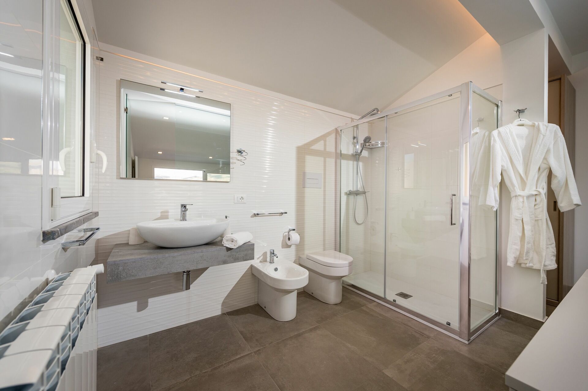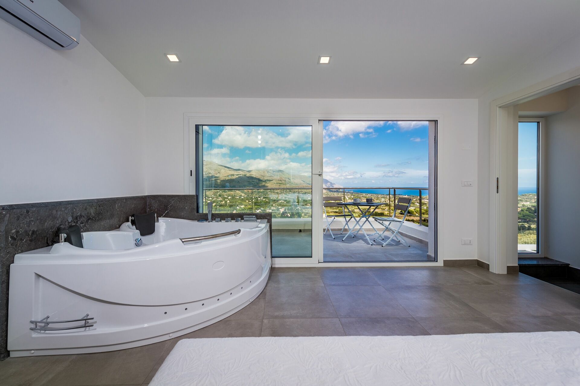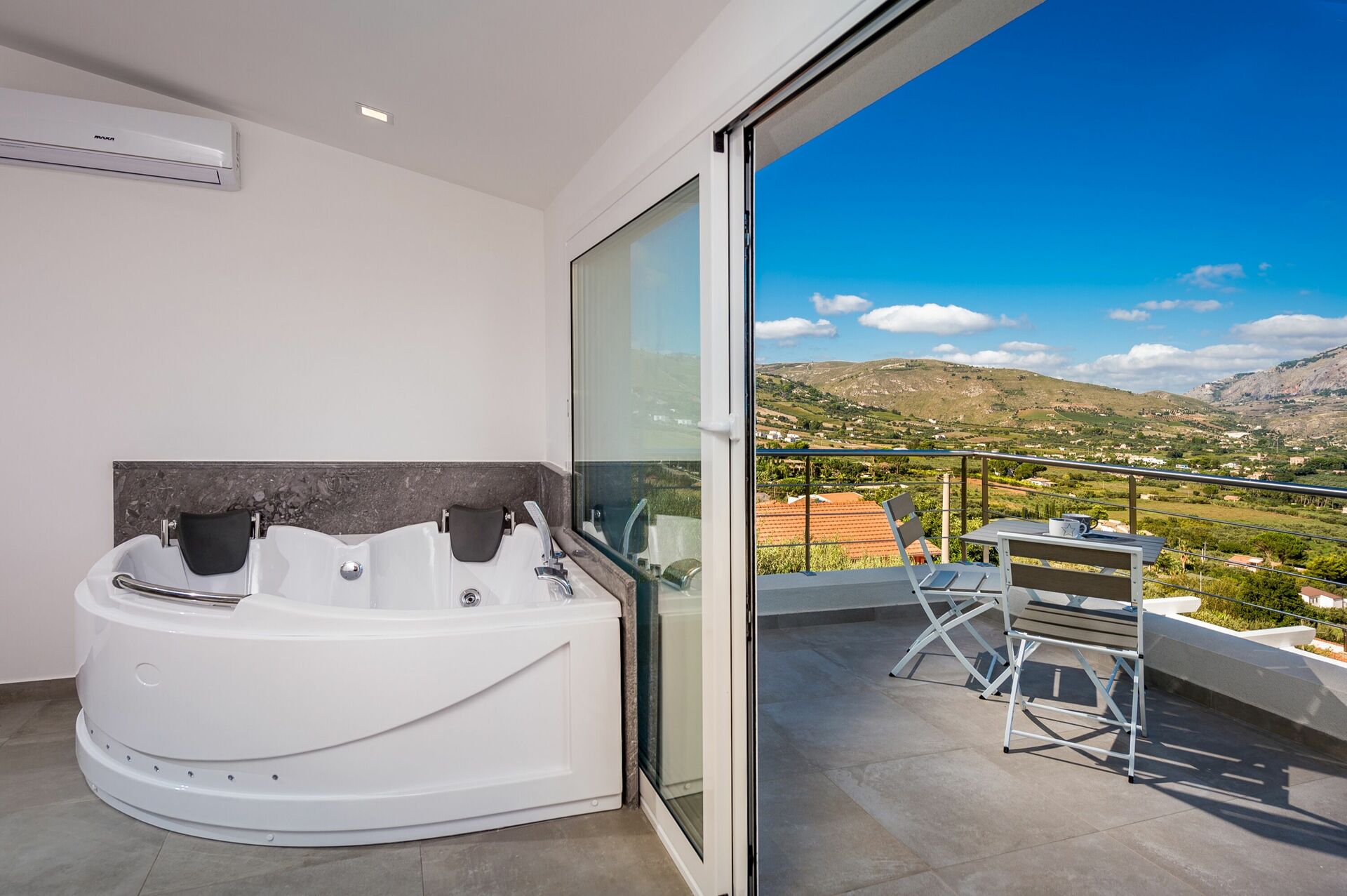 Premier étage: chambre double avec jacuzzi et salle de bain privée avec douche, terrasse panoramique.