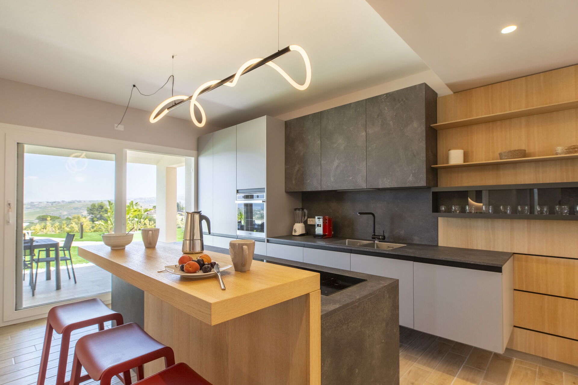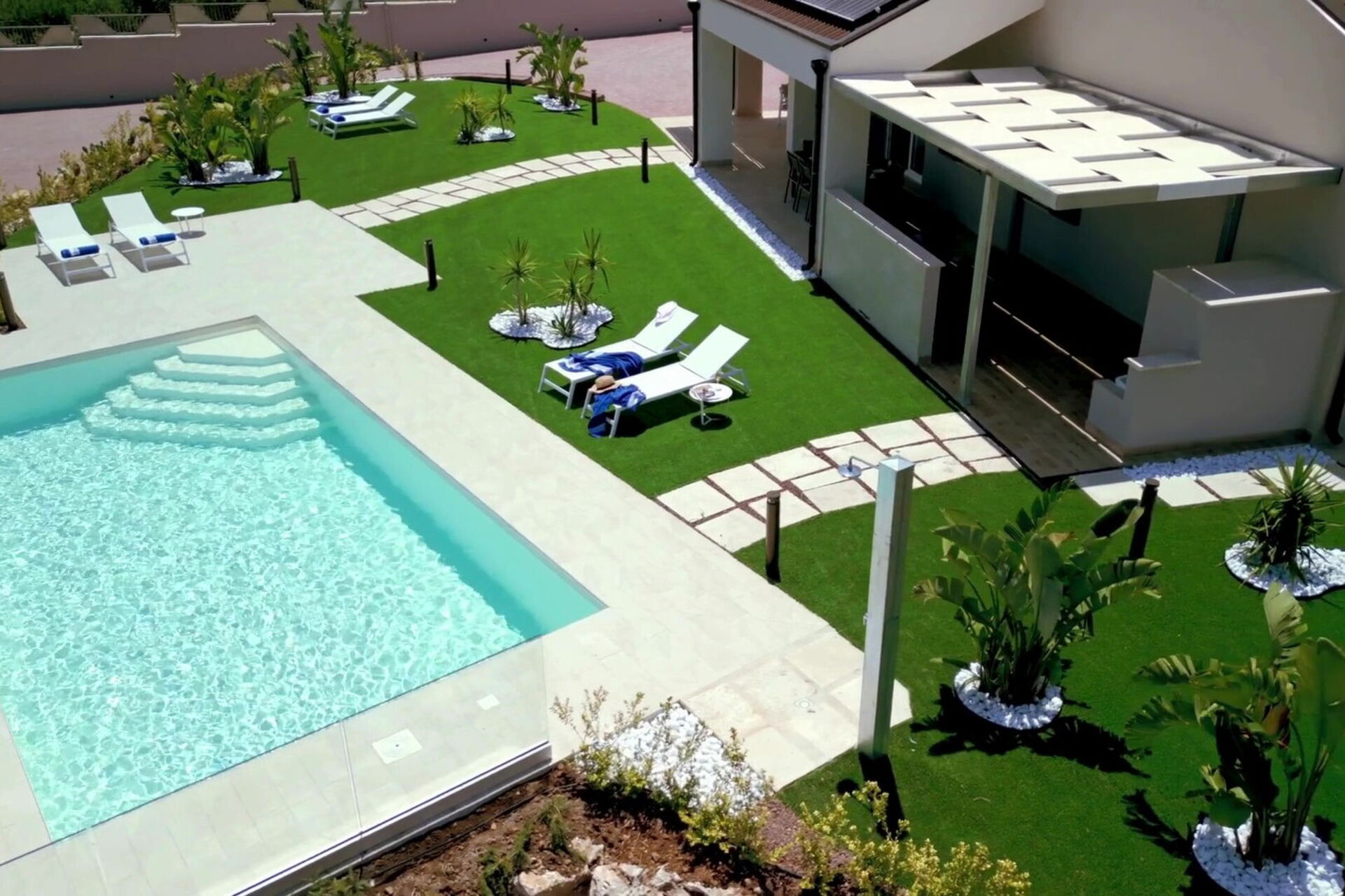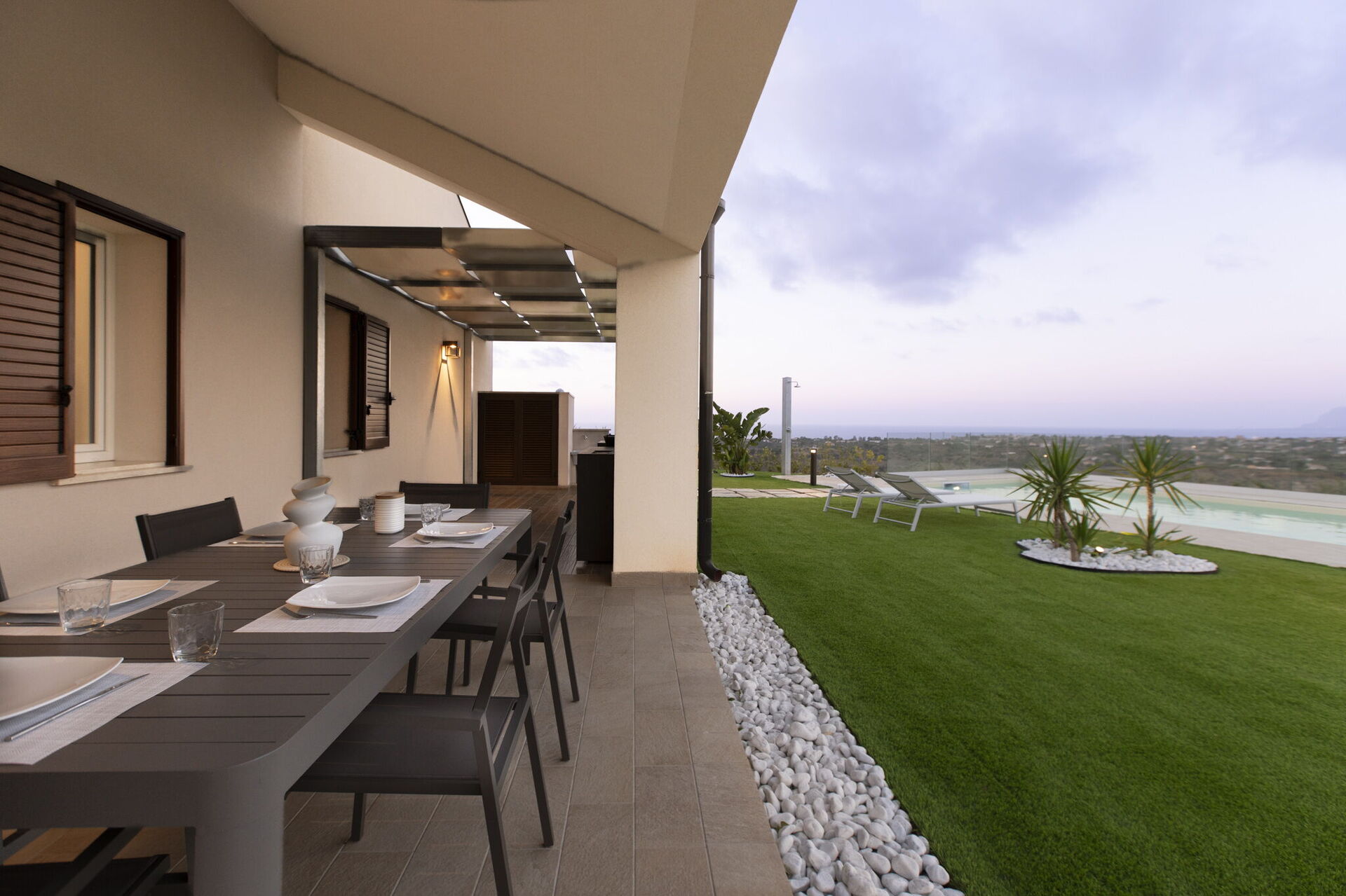 De grands espaces extérieurs tels que la zone solarium située au bord de la piscine sont à disposition des hôtes pour se détendre en compagnie d’amis ou de la famille en toute intimité. Une véranda équipée avec table et chaises permet de manger en plein air tout en profitant de la vue panoramique.