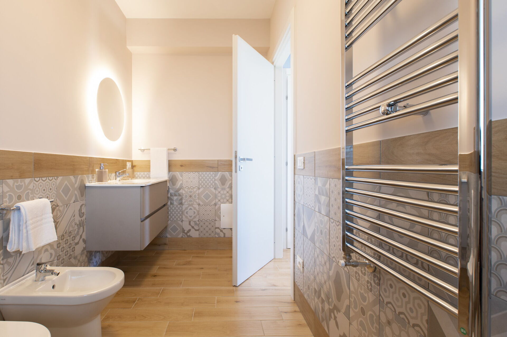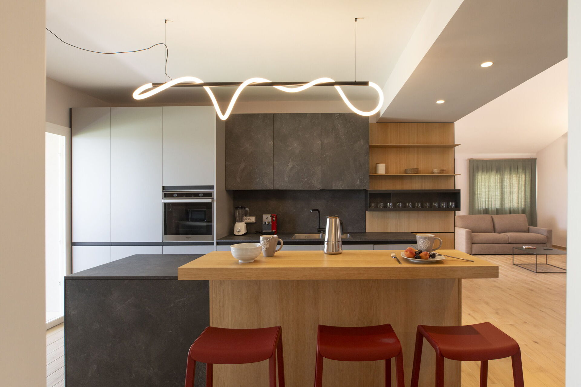Rez-de-chaussée: grand salon (Smart-TV) avec coin repas, cuisine (plaques de cuisson, four électrique, réfrigérateur, congélateur, lave-vaisselle, micro-ondes, grille-pain, machine à café expresso), 2 chambres doubles chacune avec salle de bain privée avec douche, chambre avec 2 lits simples, salle de bain avec douche.