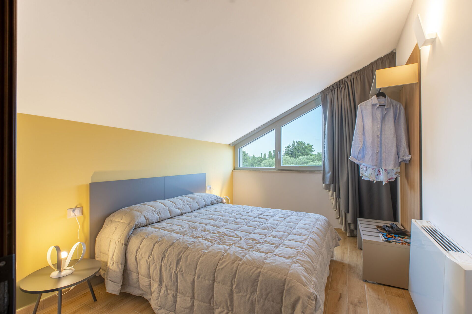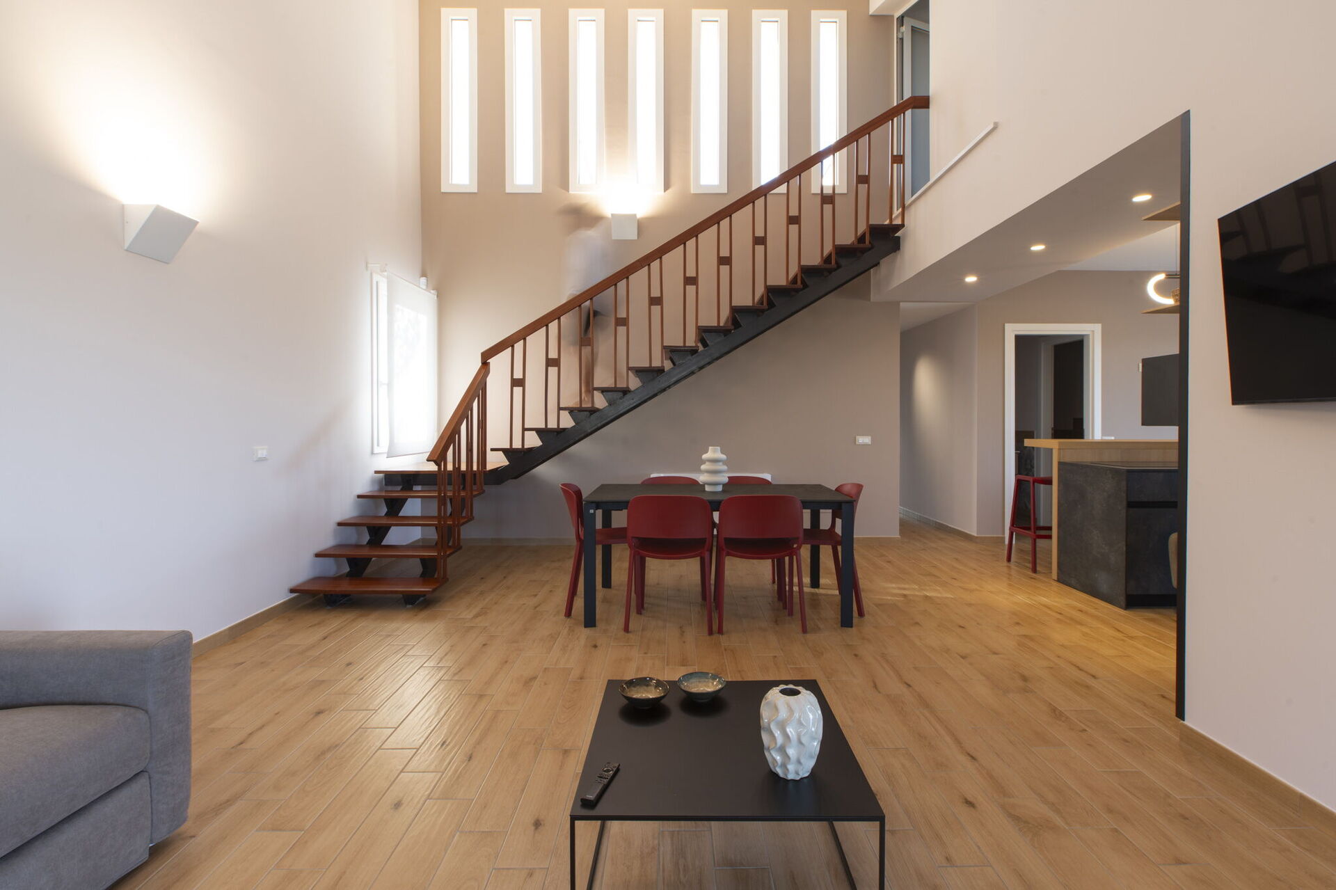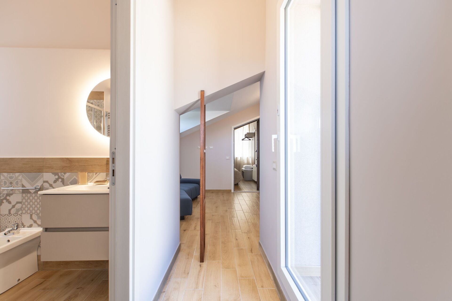 Premier étage: salon avec accès à la terrasse-solarium (Smart-TV), 2 chambres doubles, salle de bain avec douche. Le salon et l’une des chambres ont une partie du plafond en pente.