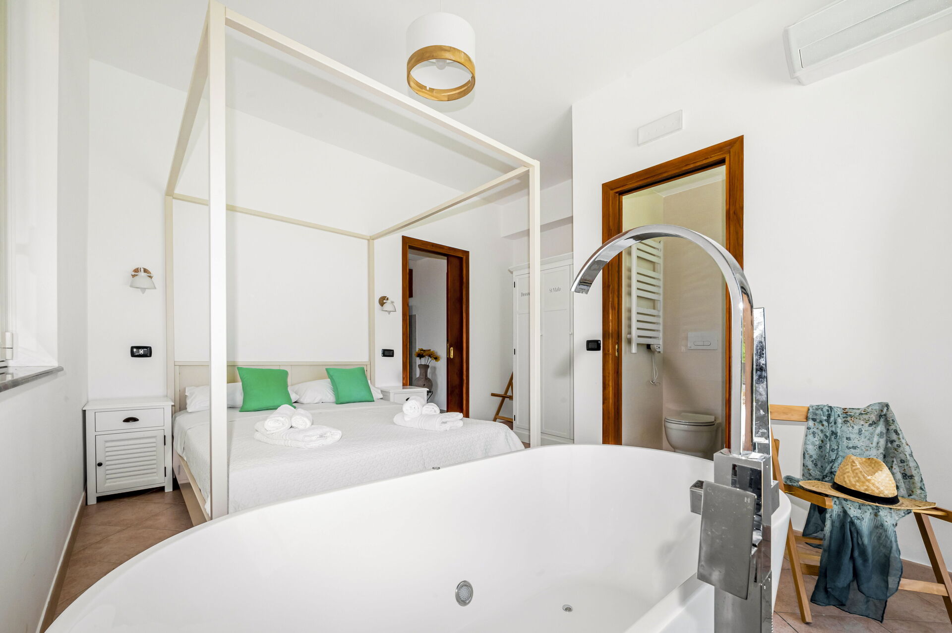Rez-de-chaussée: entrée sur salon avec canapé-lit double et cuisine (air conditionné, TV, plaque de cuisson à induction, four, réfrigérateur, congélateur, lave-vaisselle, micro-ondes, grille-pain, machine à café expresso) avec coin repas, chambre double (air conditionné, lit king size) avec salle de bain privée avec bain à remous, chambre double (air conditionné, lit super-king size) avec salle de bain avec baignoire, chambre double (air conditionné, lit king size), chambre avec 2 lits simples, salle de bain avec douche.