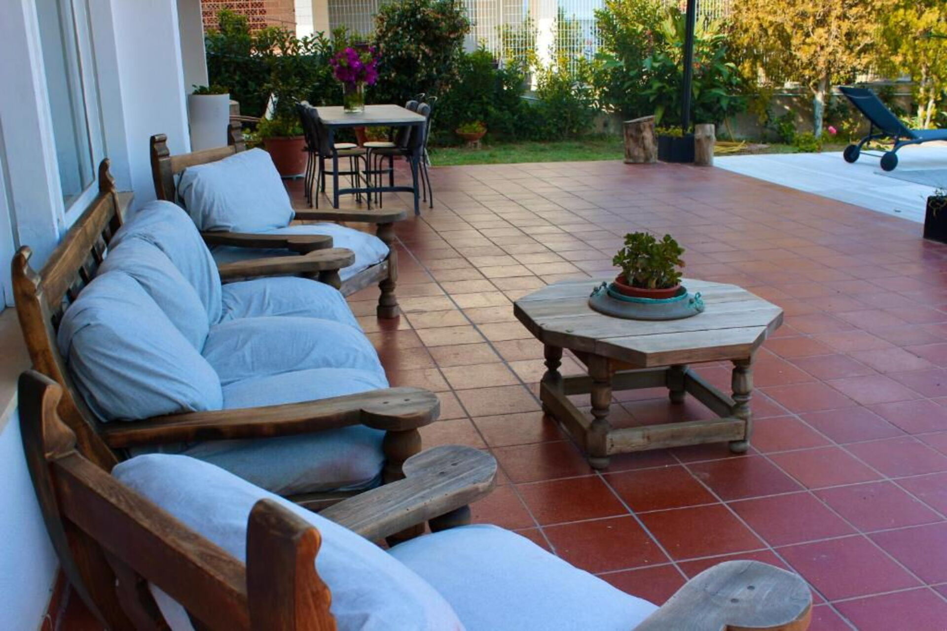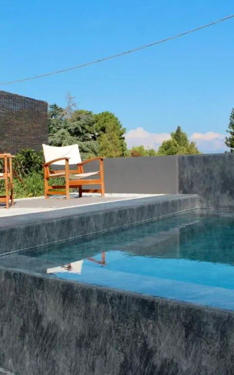 À l’extérieur, il y a une pergola avec des canapés de jardin et une salle à manger, où vous pourrez passer vos journées à l’extérieur. L’élégante piscine privée à débordement, à usage exclusif des hôtes, est accessible depuis quelques marches et est entourée de deux solariums avec chaises longues.