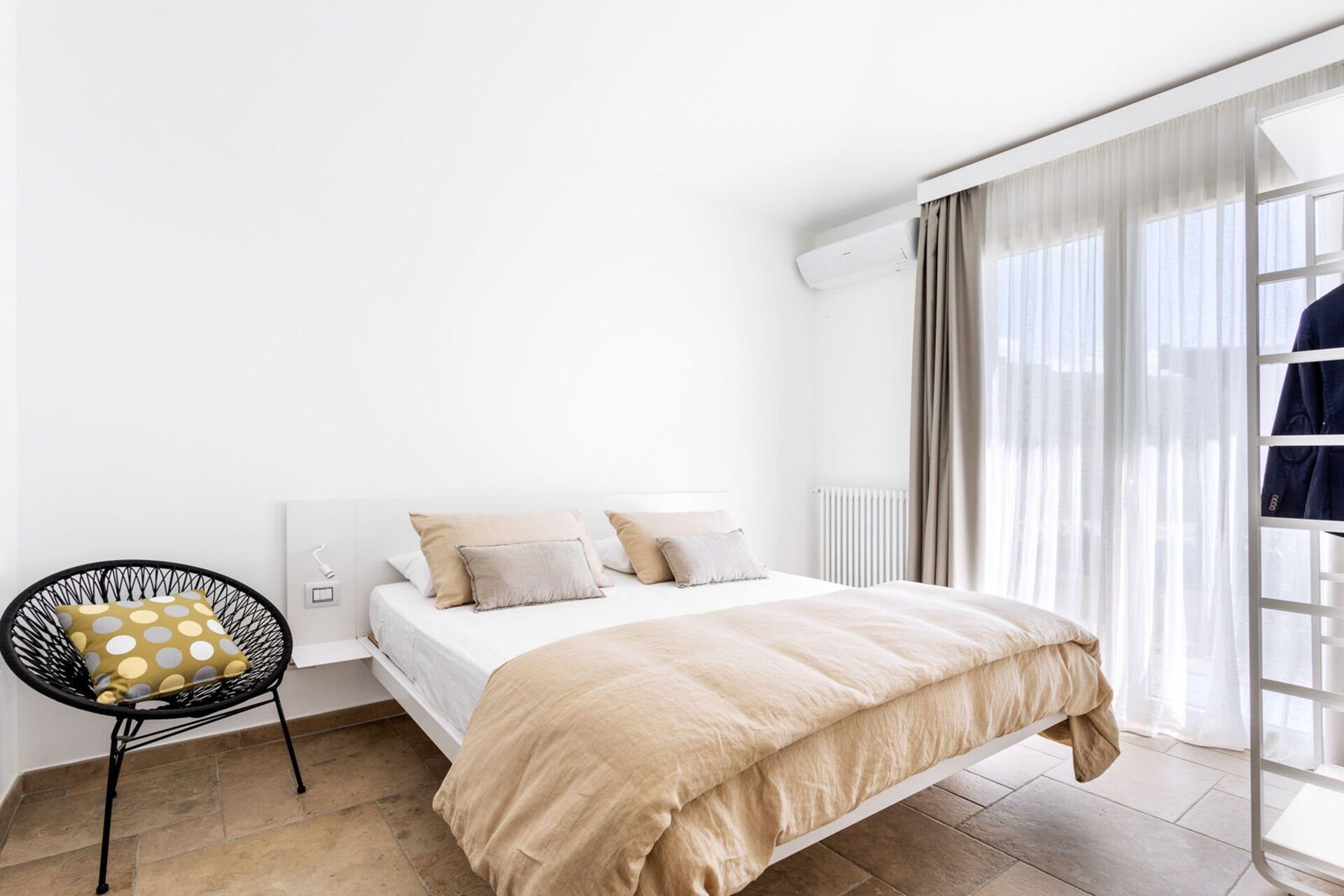 Premier étage: (accessible uniquement depuis l’extérieur et non reliée au reste de la villa): suite avec coin cuisine (plaque de cuisson, congélateur, réfrigérateur, machine à café américain), lit double (air conditionné) et salle de bain avec douche.