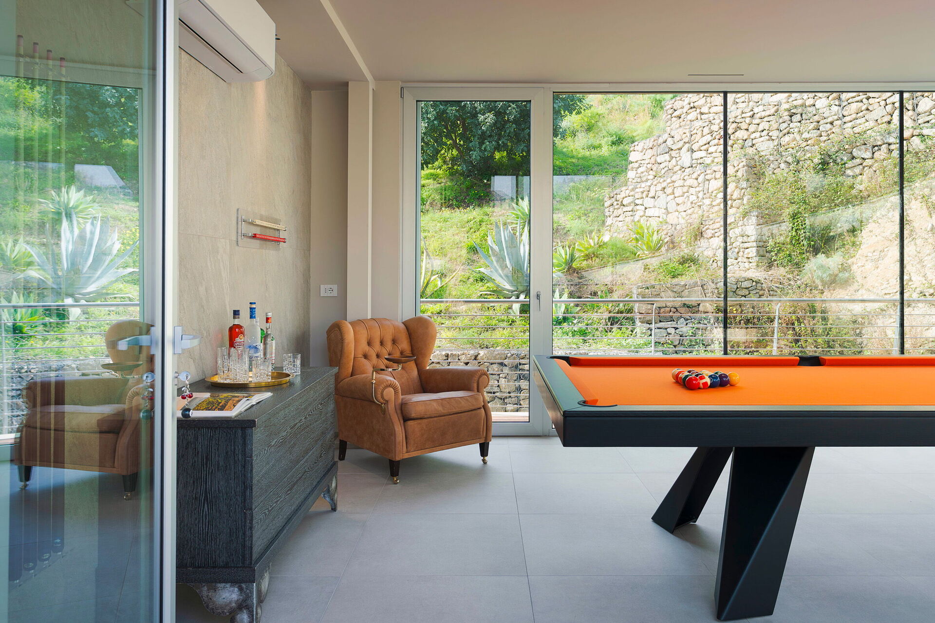 La villa est répartie sur quatre niveaux: les intérieurs confortables sont meublés dans un style moderne et équipés de tout confort (ascenseur, air conditionné, internet Wi-Fi, télévision). Au total, elle dispose de 10 chambres, chacune avec sa propre salle de bain privée, et de grands espaces communs, dont quatre espaces de vie avec cuisine, salle à manger et salon, ainsi qu'un espace bien-être avec salle de sport et sauna. Cette villa peut accueillir confortablement jusqu'à 20 personnes.