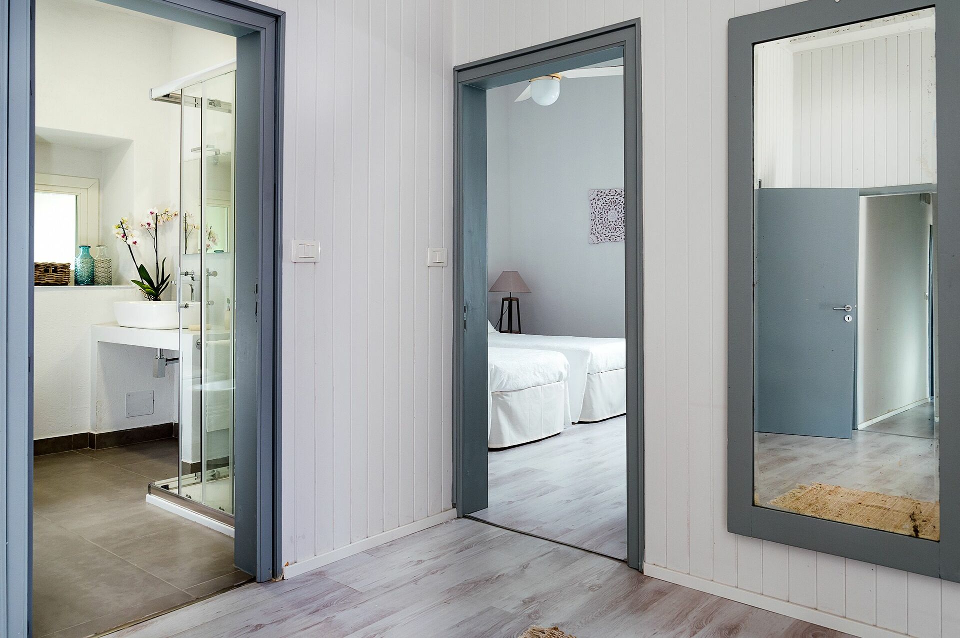 Rez-de-chaussée: entrée, séjour, salle à manger avec cuisine, buanderie, 2 chambres doubles toutes deux avec salle de bain privée avec douche, 1 chambre double, 1 chambre avec 2 lits simples, 1 salle de bain avec douche.