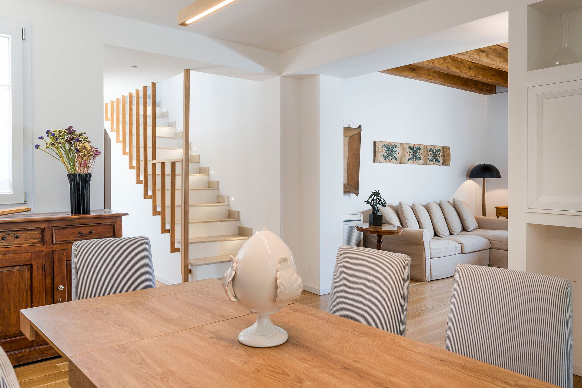 Rez-de-chaussée : salon (cheminée) avec cuisine (four, réfrigérateur, congélateur, lave-vaisselle, plaques de cuisson, micro-ondes, grille-pain, machine à café expresso) et coin repas, buanderie, chambre double (taille du lit : 160x200 cm), salle de bain avec douche, chambre avec lit à la française, wc.
