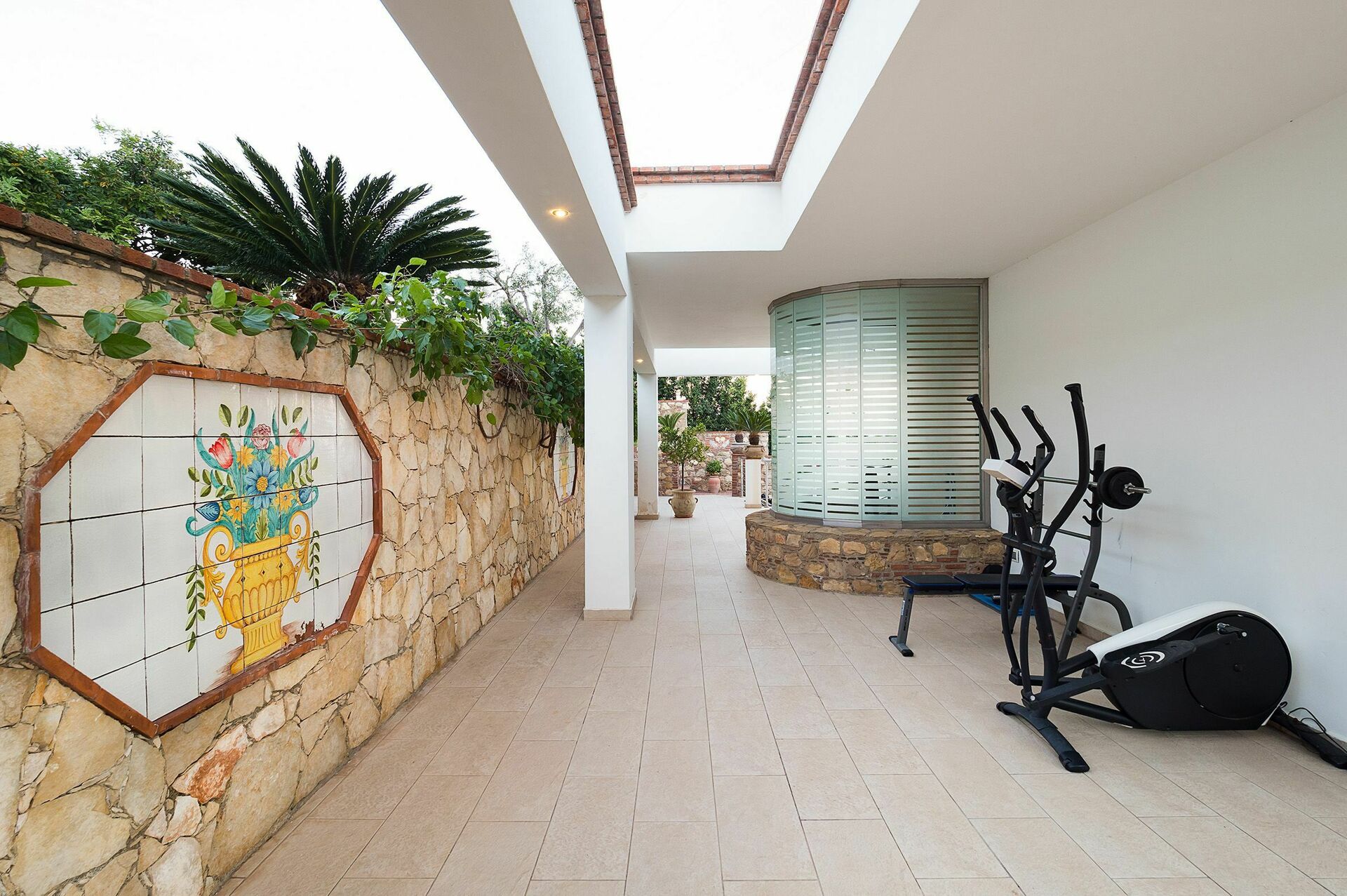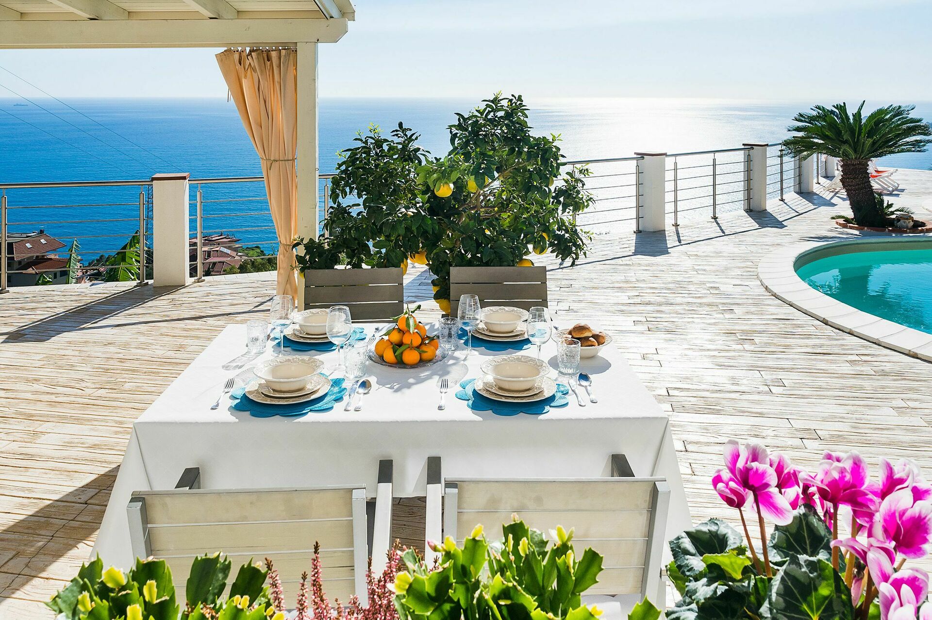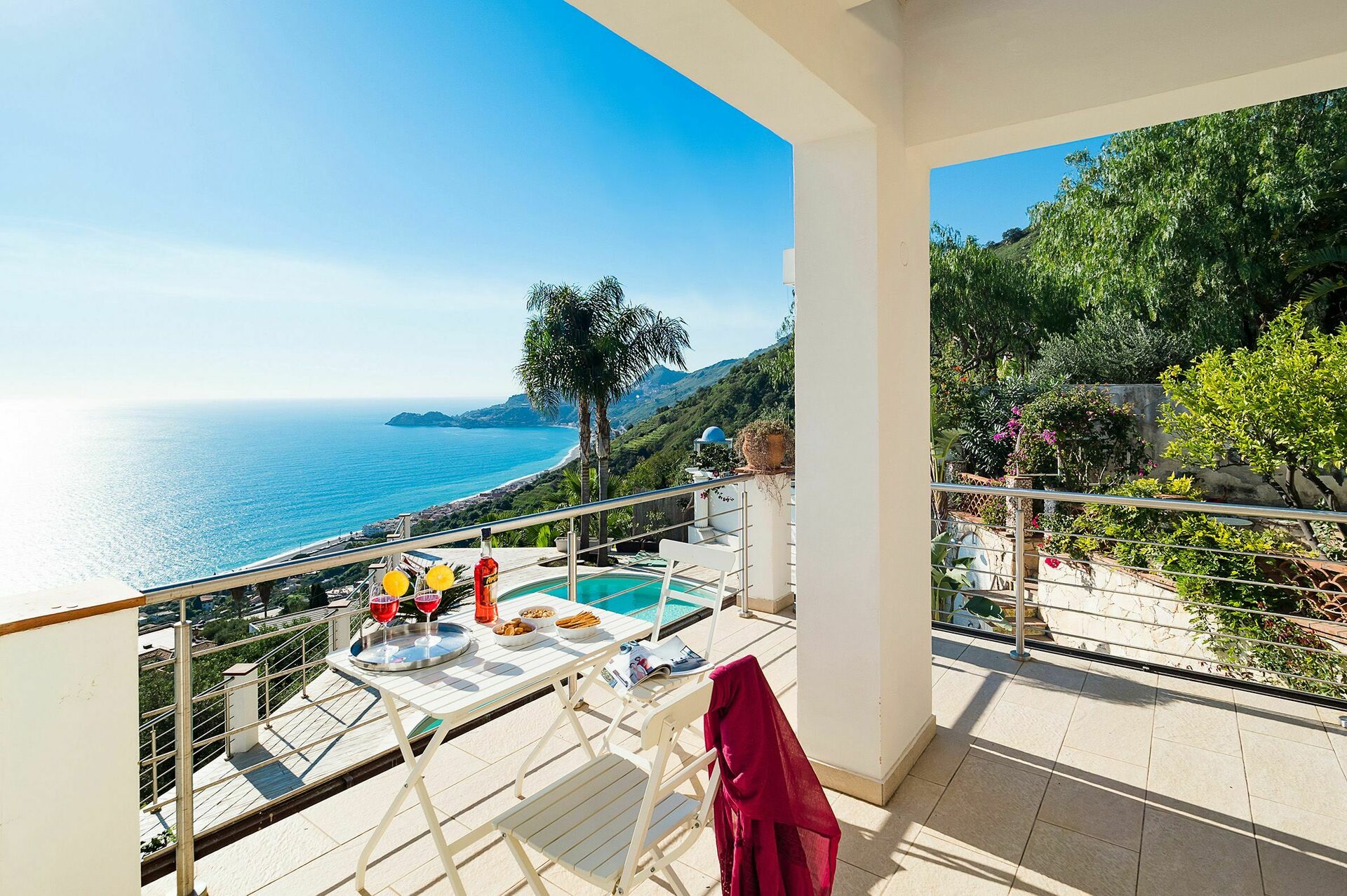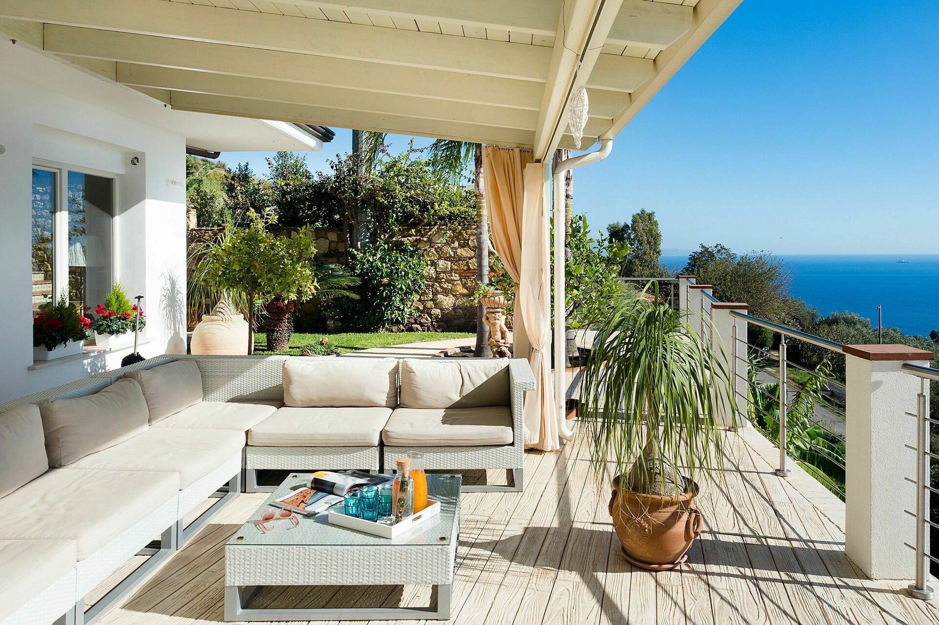 Entourée d'un jardin méditerranéen soigné et luxuriant, cette villa de vacances exclusive bénéficie d'une position panoramique avec une vue imprenable sur la mer et la baie de Taormina, à admirer en toute détente du bord de la piscine et de ses grandes terrasses. Un espace équipé de tables et de chaises vous permet de manger confortablement à l'extérieur en profitant de la brise marine et de la vue panoramique. De nombreux coins salons extérieurs équipés de canapés et de tables permettent aux hôtes de se détendre en compagnie de leur famille ou de leurs amis en toute intimité.