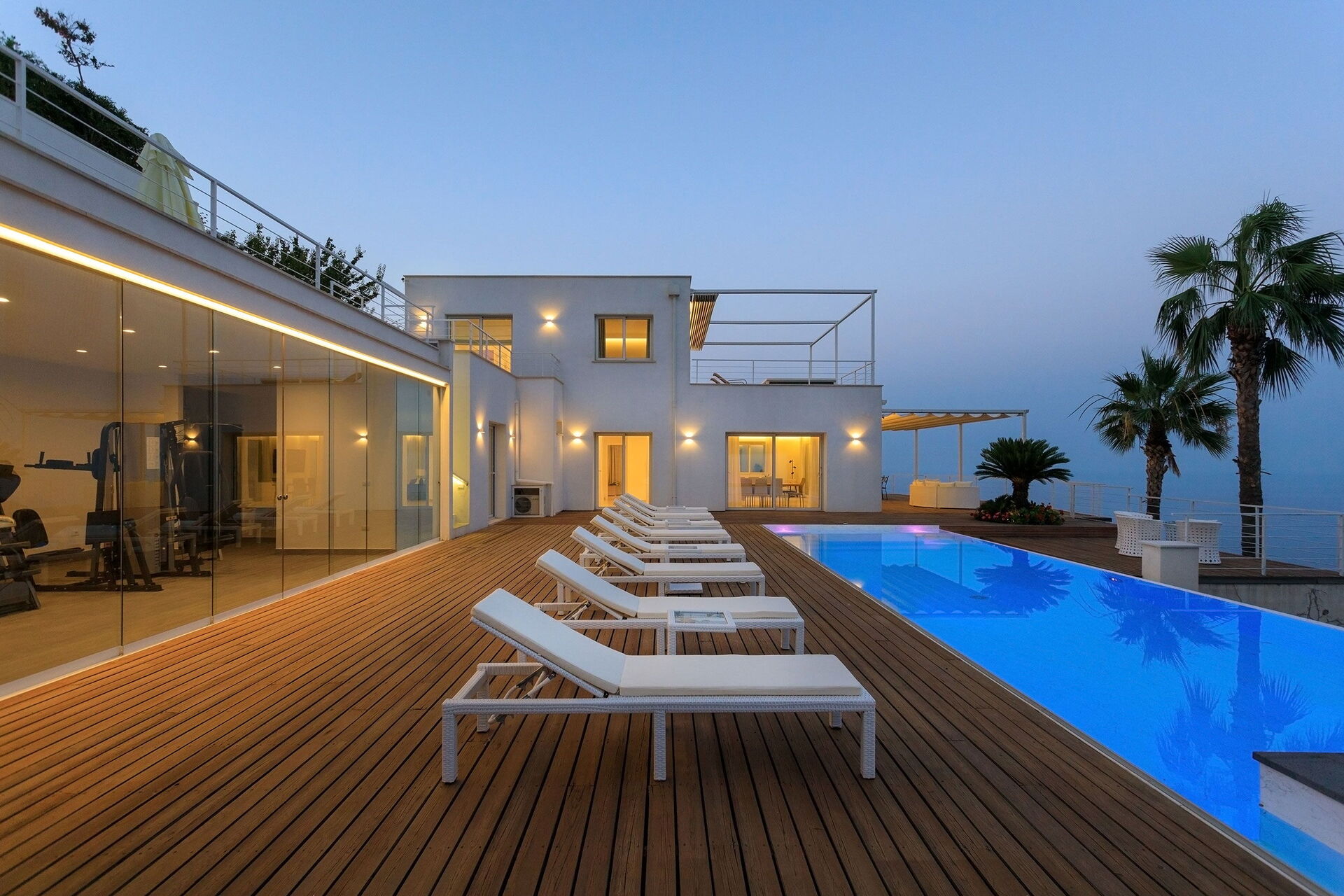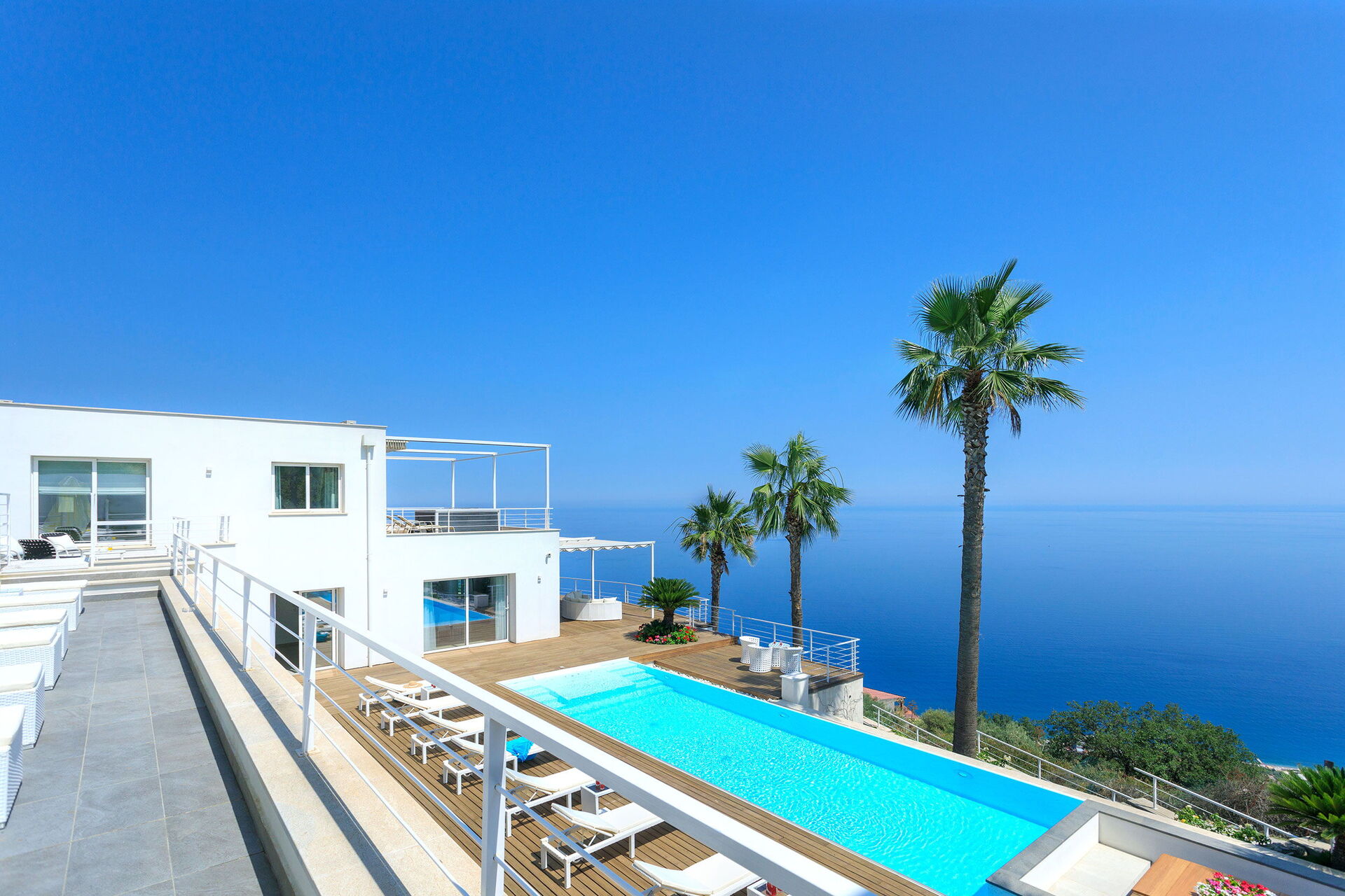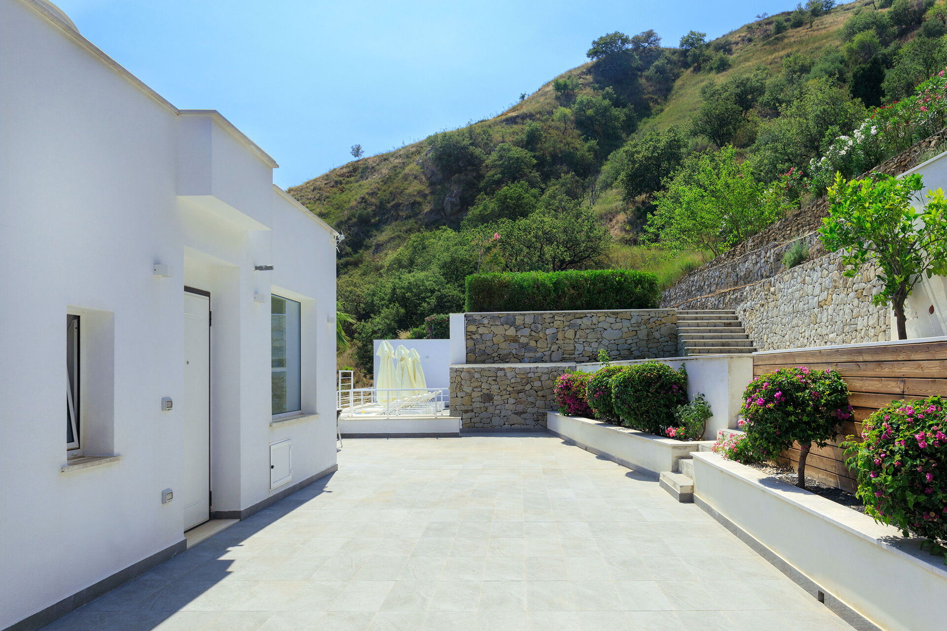 Les zones extérieures panoramiques offrent beaucoup d'espace pour que les hôtes puissent profiter d'un séjour agréable en famille ou entre amis, en se relaxant sur le patio équipé pour les repas en plein air ou dans le grand espace piscine avec une vue spectaculaire sur la mer, idéal pour passer des moments inoubliables sous le soleil sicilien.