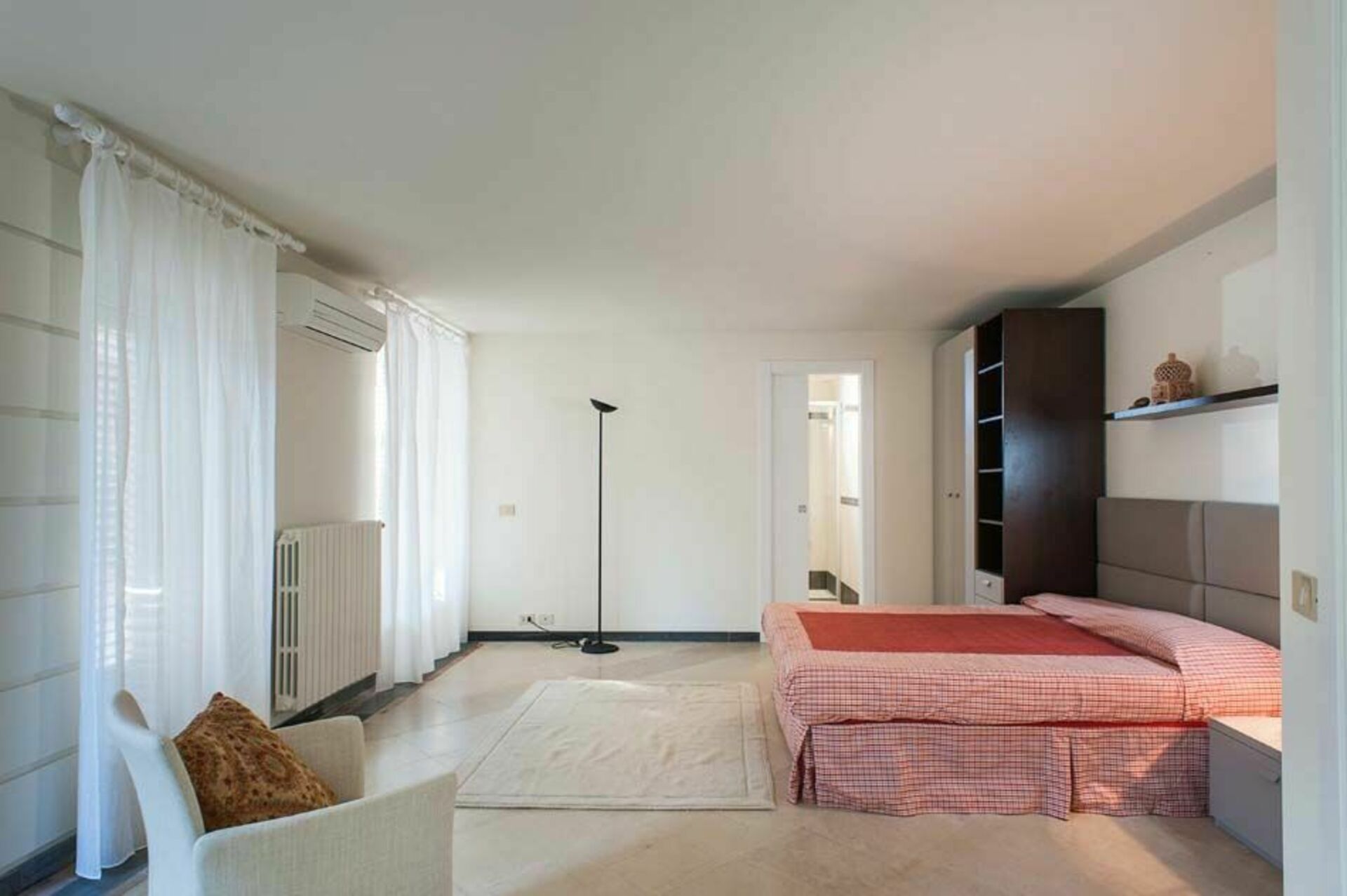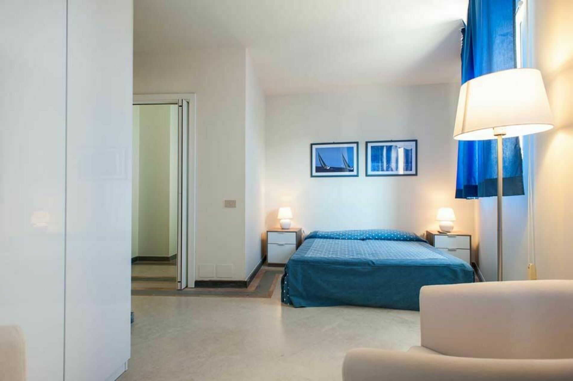 Premier étage (accès également de l’extérieur): séjour avec terrasse, cuisine, une chambre double avec petite terrasse, une chambre avec 2 lits à une place et petite terrasse, salle de bains avec douche.