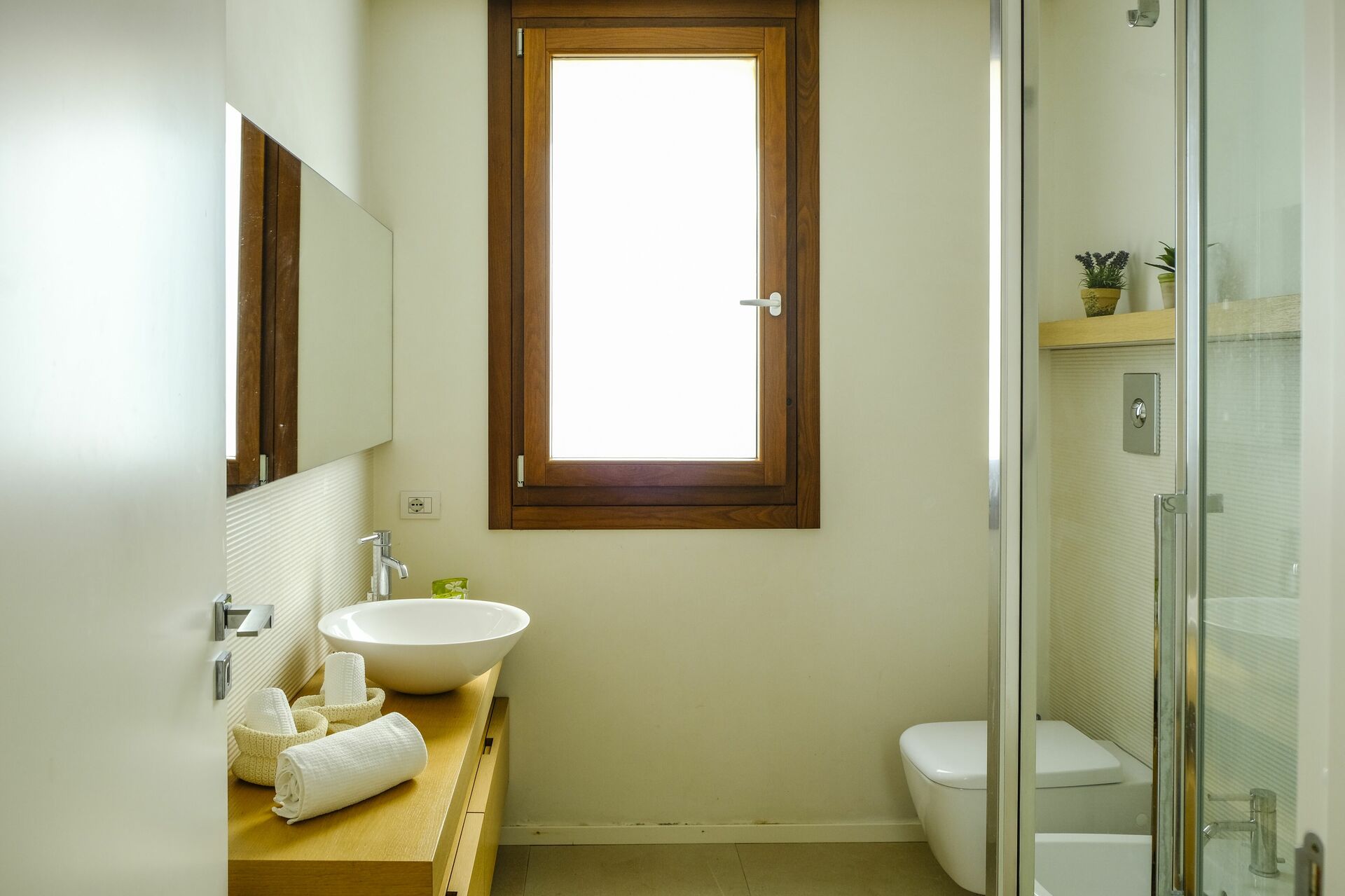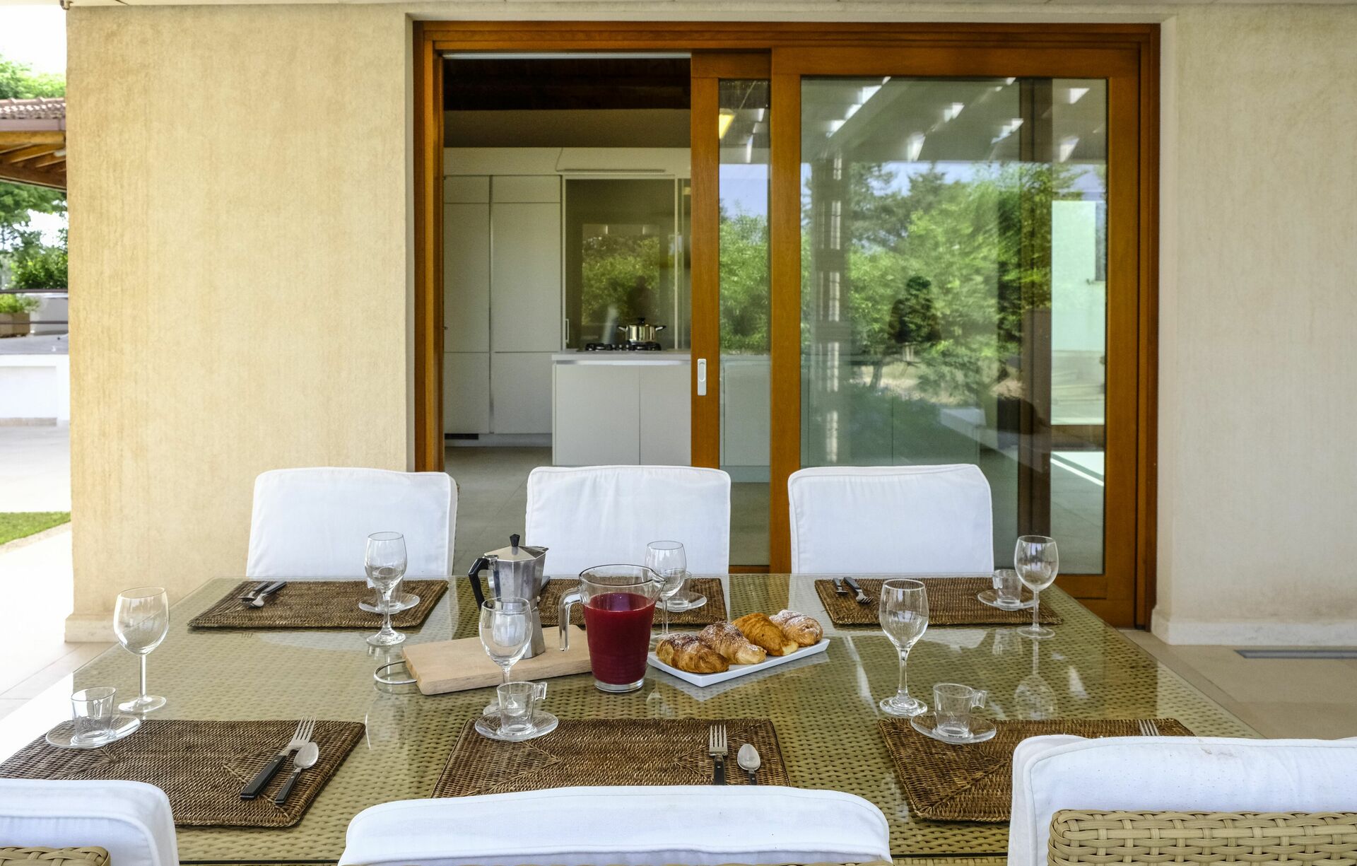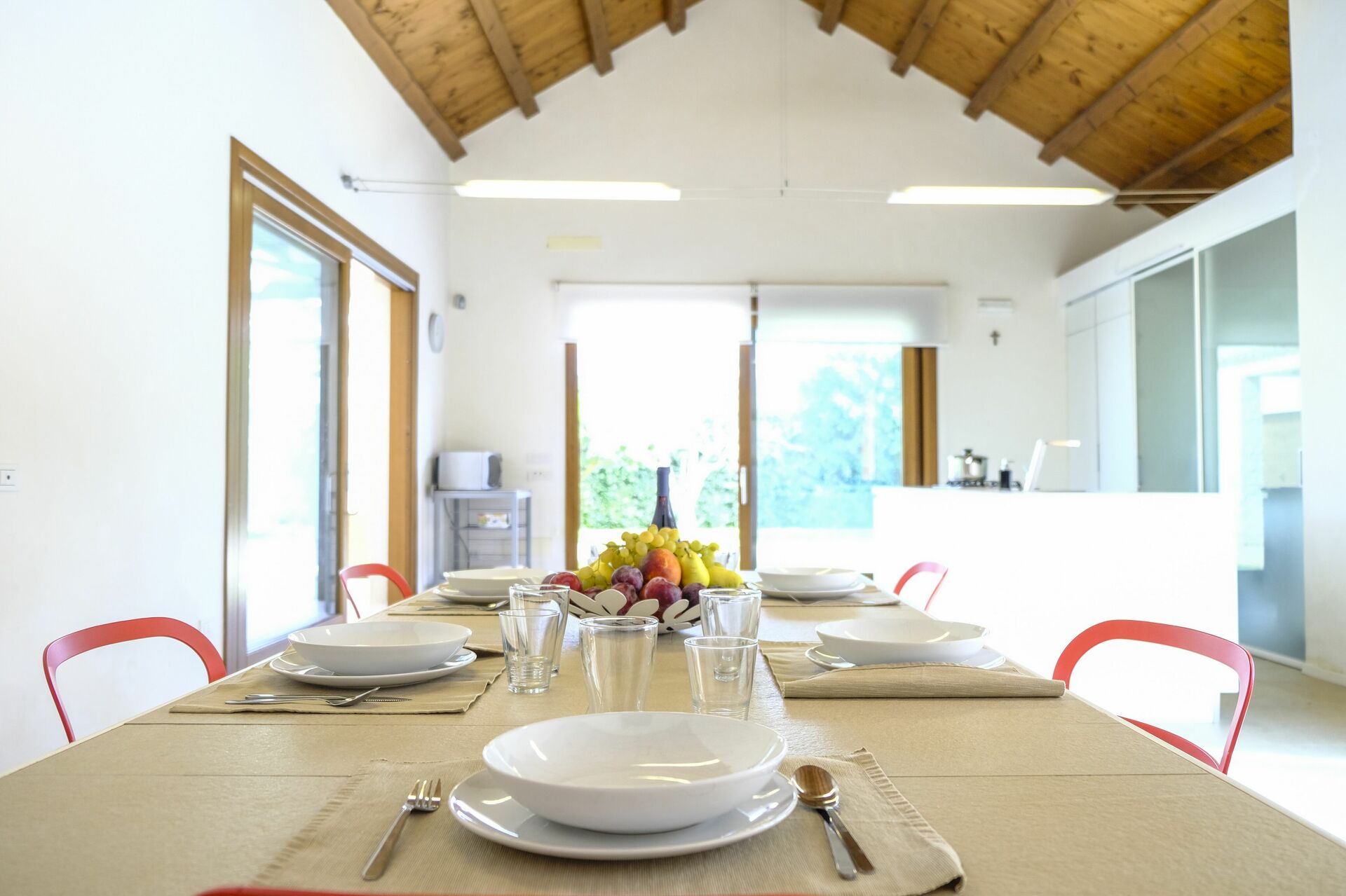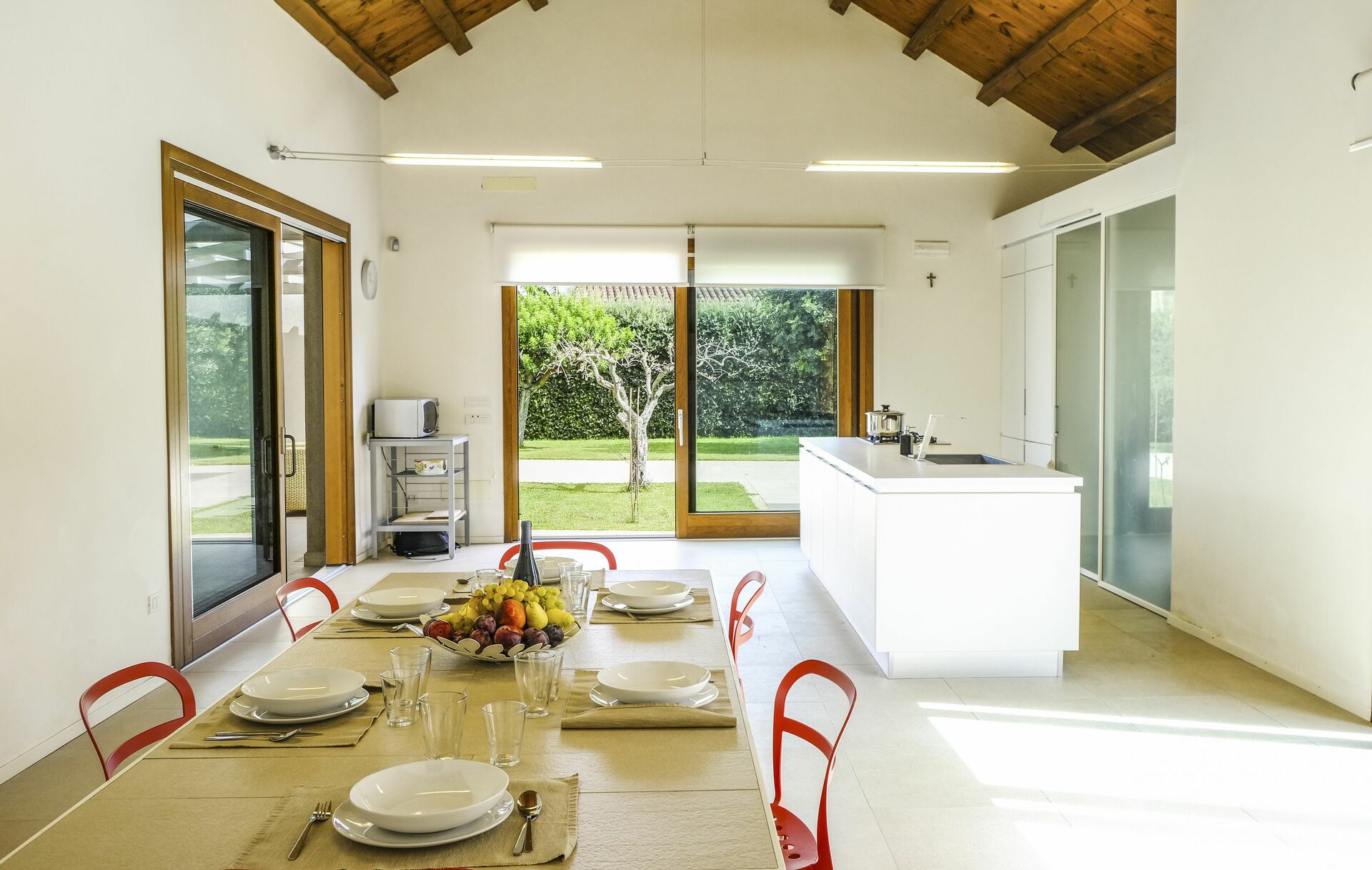 La villa est sur un seul niveau et se compose de deux parties: dans le corps principal il y a 4 chambres à coucher tandis que le séjour avec une cinquième chambre à coucher sont dans le loft que les propriétaires ont rénové en respectant le caractère original. Le mobilier raffiné et essentiel crée une atmosphère accueillante et confortable.