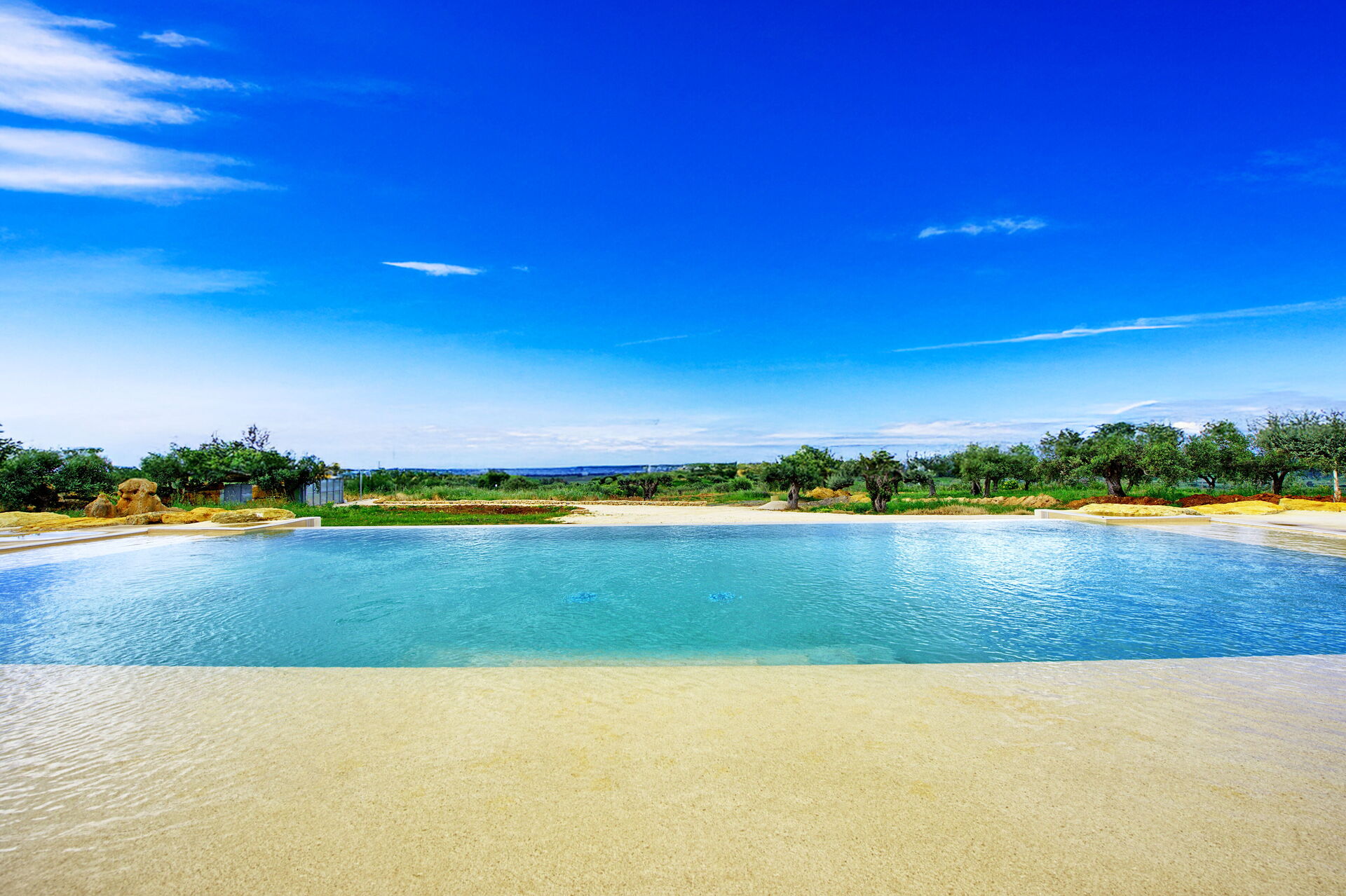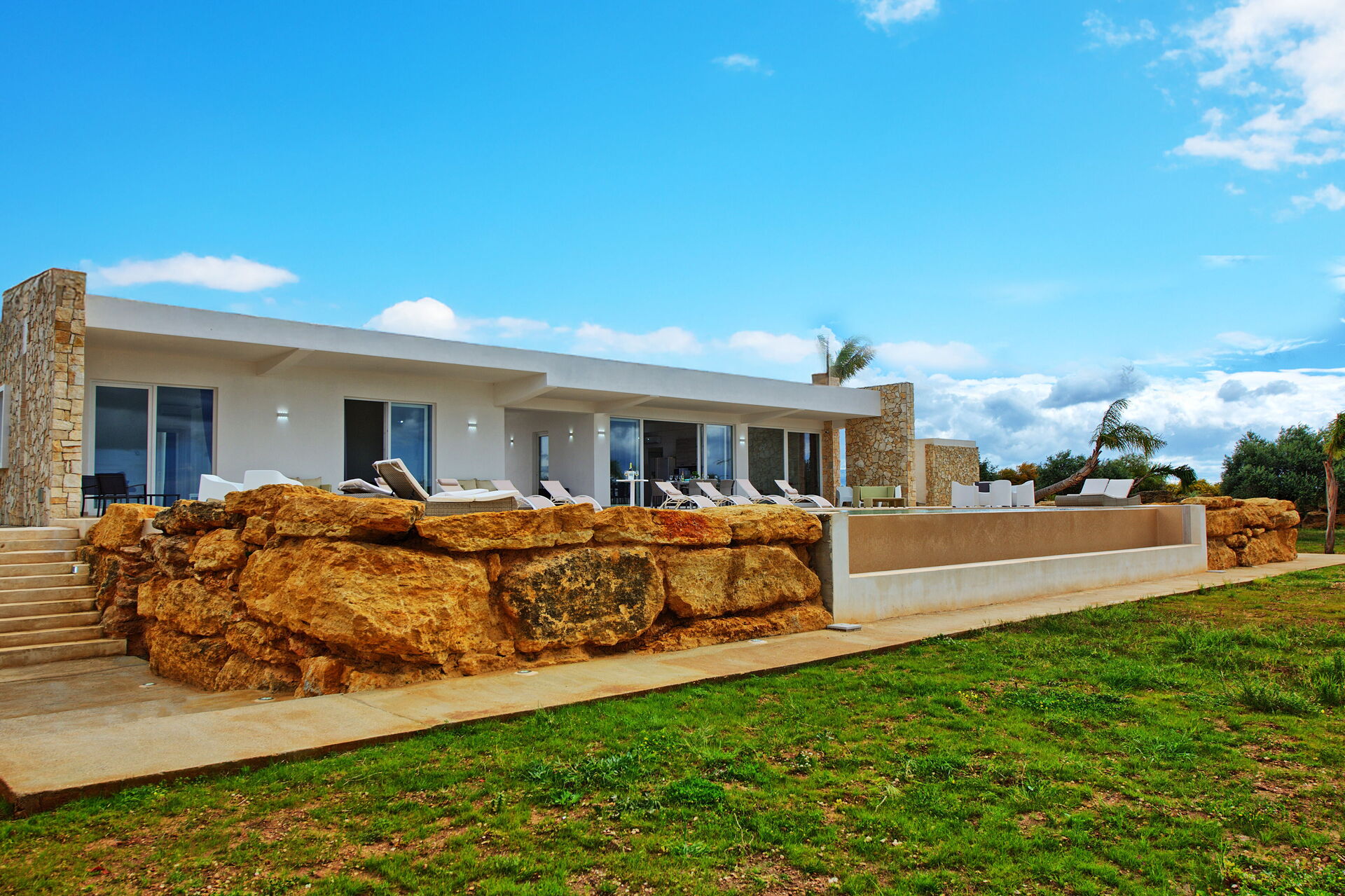 Upon approaching the villa, the border of this property is lined with huge impressive boulders, then you reach a white electric gate, to welcome you into this magnificent, architecturally perfect villa! The online photos are good, but seeing it in person, is visually stunning. It exceeded our expectations. The pool overlooking the countryside -to the ocean-is serene and beautiful. There’s a small garden with fresh vegetables, to be enjoyed by all. It’s in a very private area, quiet location, surrounded by vineyards and olive trees. Plenty of outdoor seating areas to lounge around….