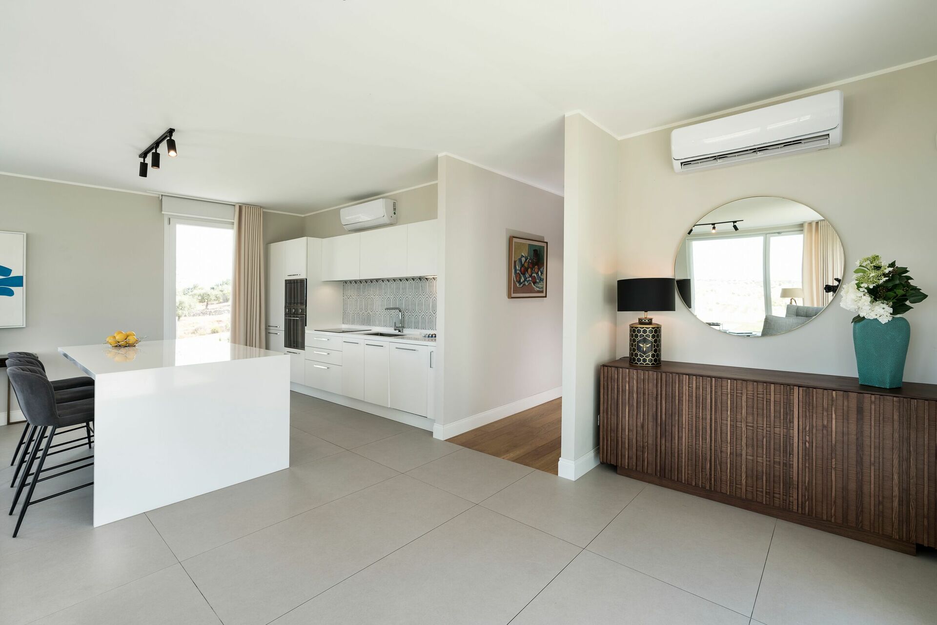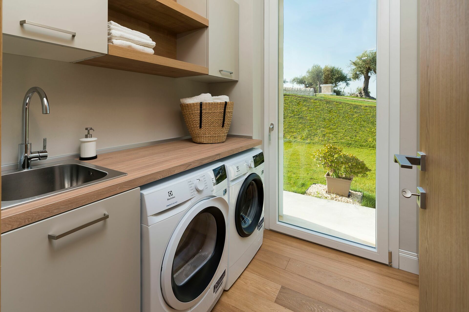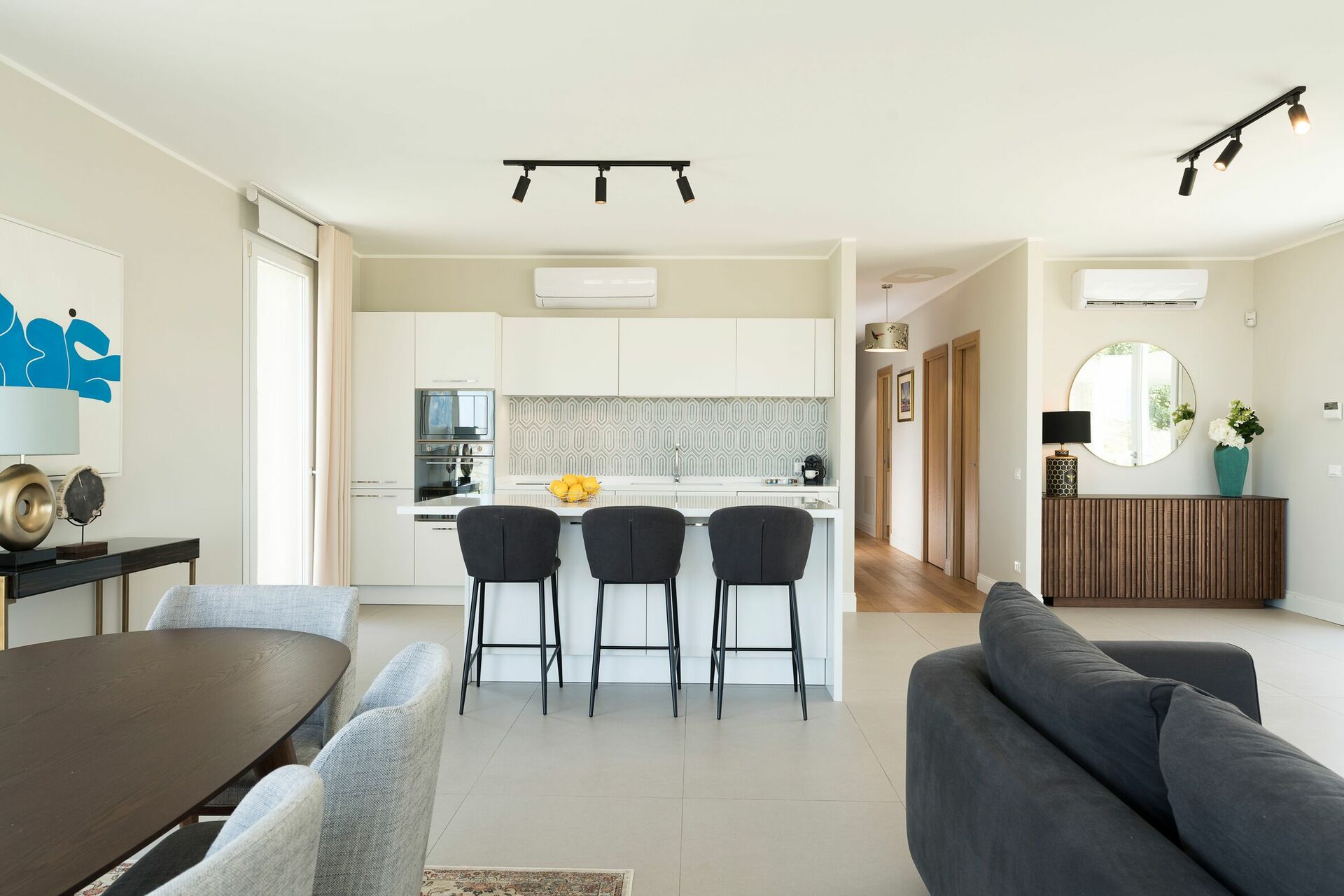 Rez-de-chaussée : séjour avec zone repas et cuisine (four, freezer, micro-ondes, cafetières, lave-vaisselle), buanderie, WC (lavabo), une chambre double (lit king size) avec salle de bains privée avec baignoire, 2 chambres doubles chacune avec salle de bains privée avec douche.