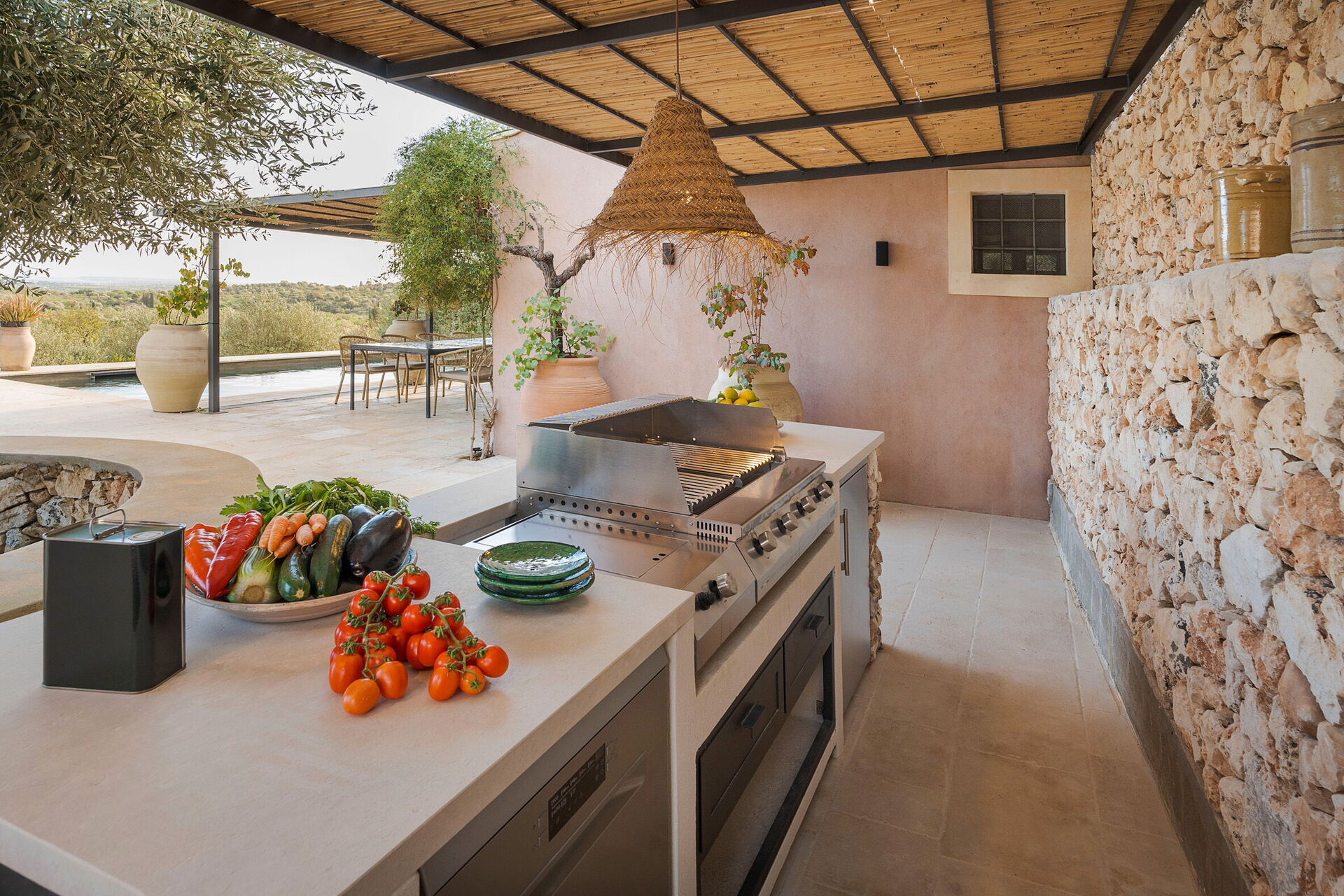 - véranda aménagée avec barbecue, table et chaises pour les repas en plein air