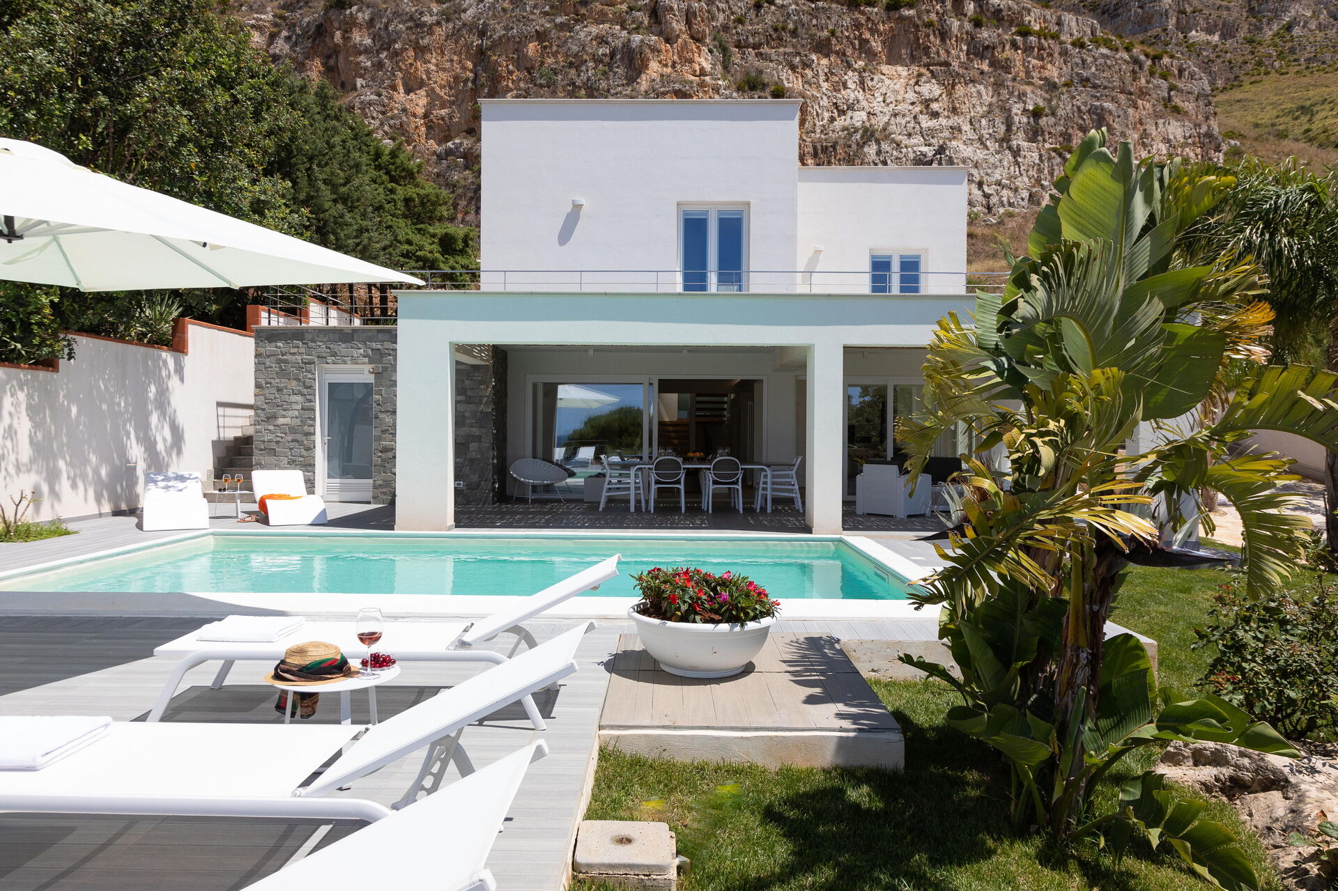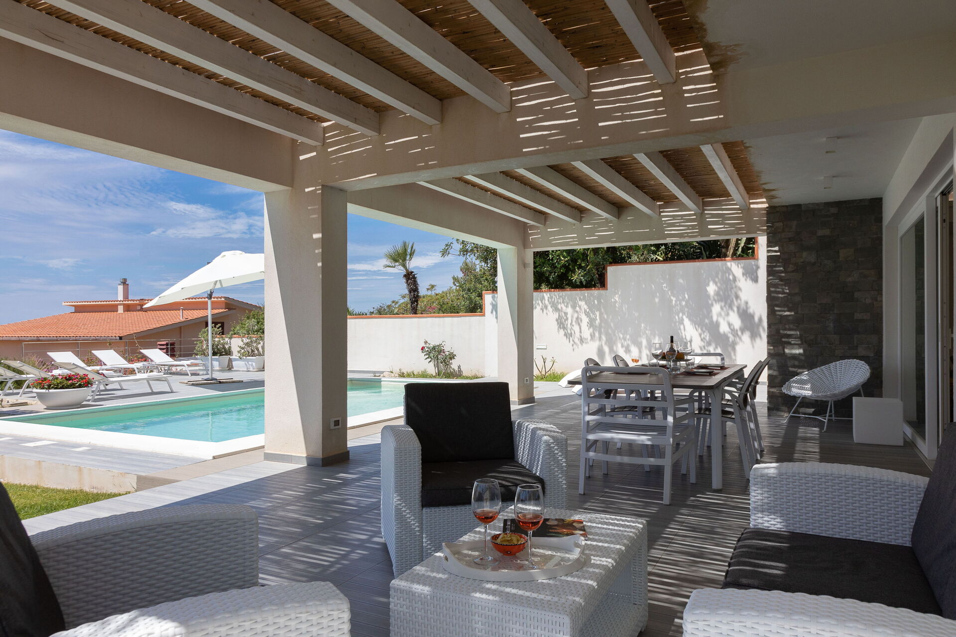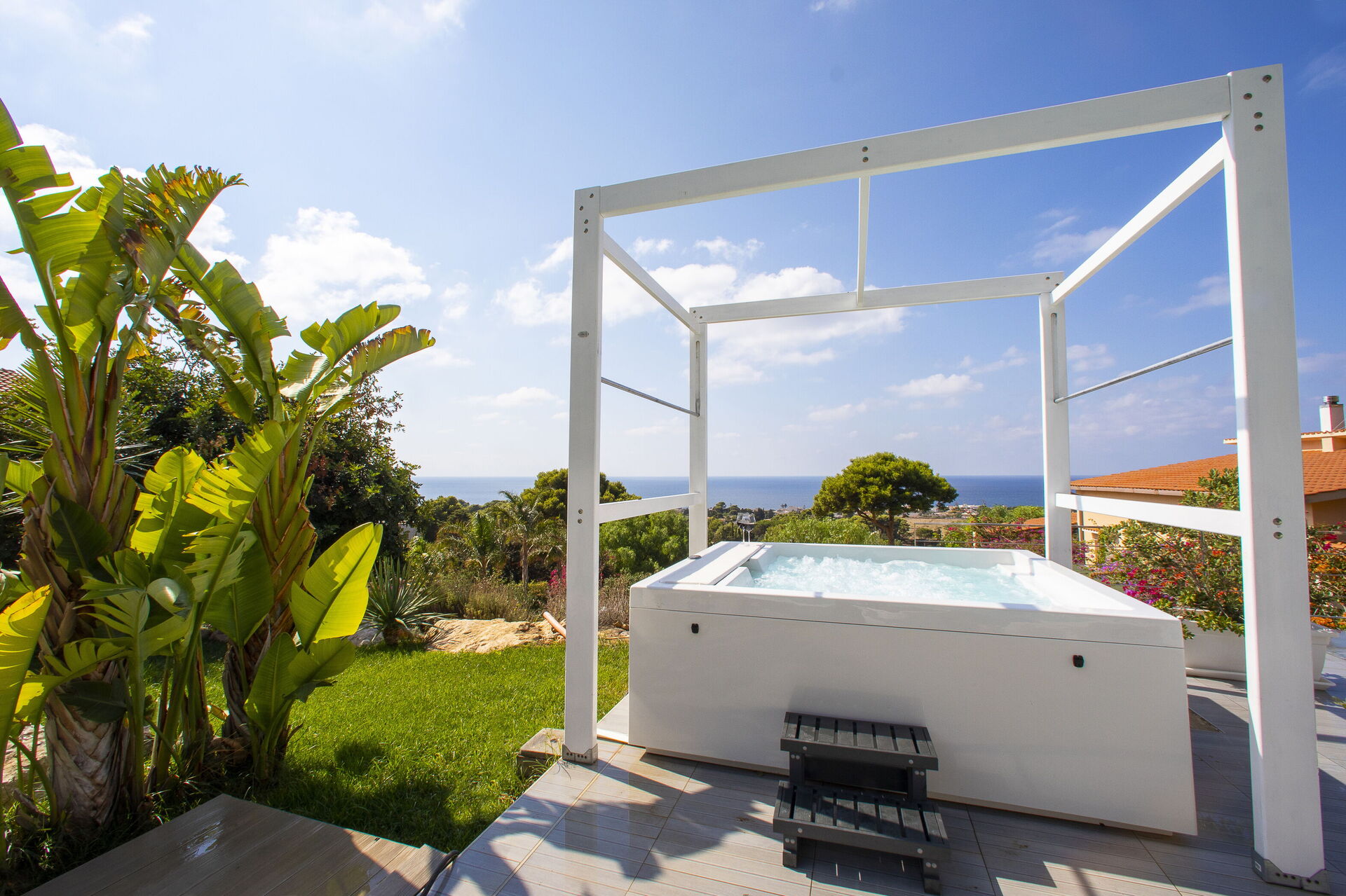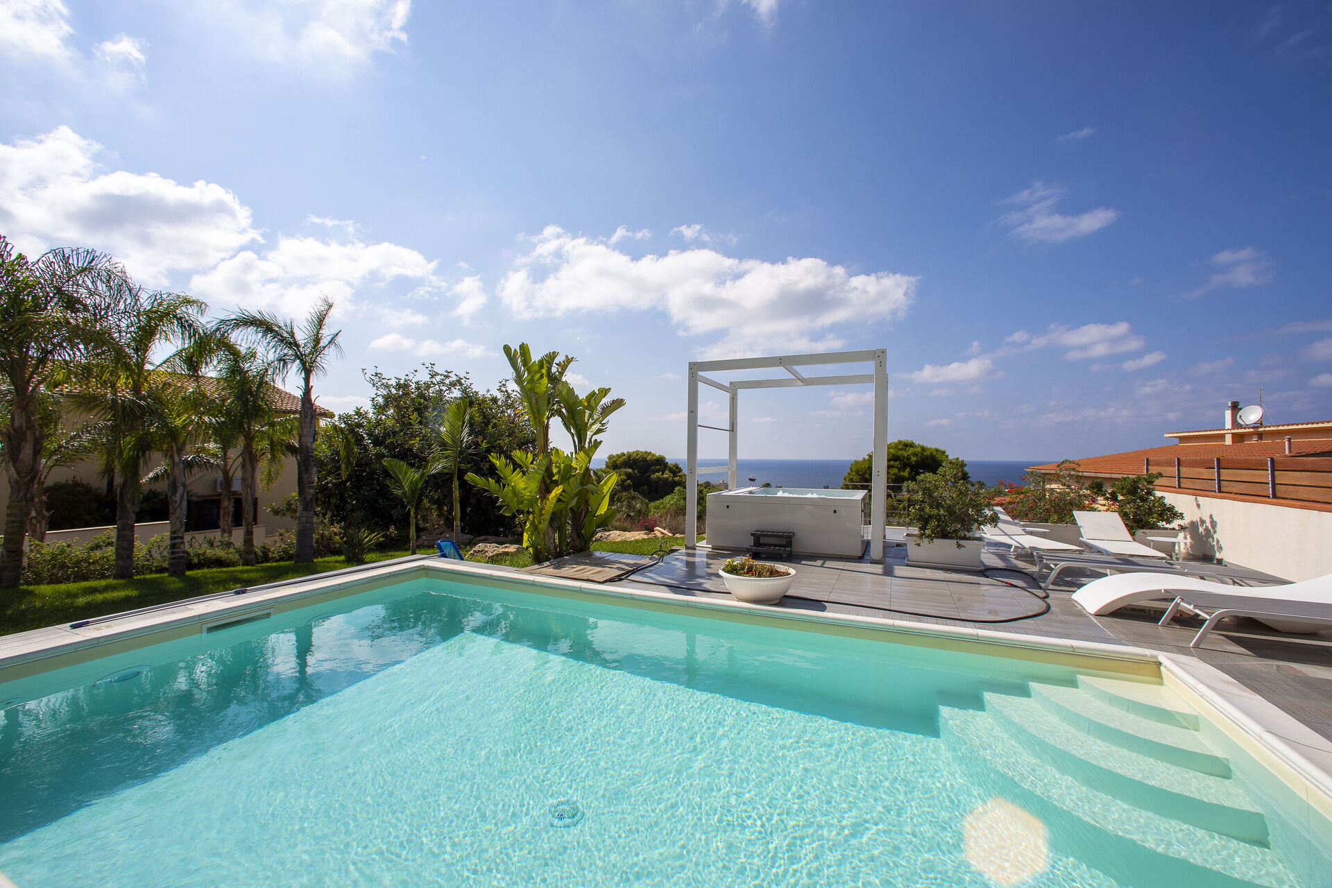 Le beau jardin, rempli de plantes typiques de la région, abrite une élégante piscine et un tout nouveau jacuzzi à usage exclusif des hôtes de la villa; lesquels pourront profiter du soleil sicilien sur les chaises longues ou se détendre sous la terrasse couverte. En outre, juste à côté de l’entrée de la villa se trouve une deuxième salle à manger avec un barbecue très équipé, parfait pour les déjeuners et les dîners en compagnie de la famille et des amis.