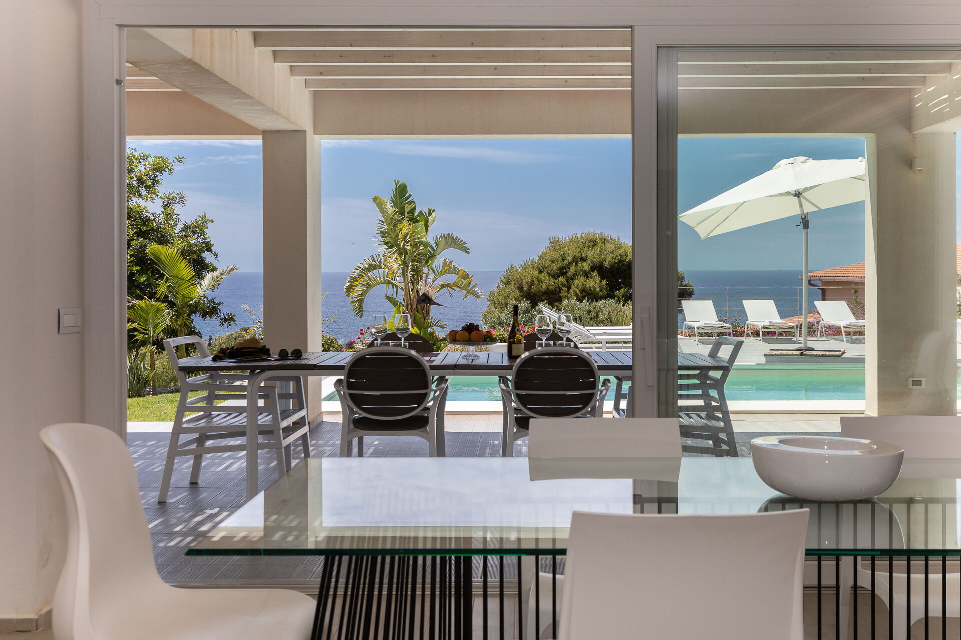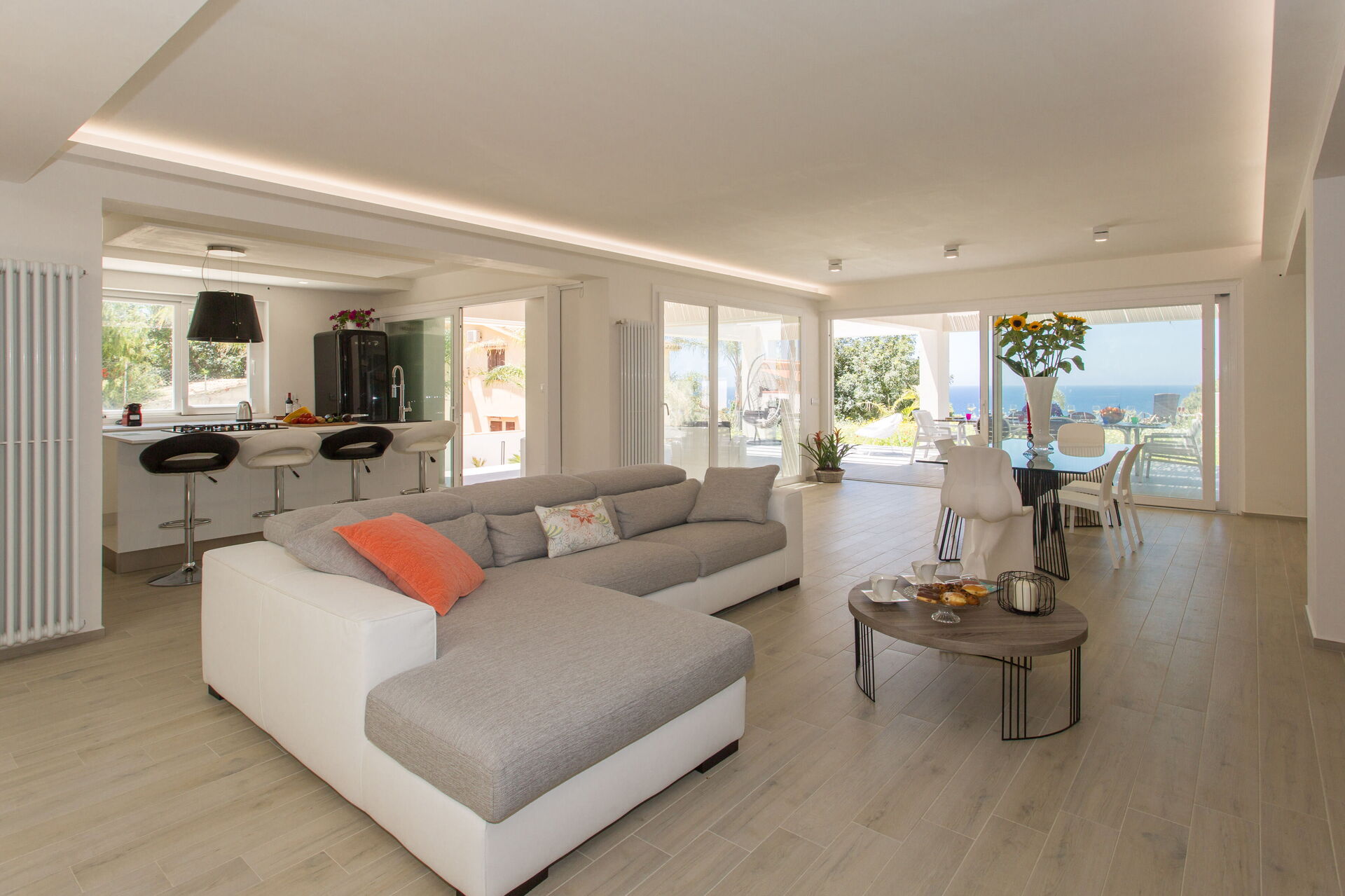 L’open space mène à la terrasse couverte avec coin repas et espace détente, au jardin, à la piscine et au jacuzzi extérieur.