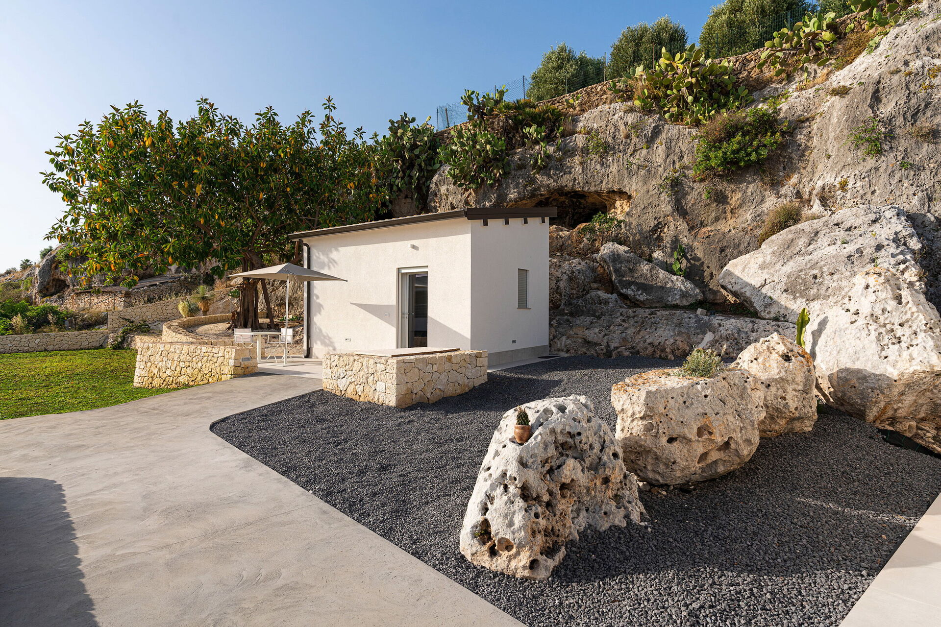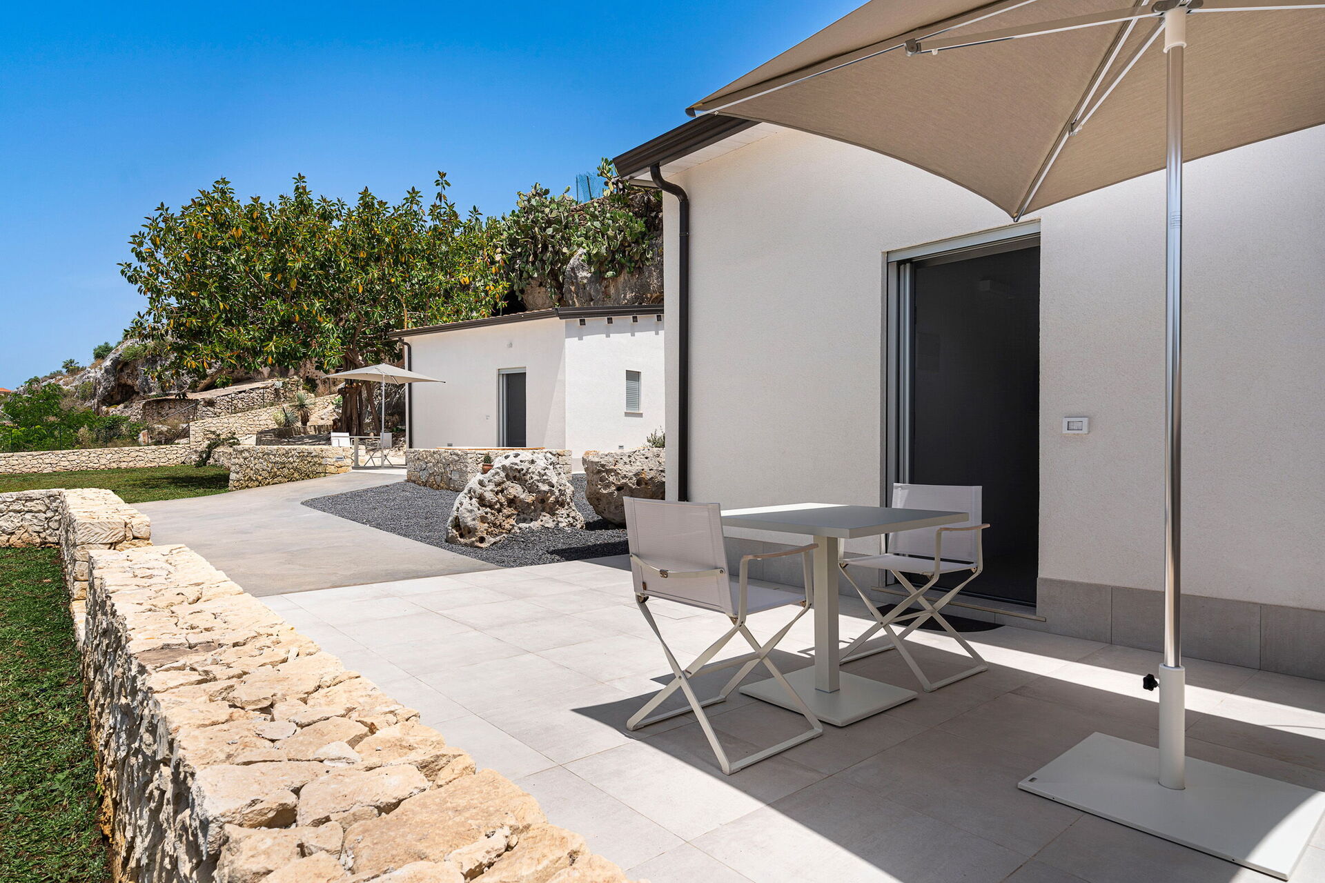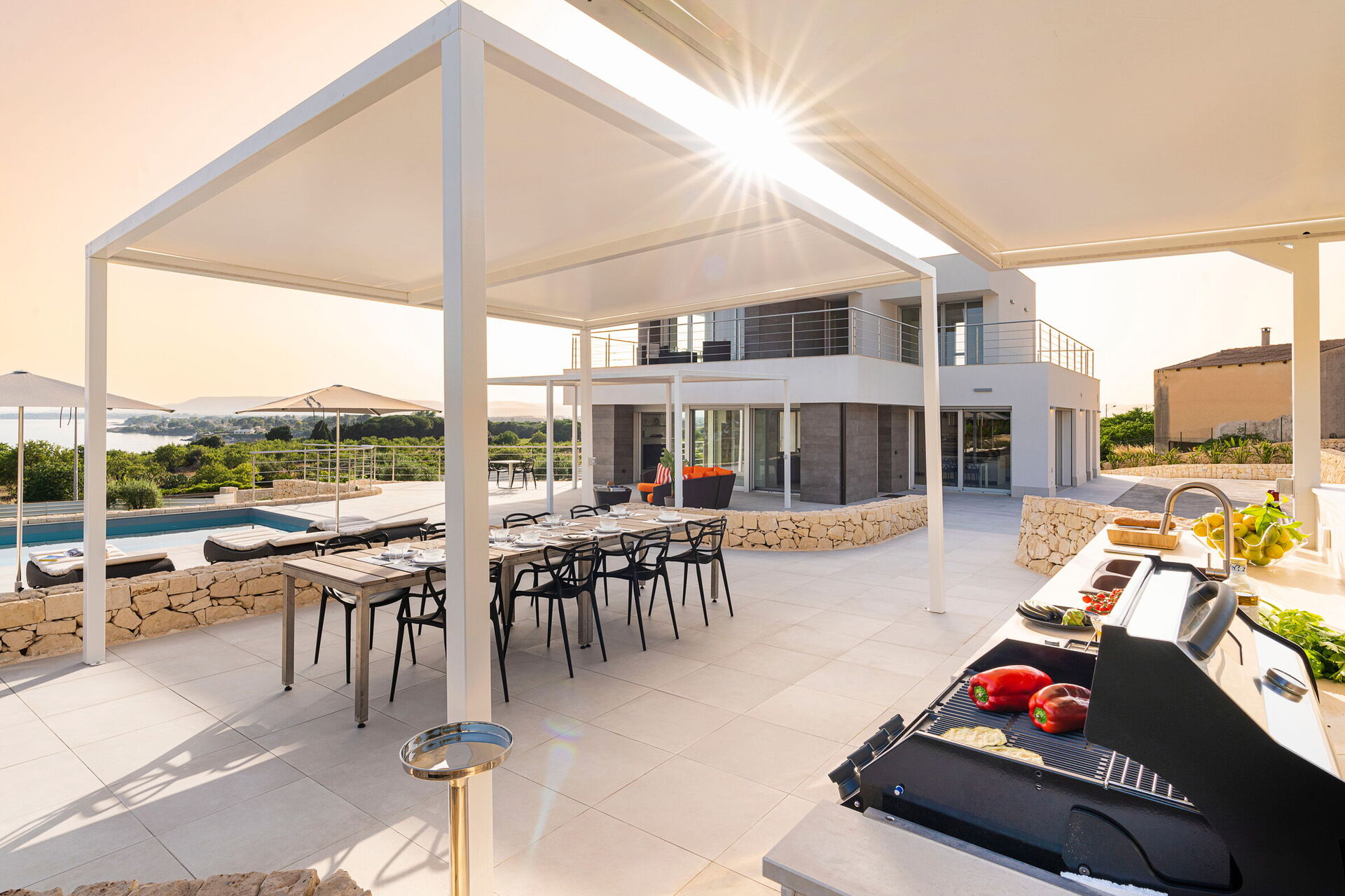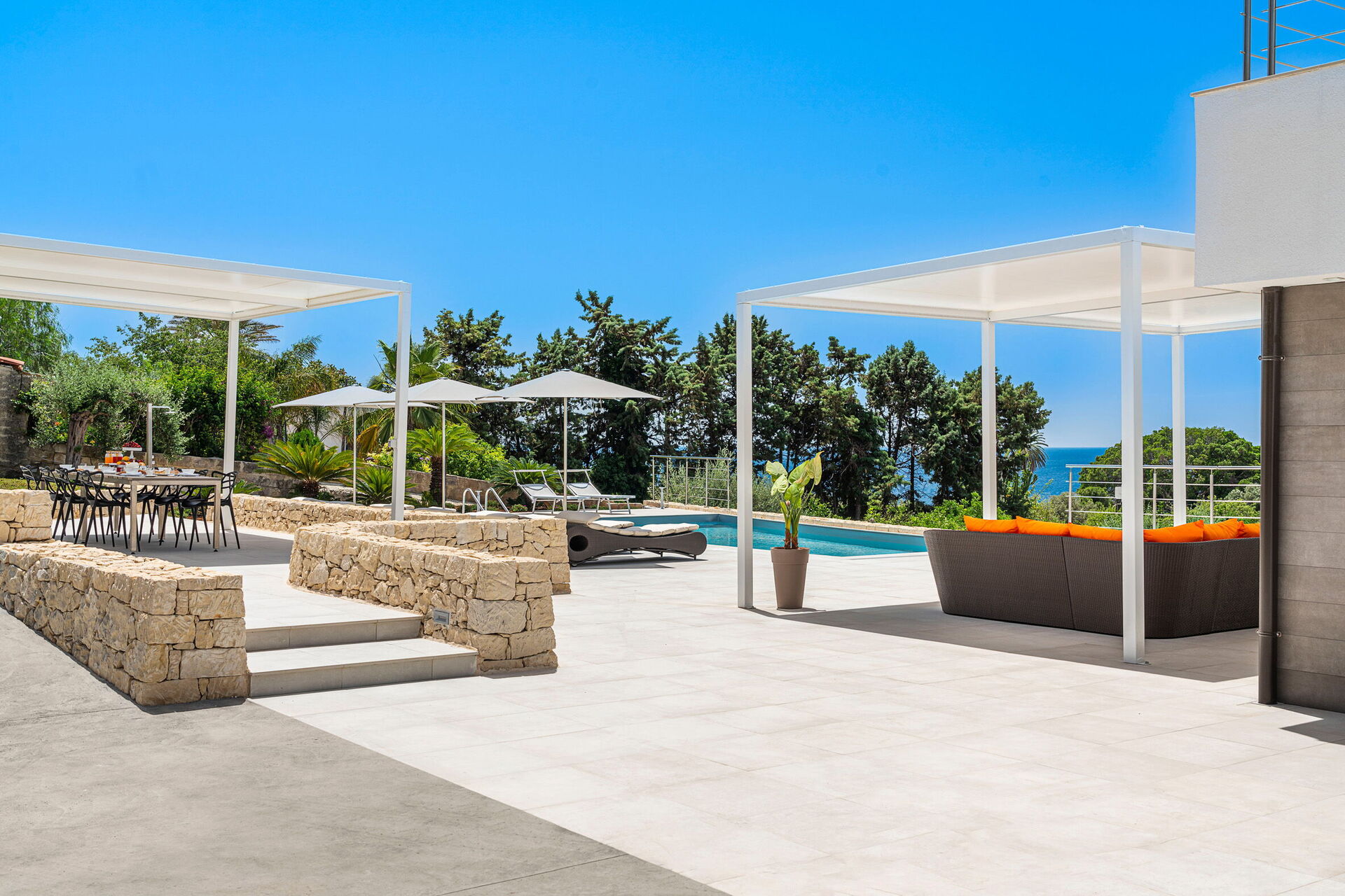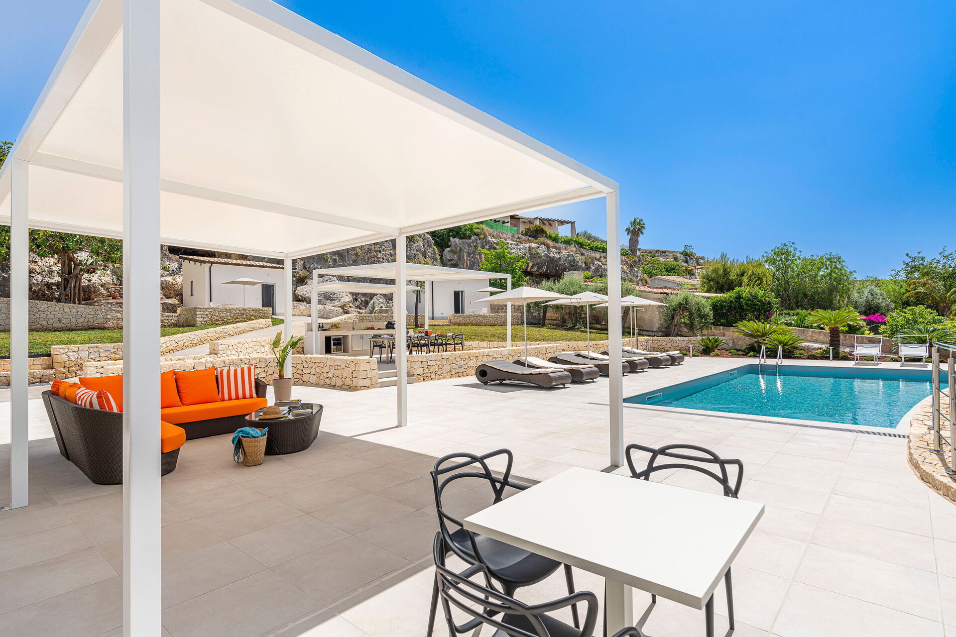 Les vastes espaces extérieurs offrent de nombreuses zones communes qui permettent aux hôtes de passer un agréable séjour en famille ou entre amis, en se relaxant sur la terrasse équipée pour les repas en plein air ou dans le grand espace piscine avec solarium, idéal pour passer des moments inoubliables sous le soleil sicilien.