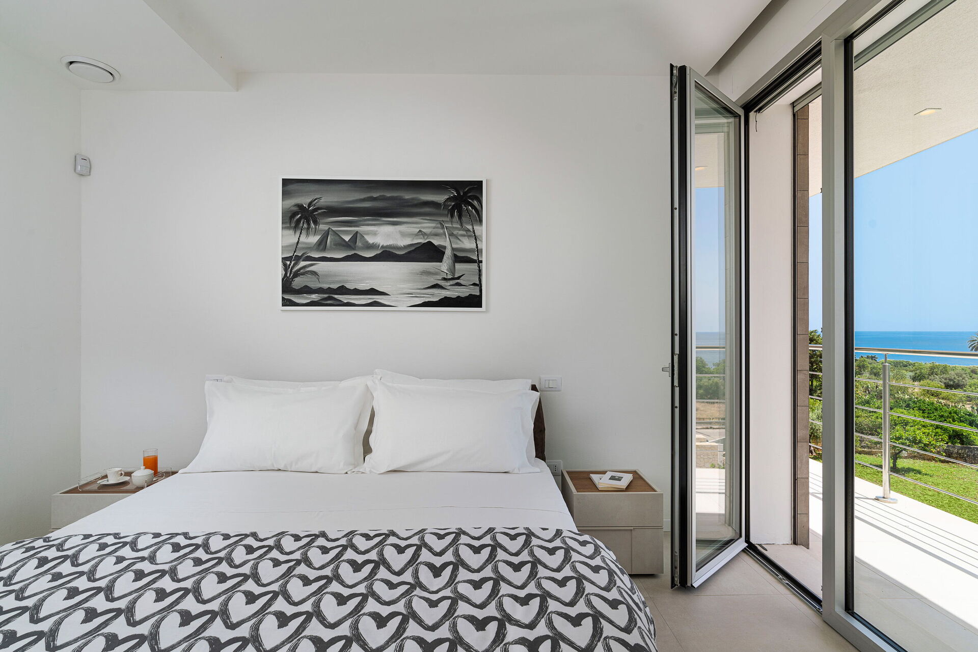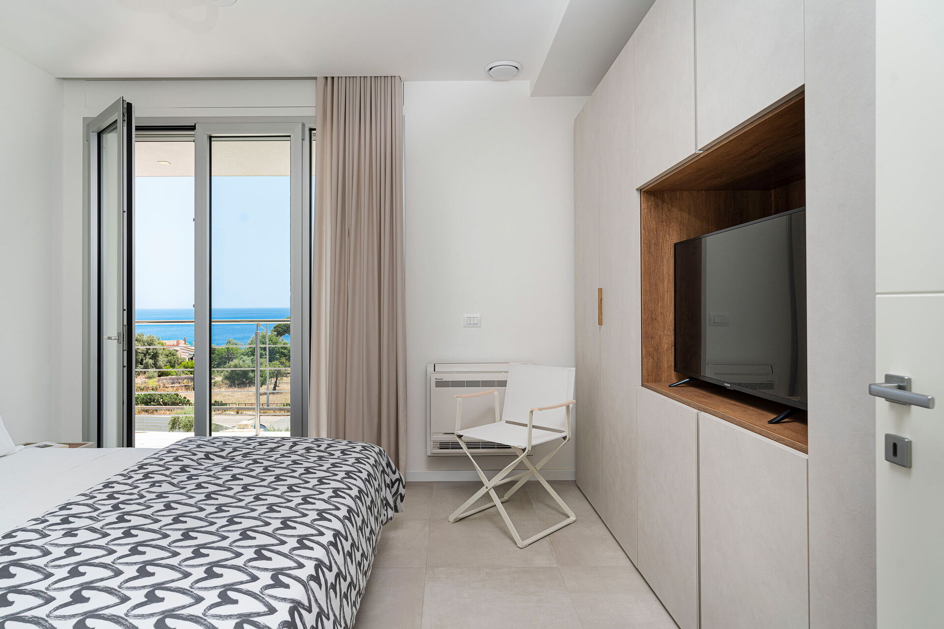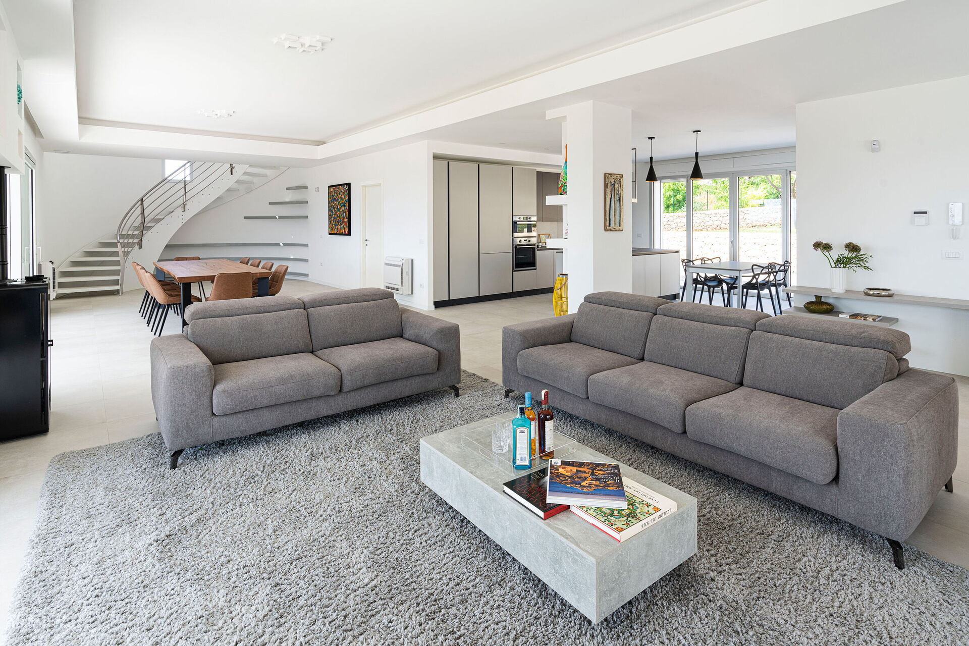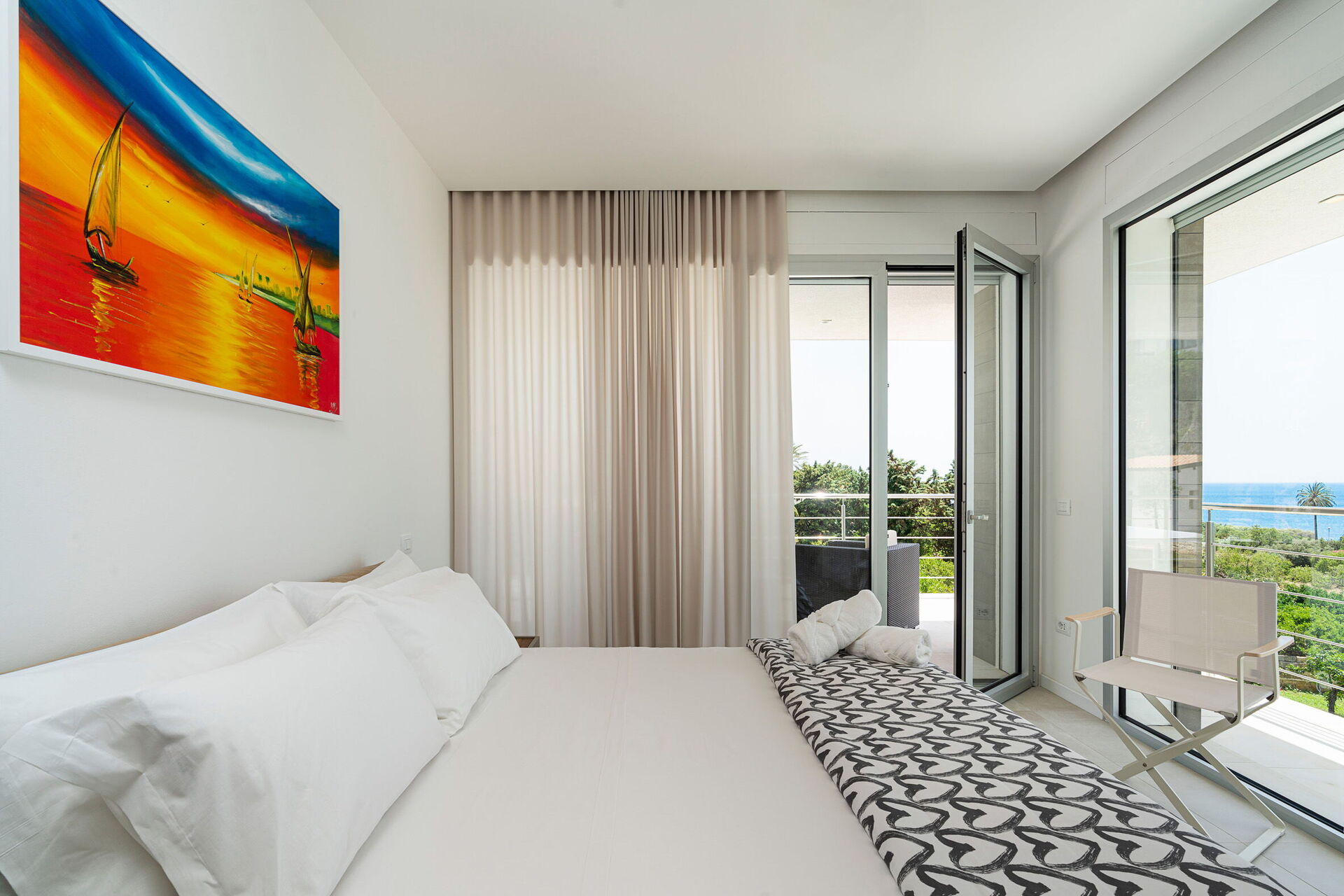 Cette villa de vacances exclusive au design contemporain jouit d'une position panoramique avec une vue sur la mer à couper le souffle, que l'on peut admirer depuis ses spacieuses terrasses et sa piscine privée chauffée purifiée au sel.
