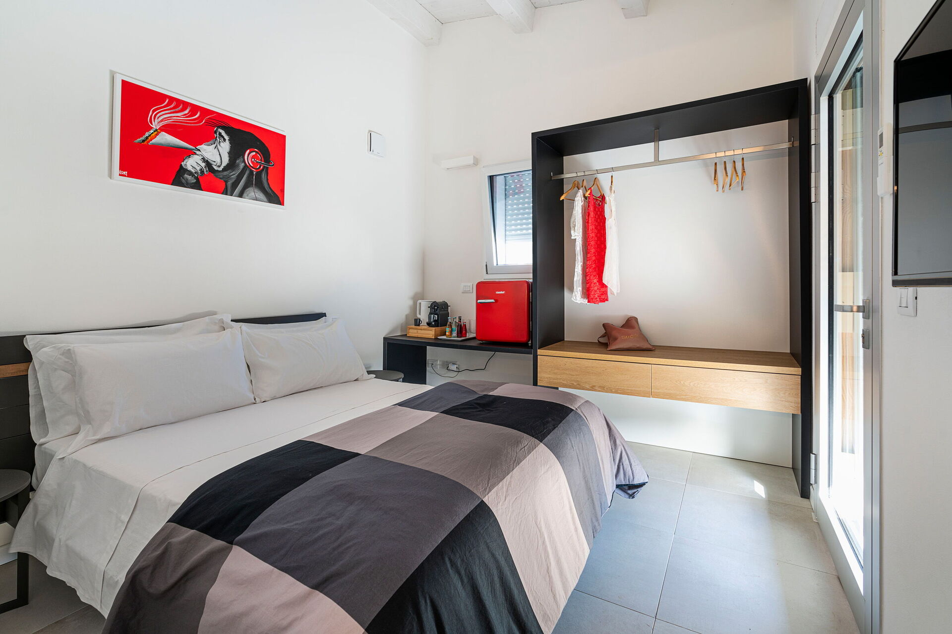 Rez-de-chaussée: chambre double (air conditionné, lit king-size, minibar, TV, moustiquaire), salle de bain avec douche.