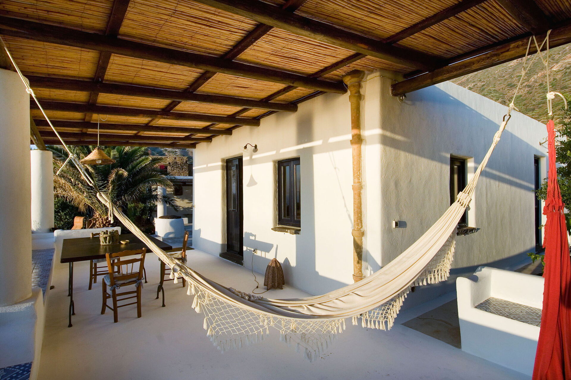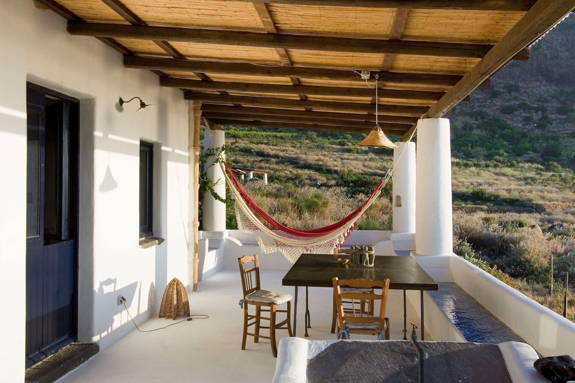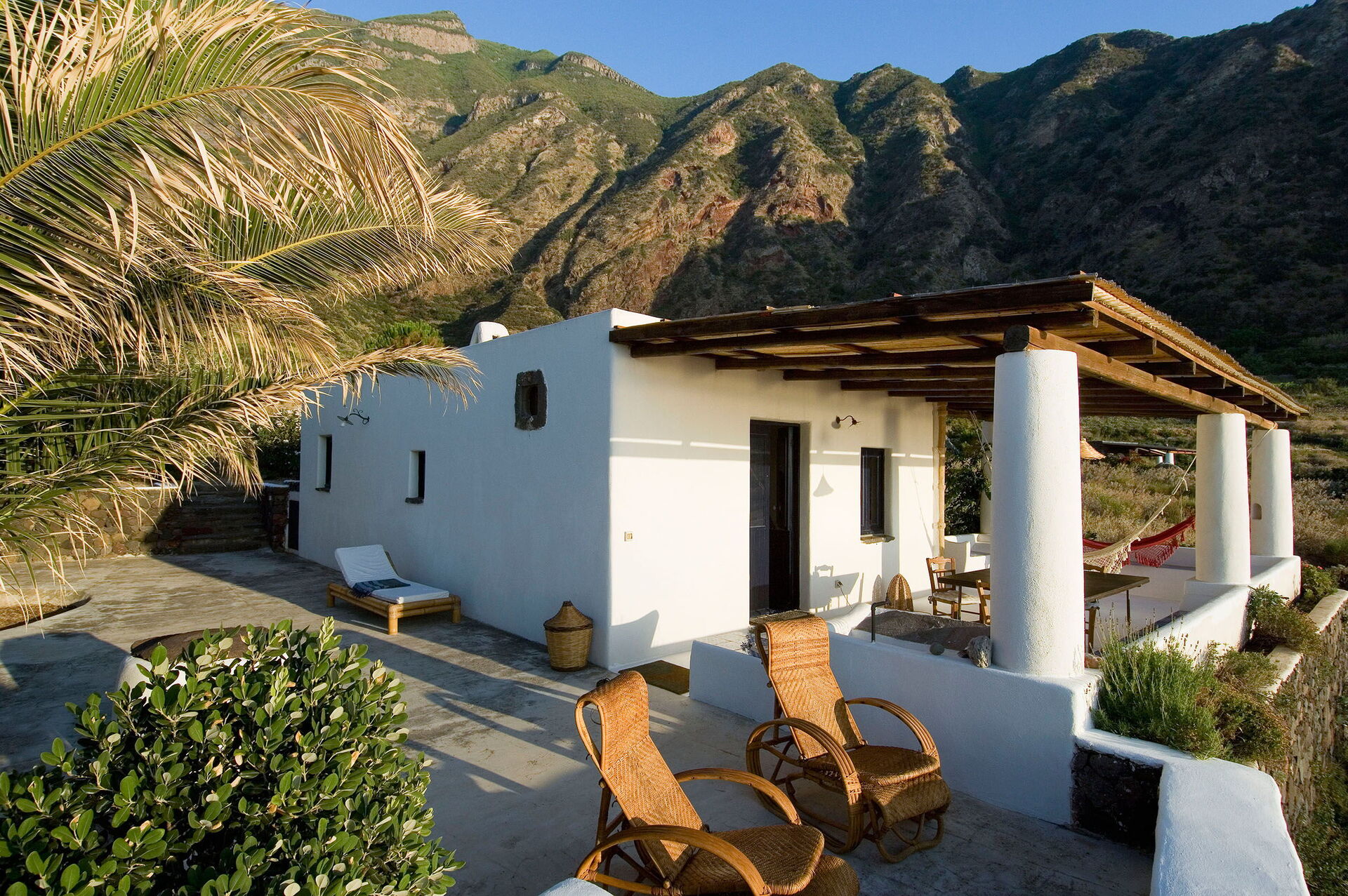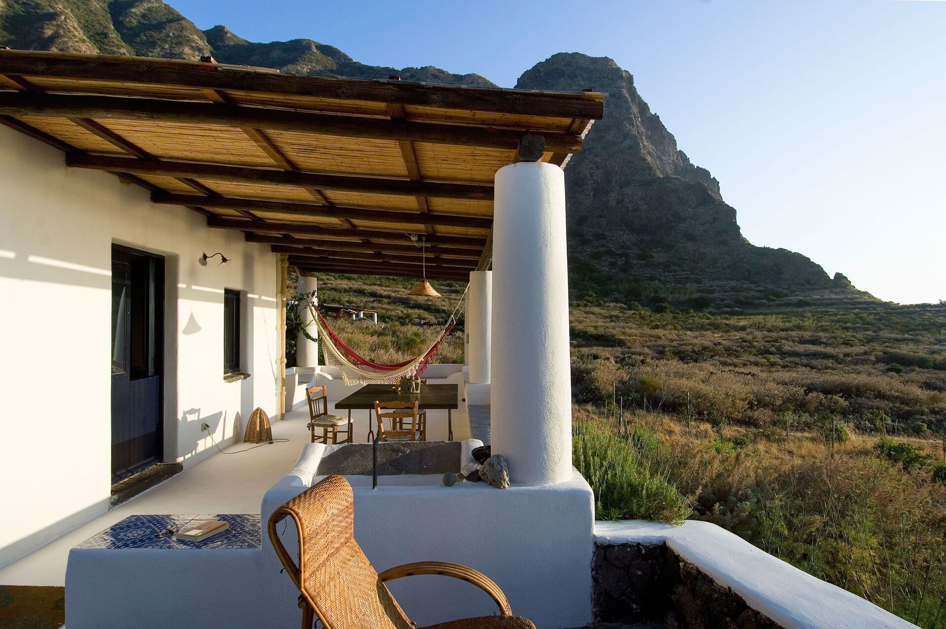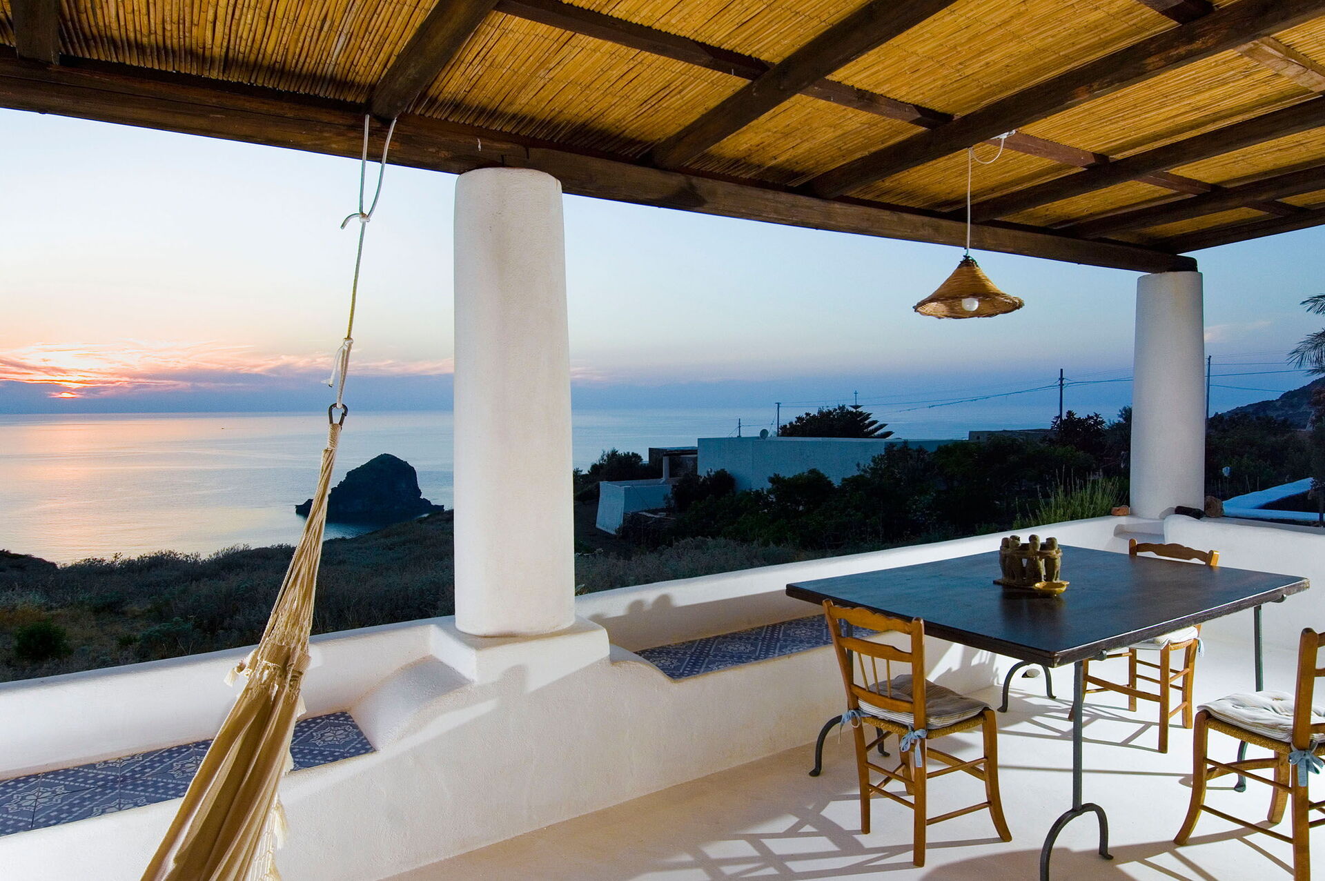 Un espace pour les repas en extérieur situé sous le porche de la maison est le point fort de la propriété: vous pourrez vous y détendre et y manger tout en profitant d’une fantastique vue panoramique sur la mer à couper le souffle, avec les îles d’Alicudi et de Filicudi se détachant à l’horizon. Sous le porche se trouvent également deux hamacs. Les grands espaces utilisés comme solariums font de cette villa l’endroit idéal pour se détendre entre amis et en famille sous le chaud soleil de la Sicile.