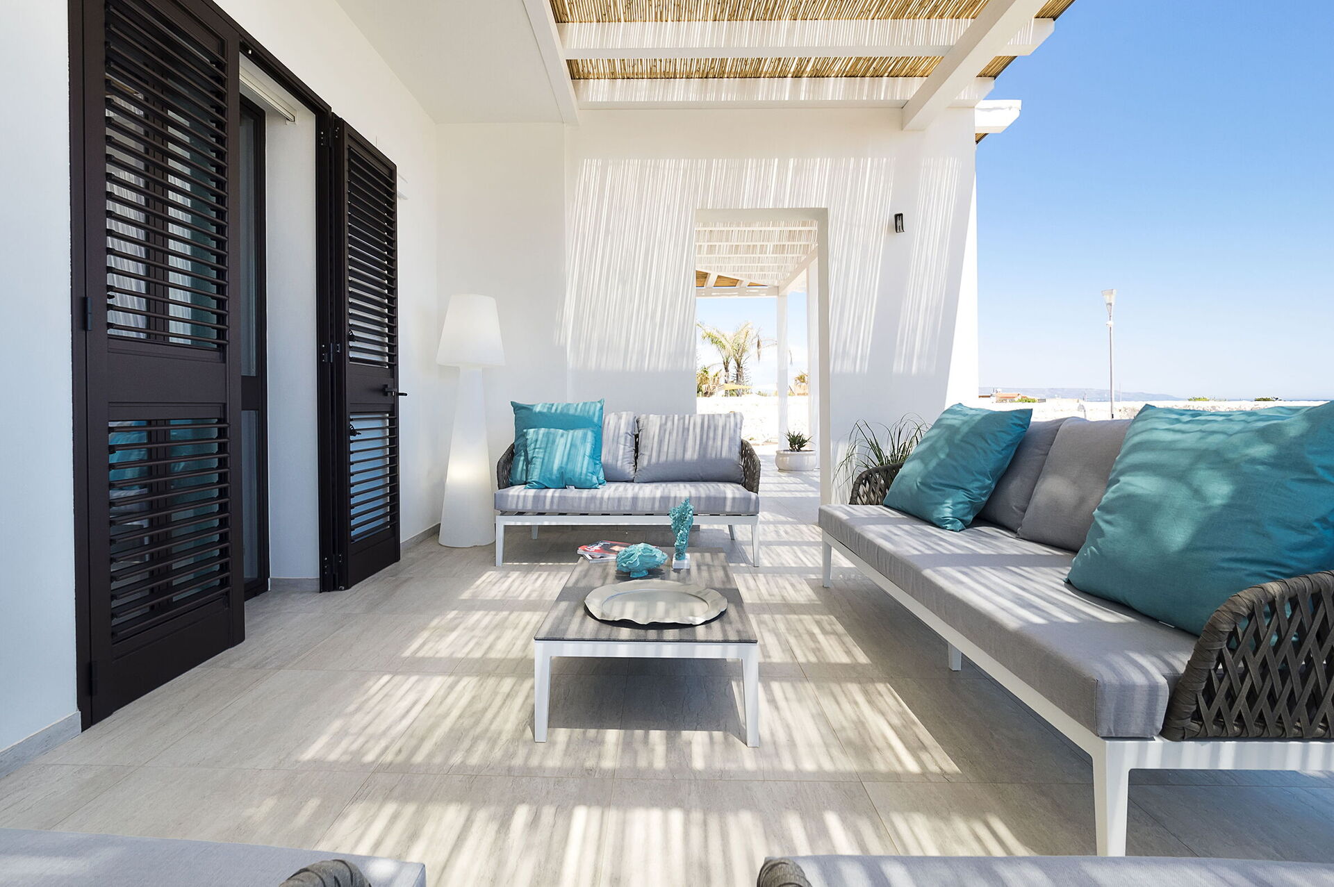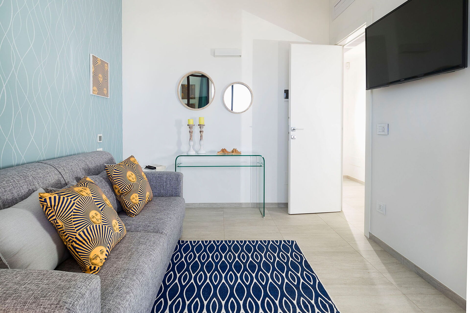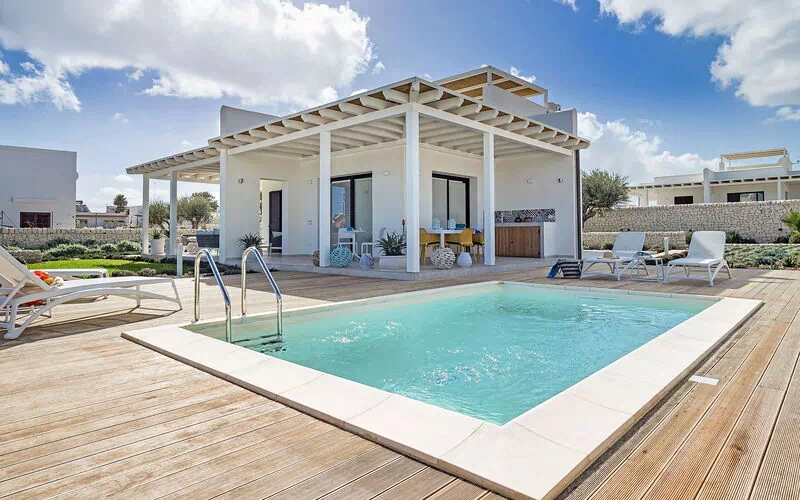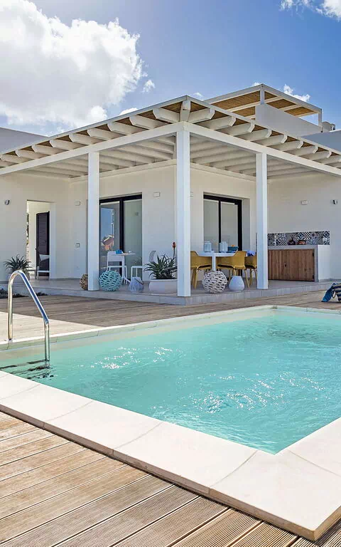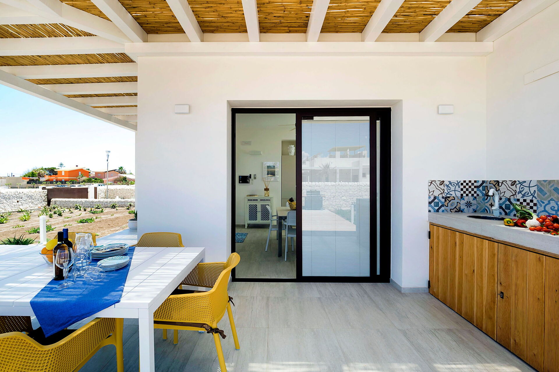 La villa à louer peut accueillir jusqu'à 6 personnes grâce à 2 chambres et un canapé-lit double, des intérieurs équipés de tout le confort et de nombreux espaces communs.