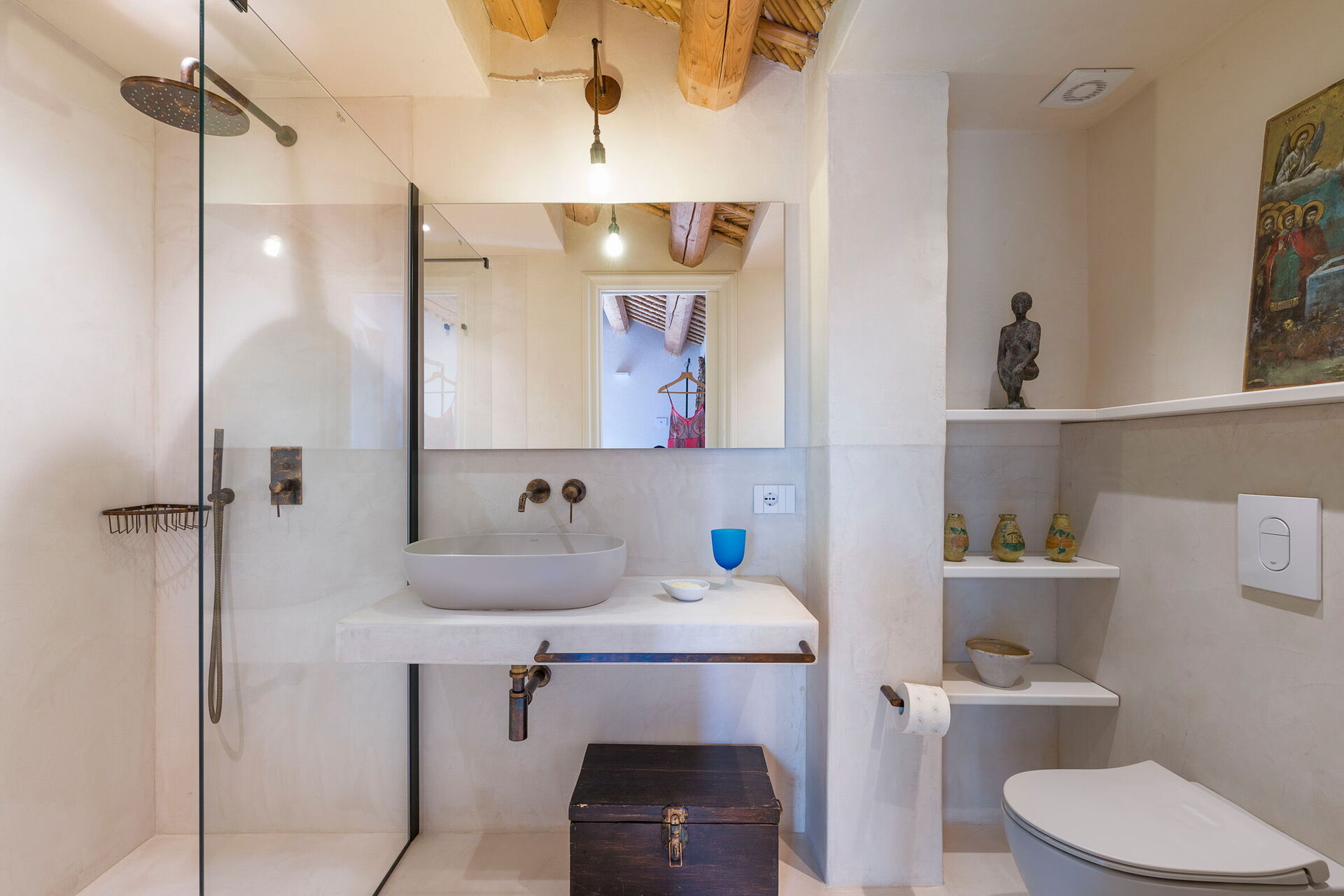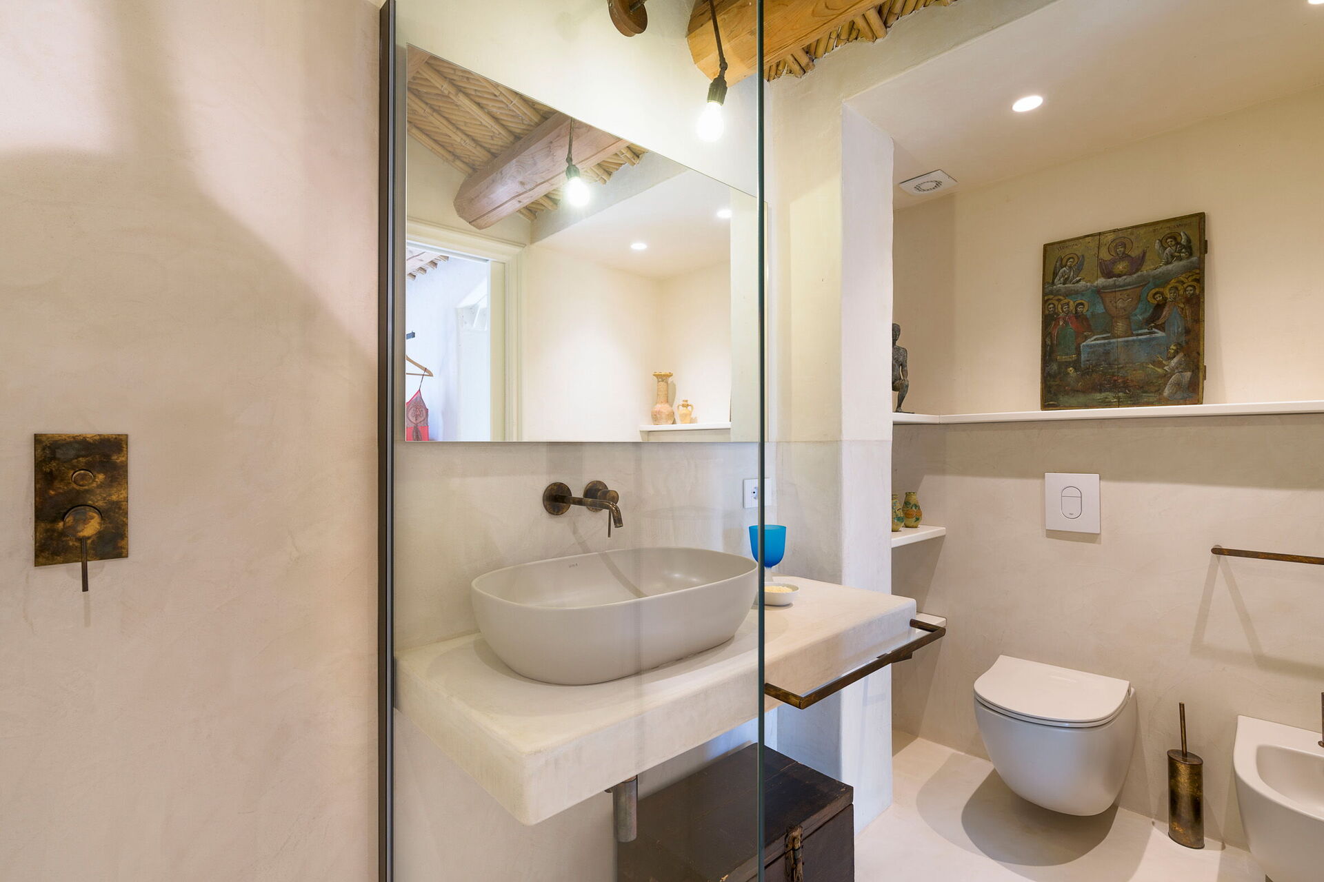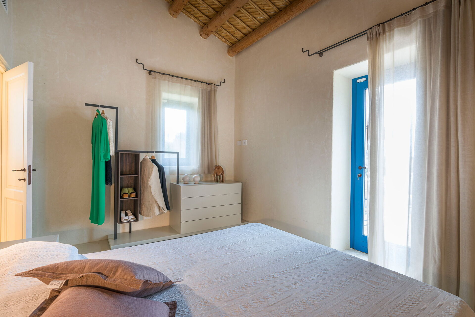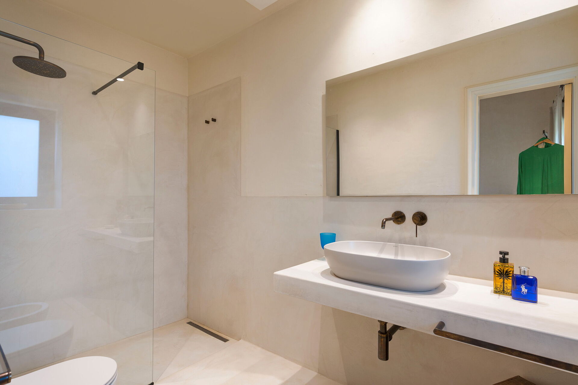 Rez-de-chaussée: cuisine (plaque de cuisson, four, congélateur, réfrigérateur, lave-vaisselle, cafetière, grille-pain), salle à manger, salon panoramique (Smart-TV), 1 chambre double (air conditionné, lit king size) avec salle de bain privée avec douche, 2 chambres doubles (air conditionné) chacune avec salle de bain privée avec douche.