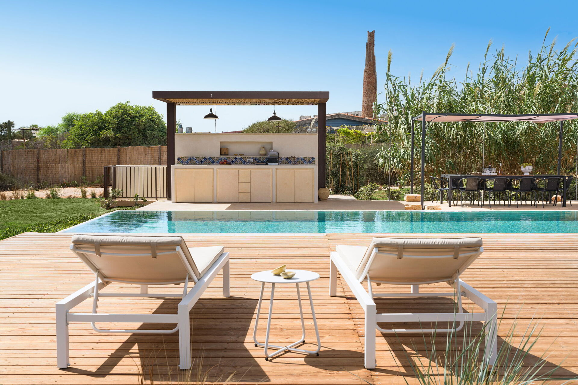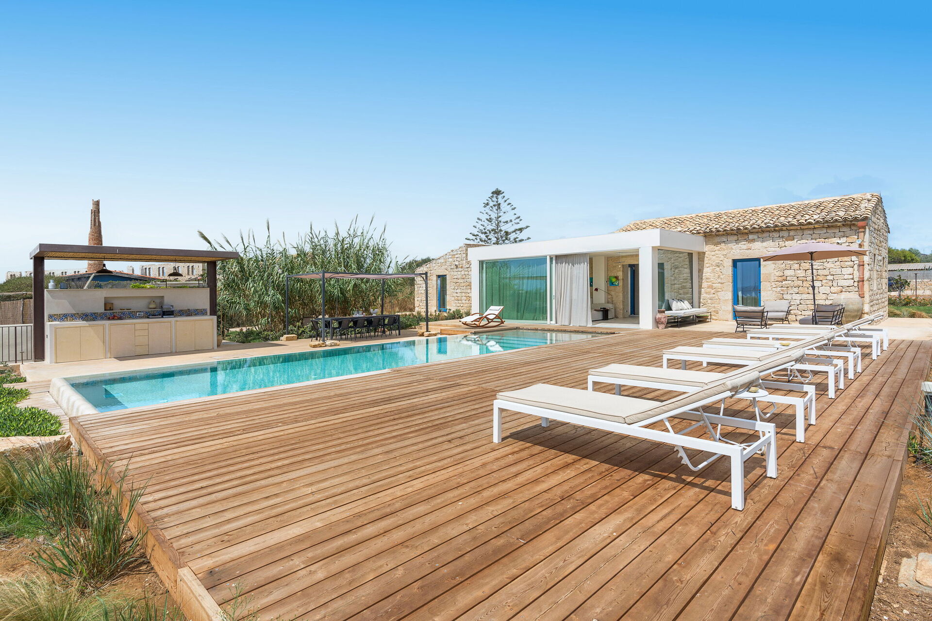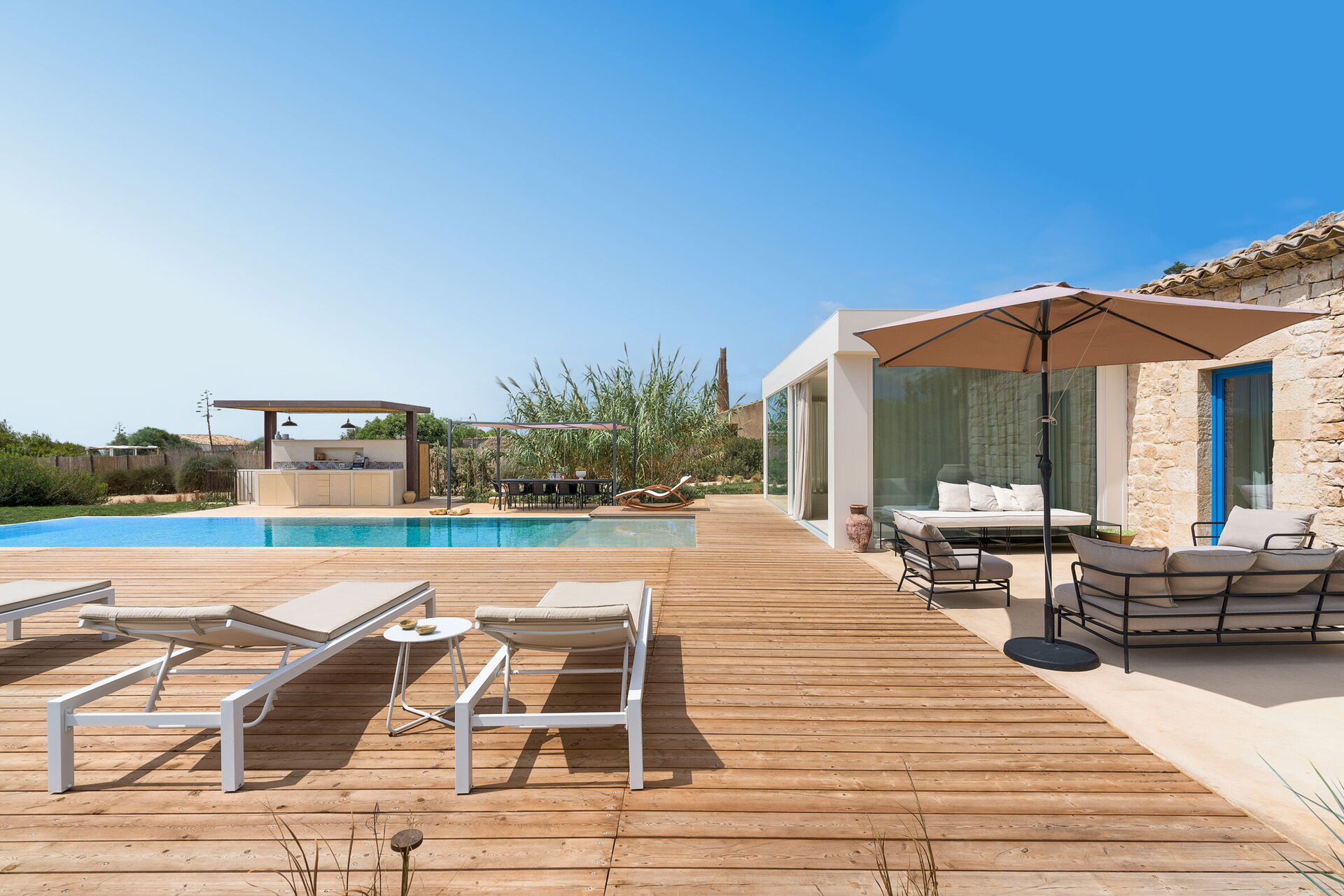 La propriété est entourée d'un grand jardin et dispose d’un grand solarium ainsi que d'une piscine privée à l'usage exclusif des hôtes; également à l'extérieur, la villa dispose d’un gazebo avec barbecue, de chaises et de tables pour les repas en plein air afin de garantir des moments de détente qui rendront vos vacances en Sicile uniques.