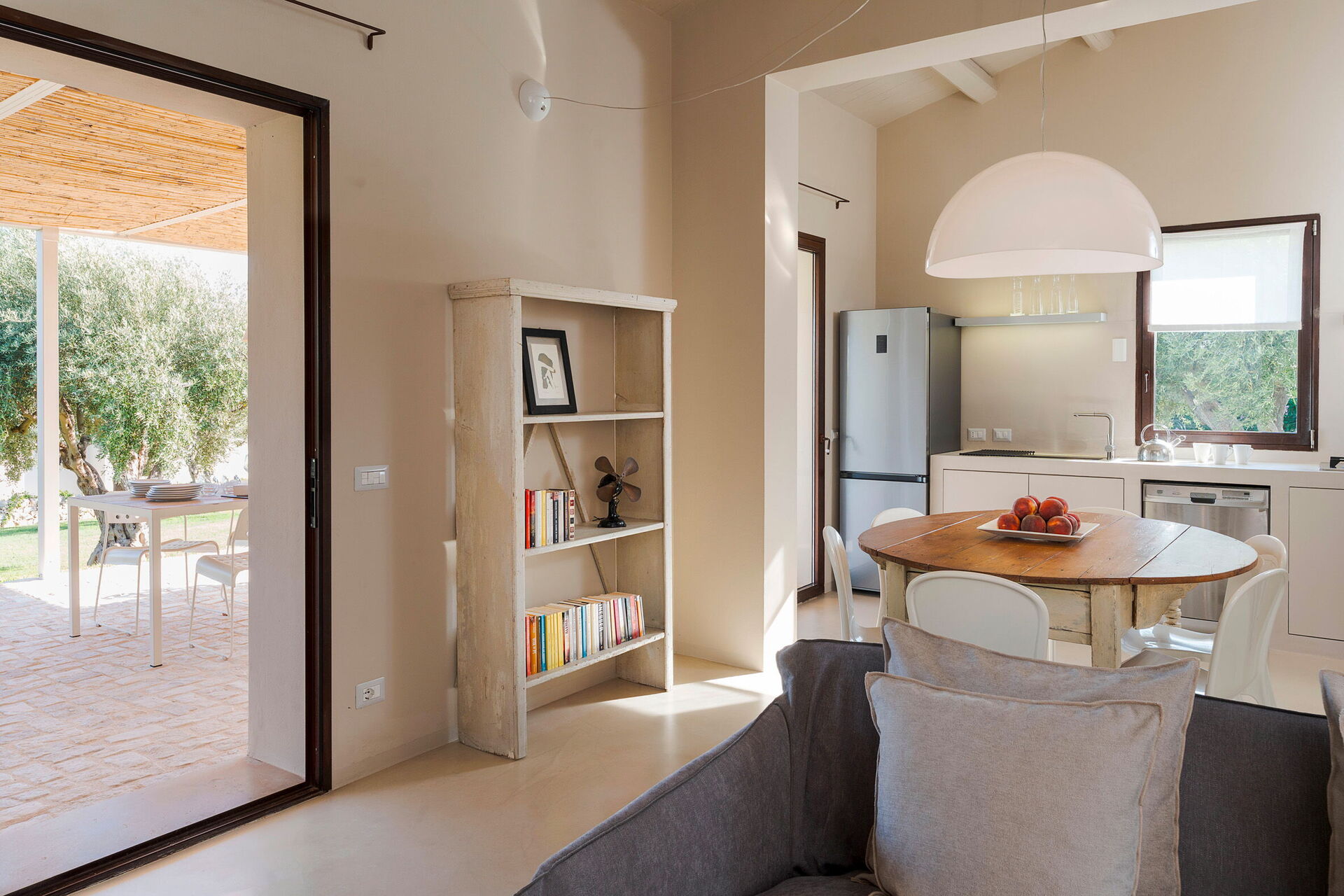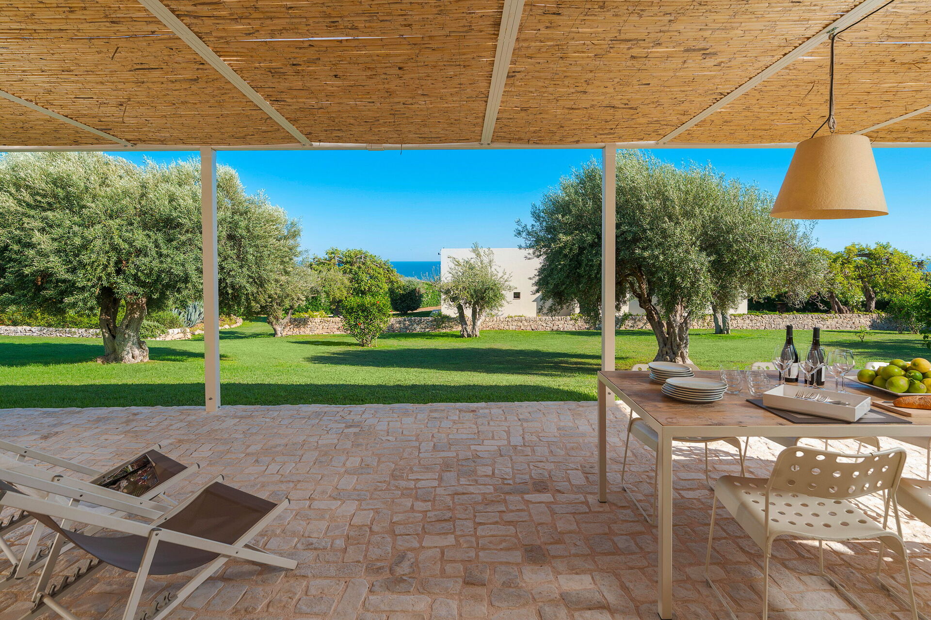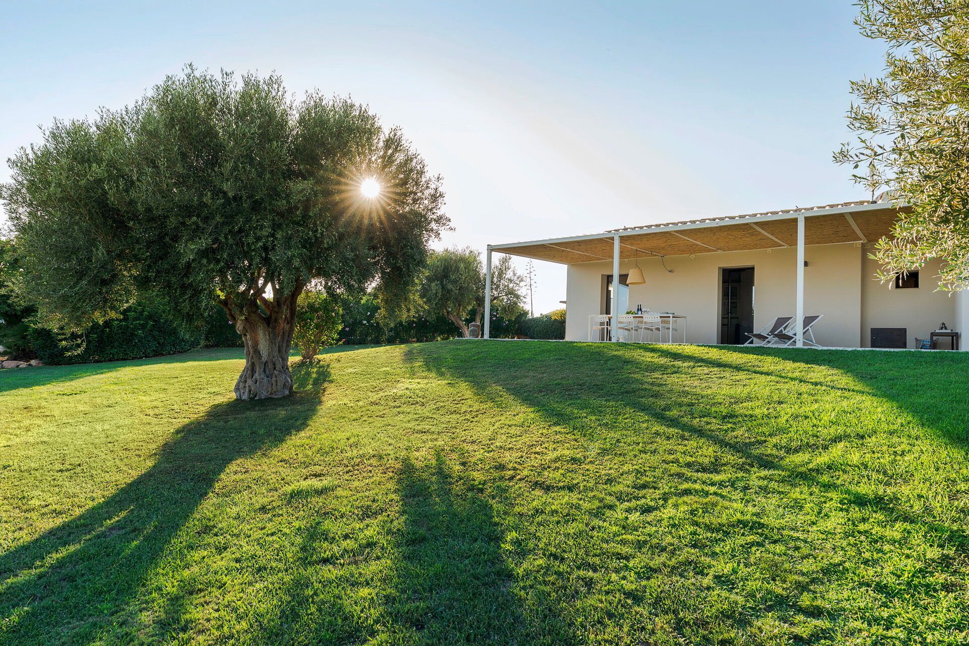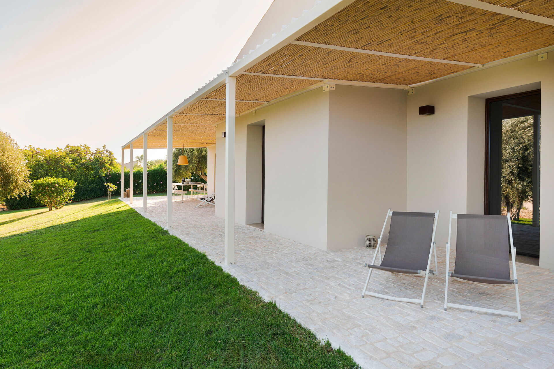 Extérieur : terrasse ombragée, jardin, piscine (en commun pour les trois villas).